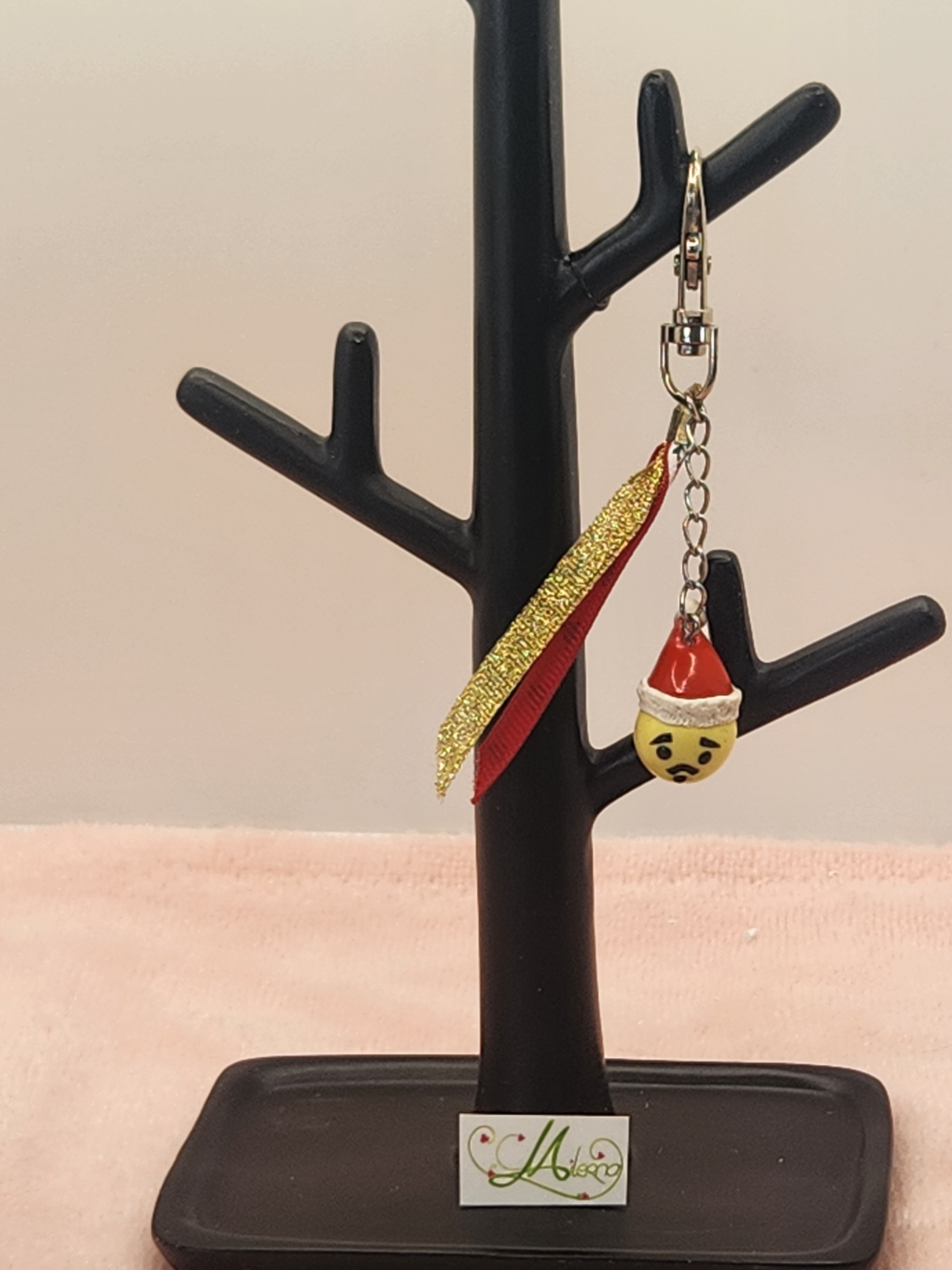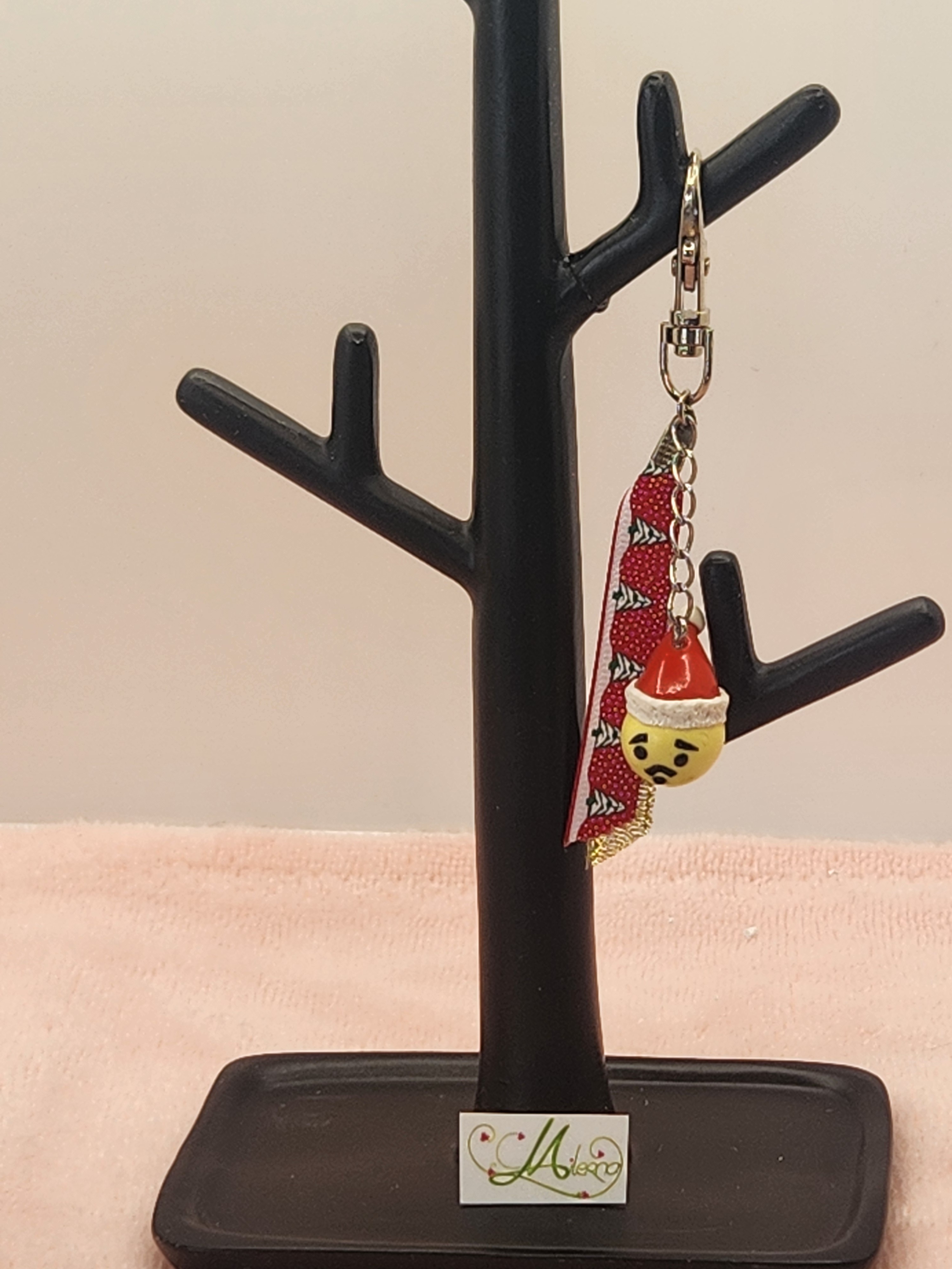 Je vous propose ce porte clefs smiley émoticone avec son bonnet de Noël en polymère, avec 2 rubans.