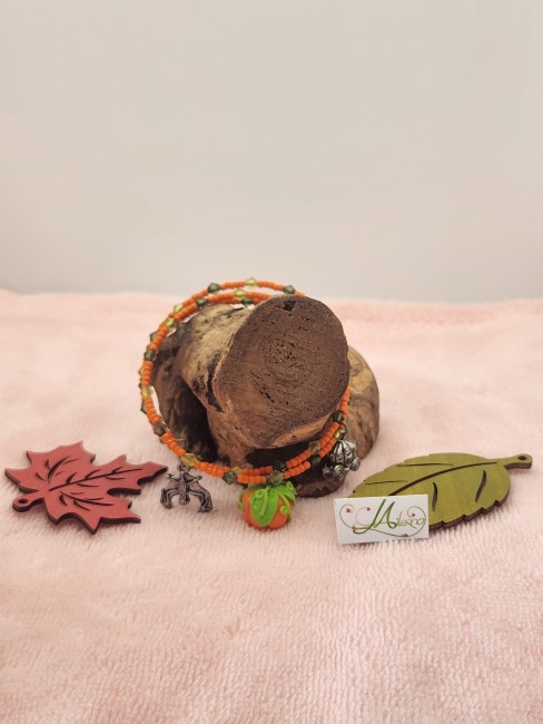 Il se compose de perles de rocailles dans les tons d'orange et vert, une citrouille réalisée par mes soins en polymère.
