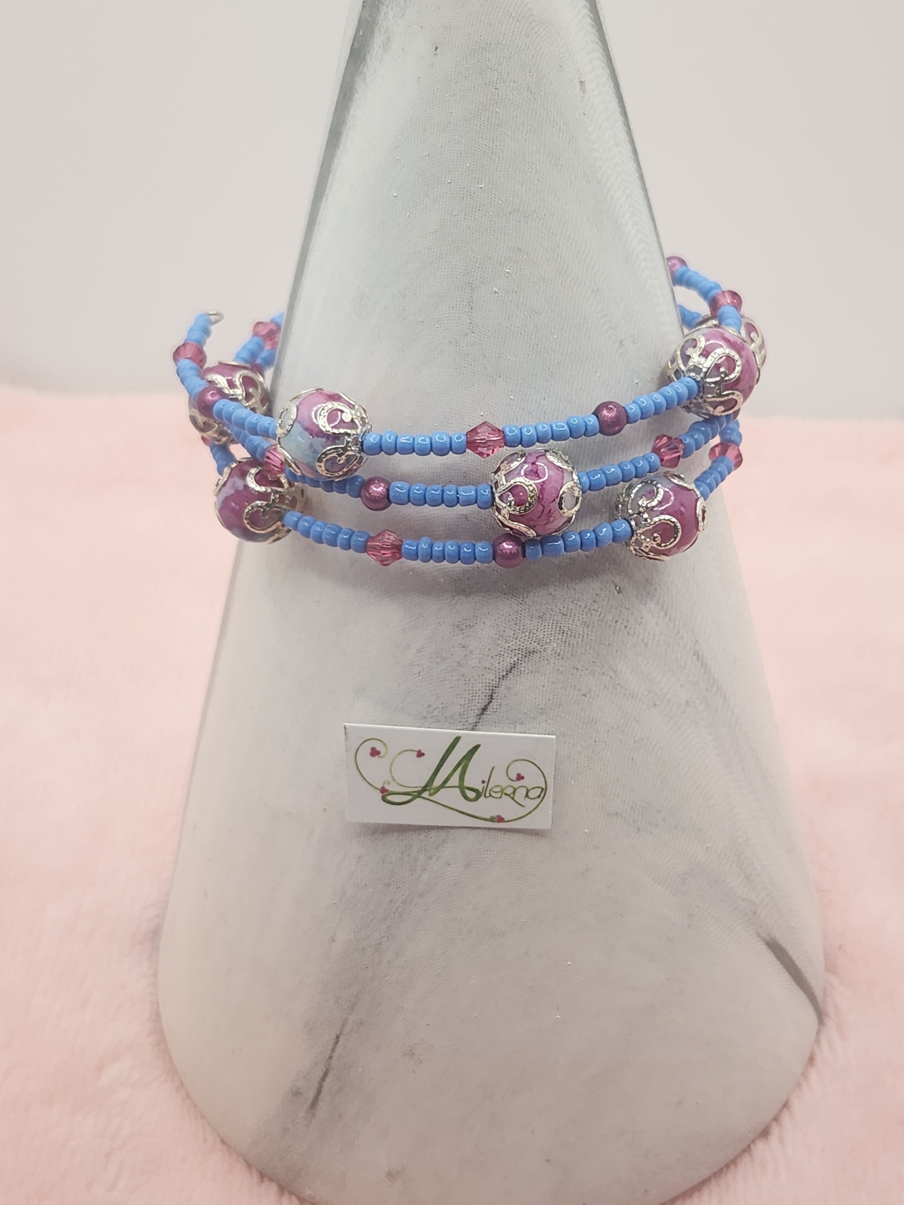 Il se compose de perles de rocaille bleue, perles à facettes transparentes rose, perles rondes de violet, et des perles à motifs dans les tons de bleu, rose et violet.