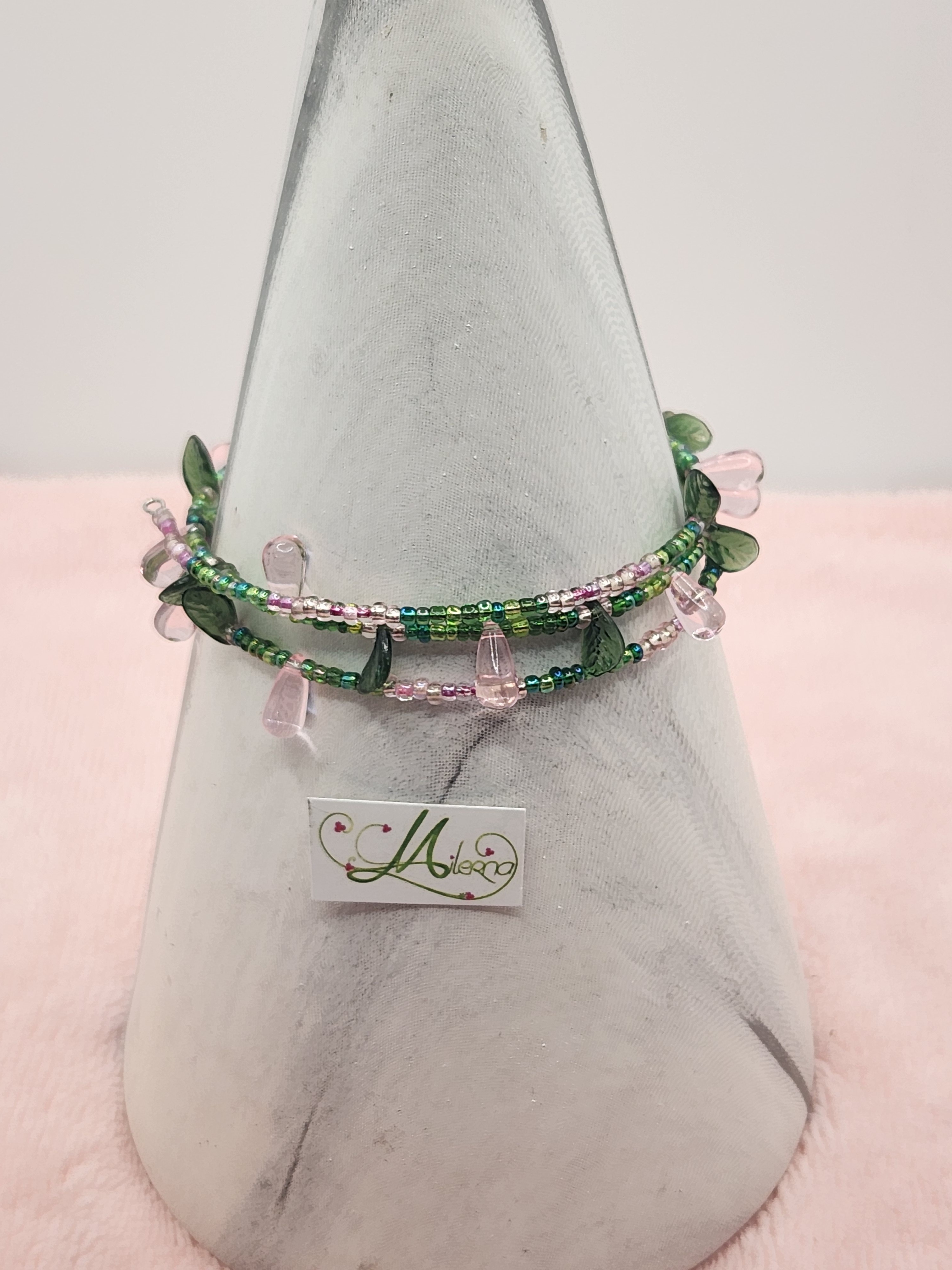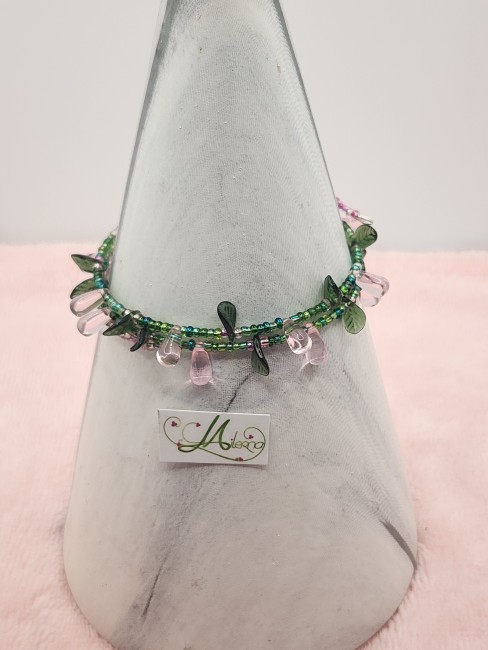 Il se compose de perles de rocaille rose et vert, perles gouttes rose, perles feuilles verte.