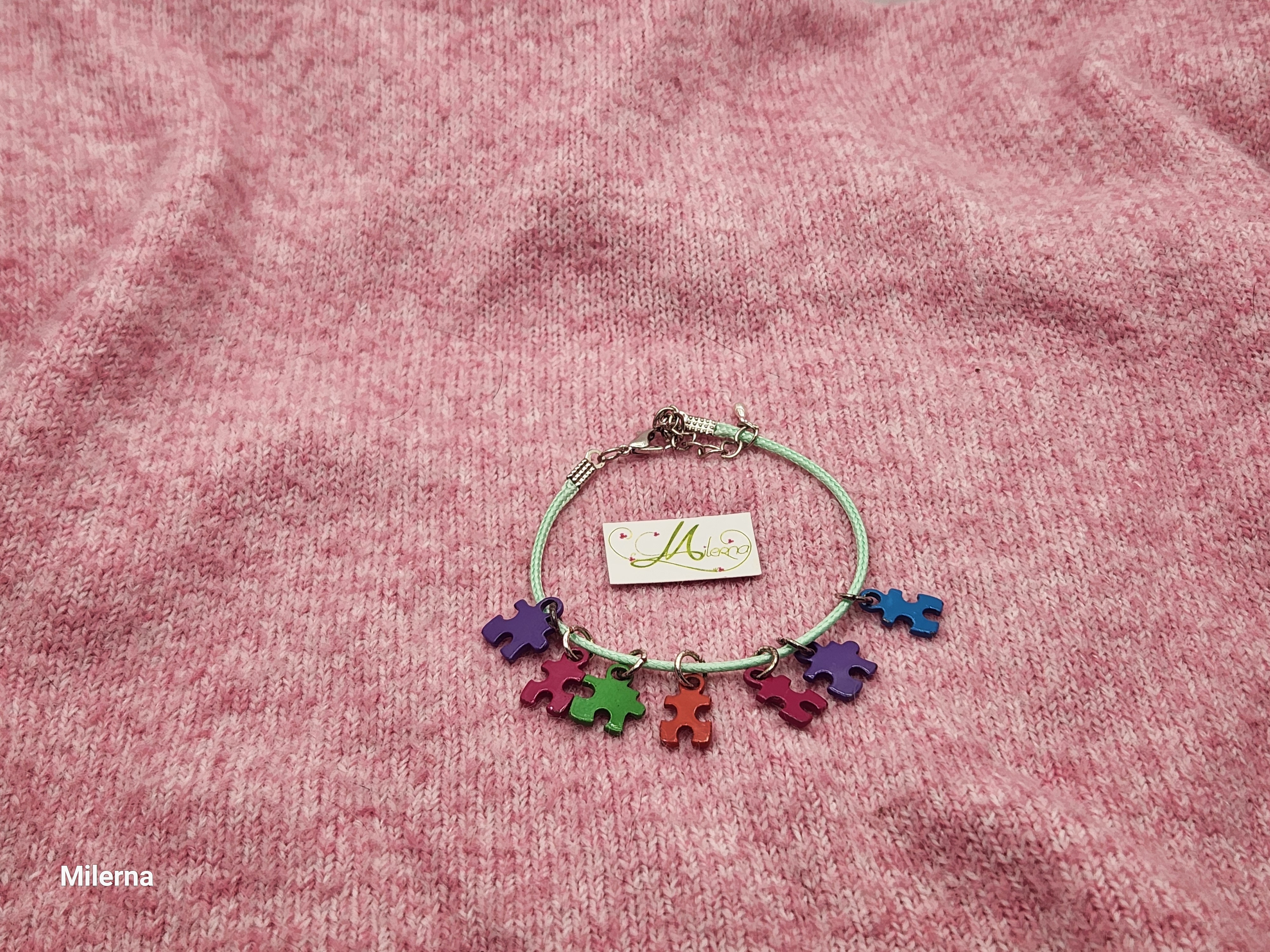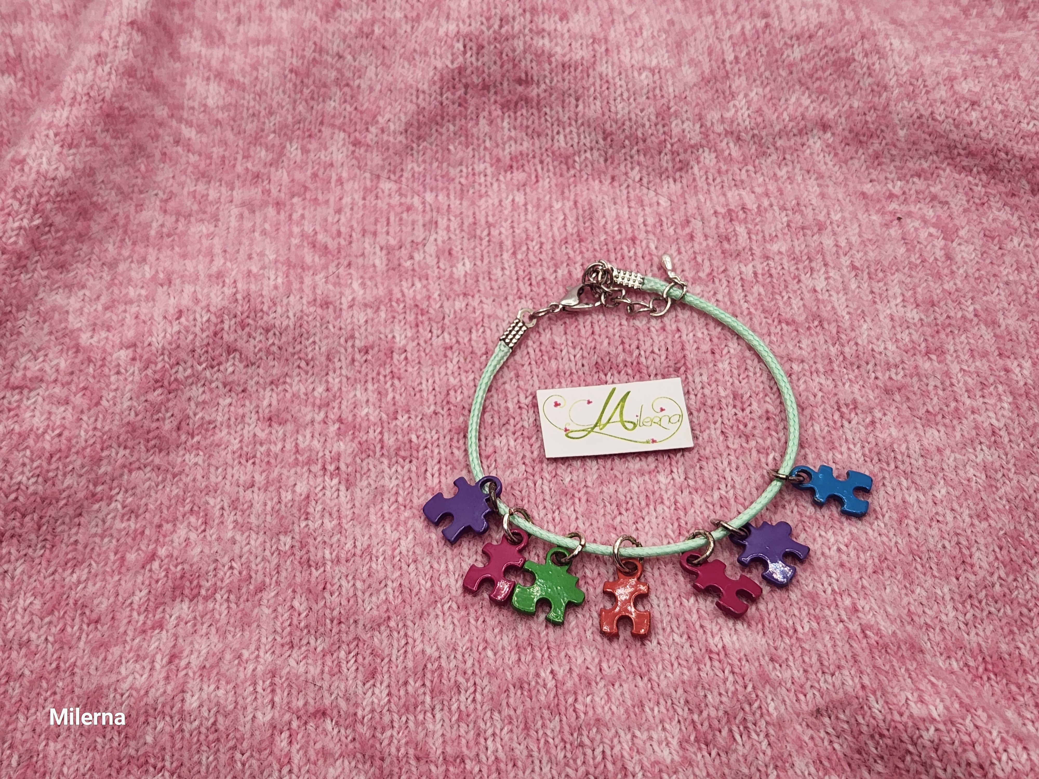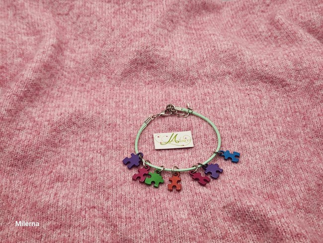 Je vous propose ce bracelet composé de 7 pièces de puzzle en métal argenté coloré.