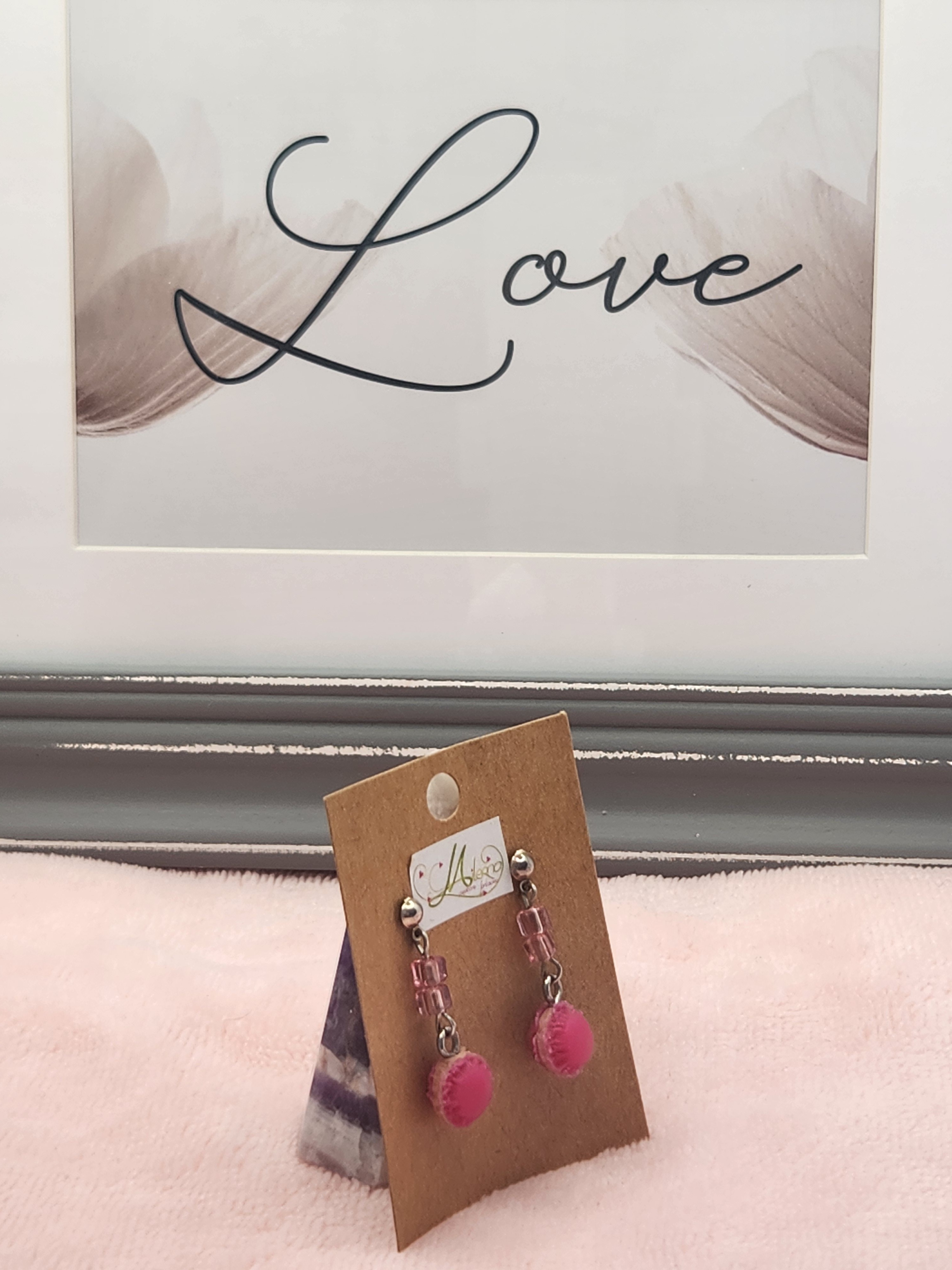 Boucles d'oreilles macaron en polymère, avec deux perles rose carrée.