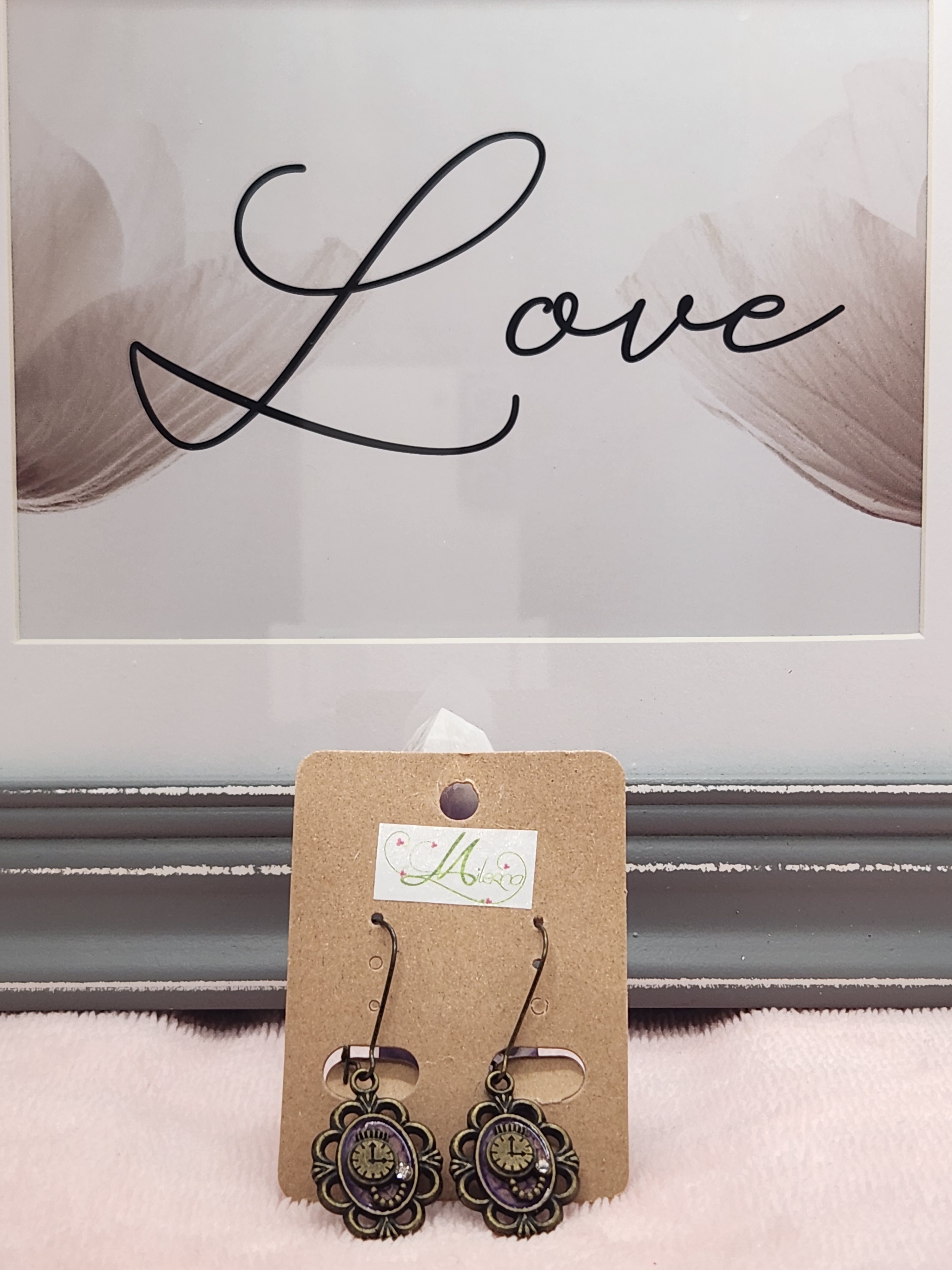 Boucles d'oreilles cabochon sur fond violet, breloque horloge.
