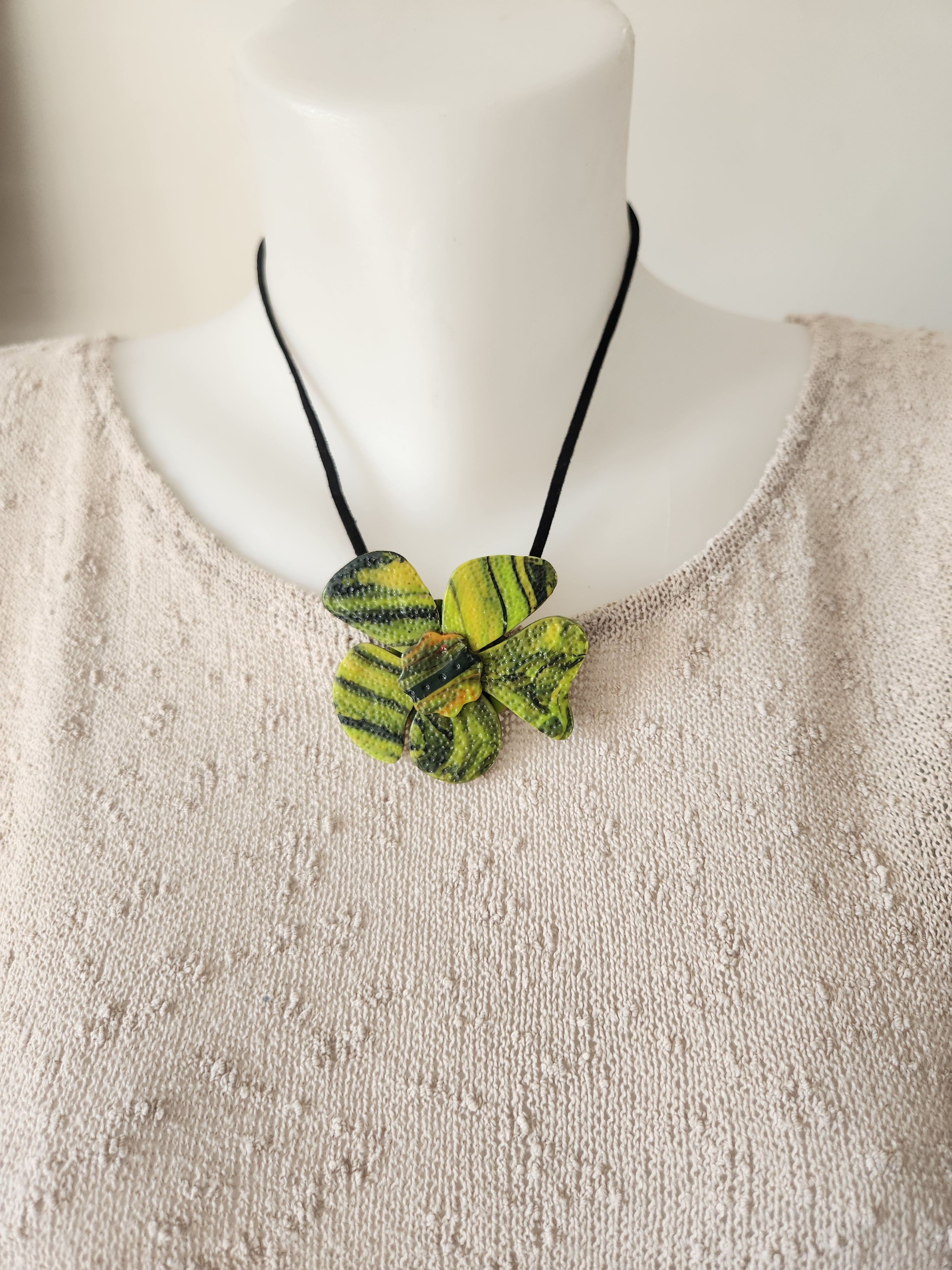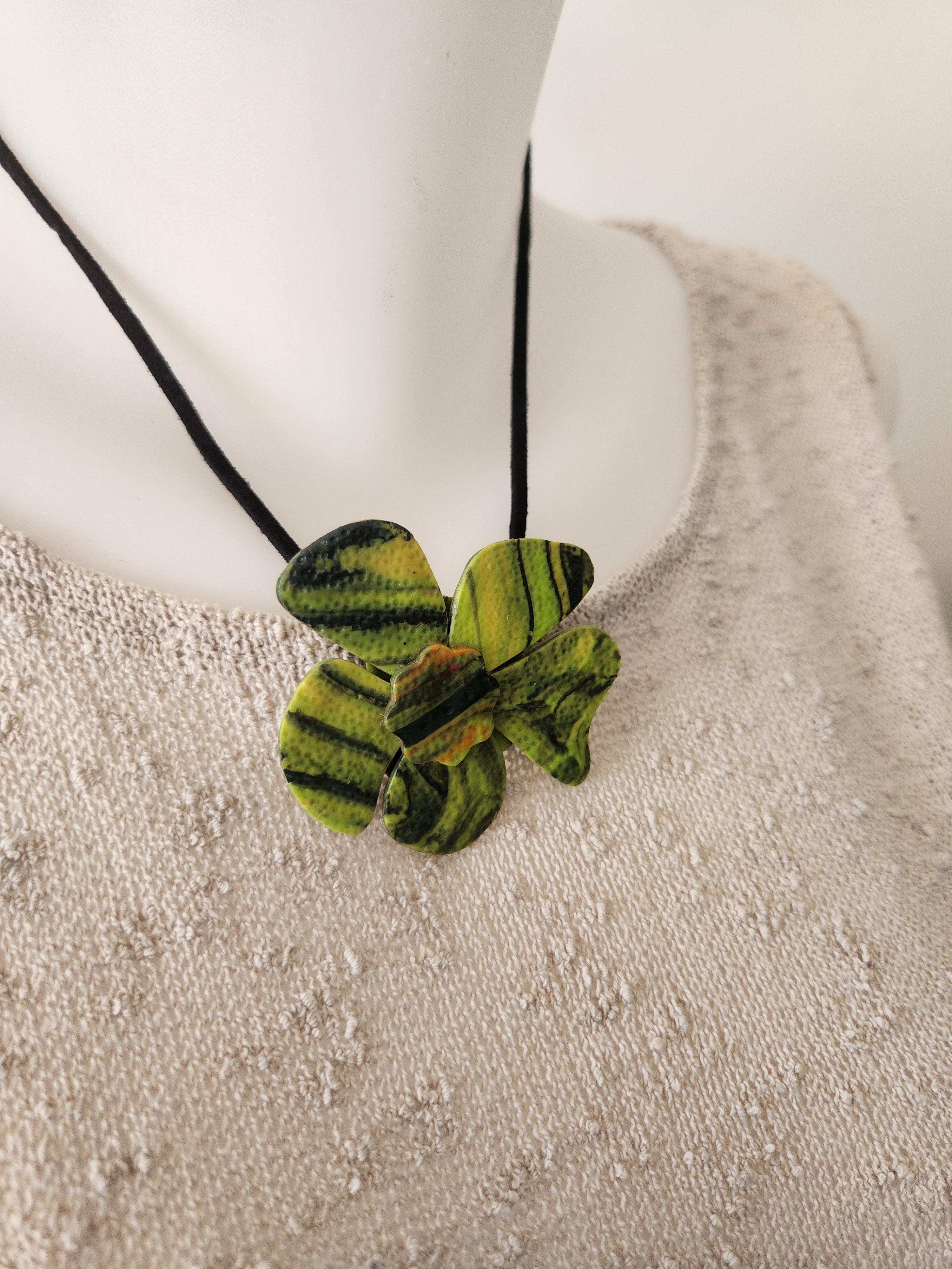 Je vous propose ce pendentif fleur, dans les tons de vert et marron en polymère.