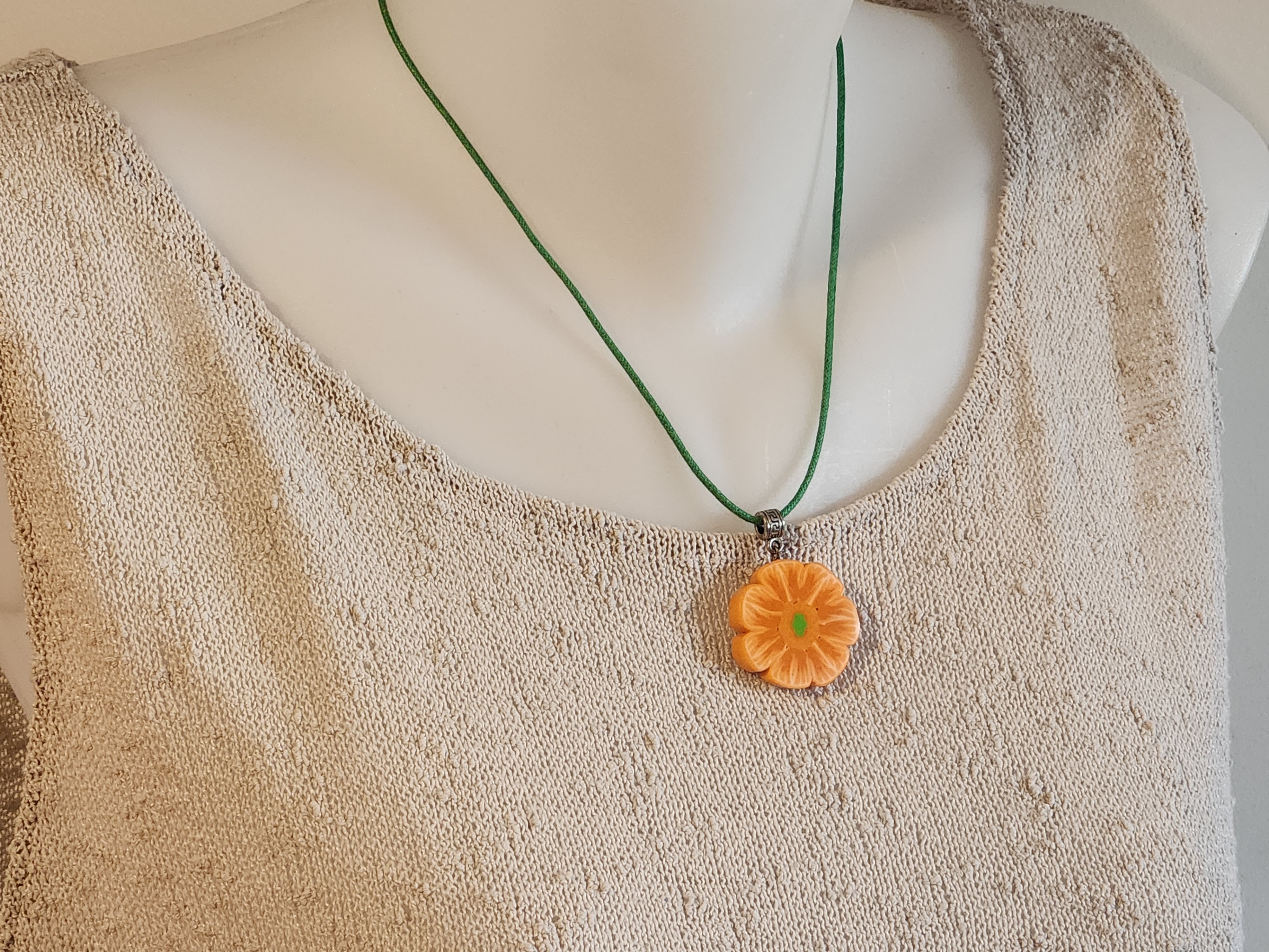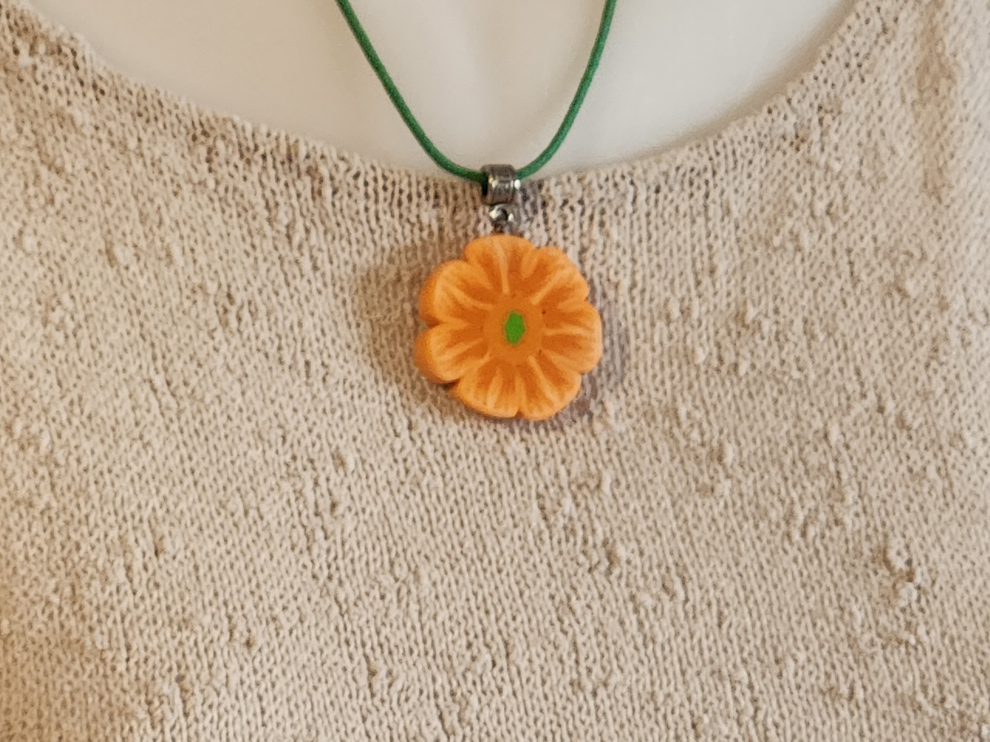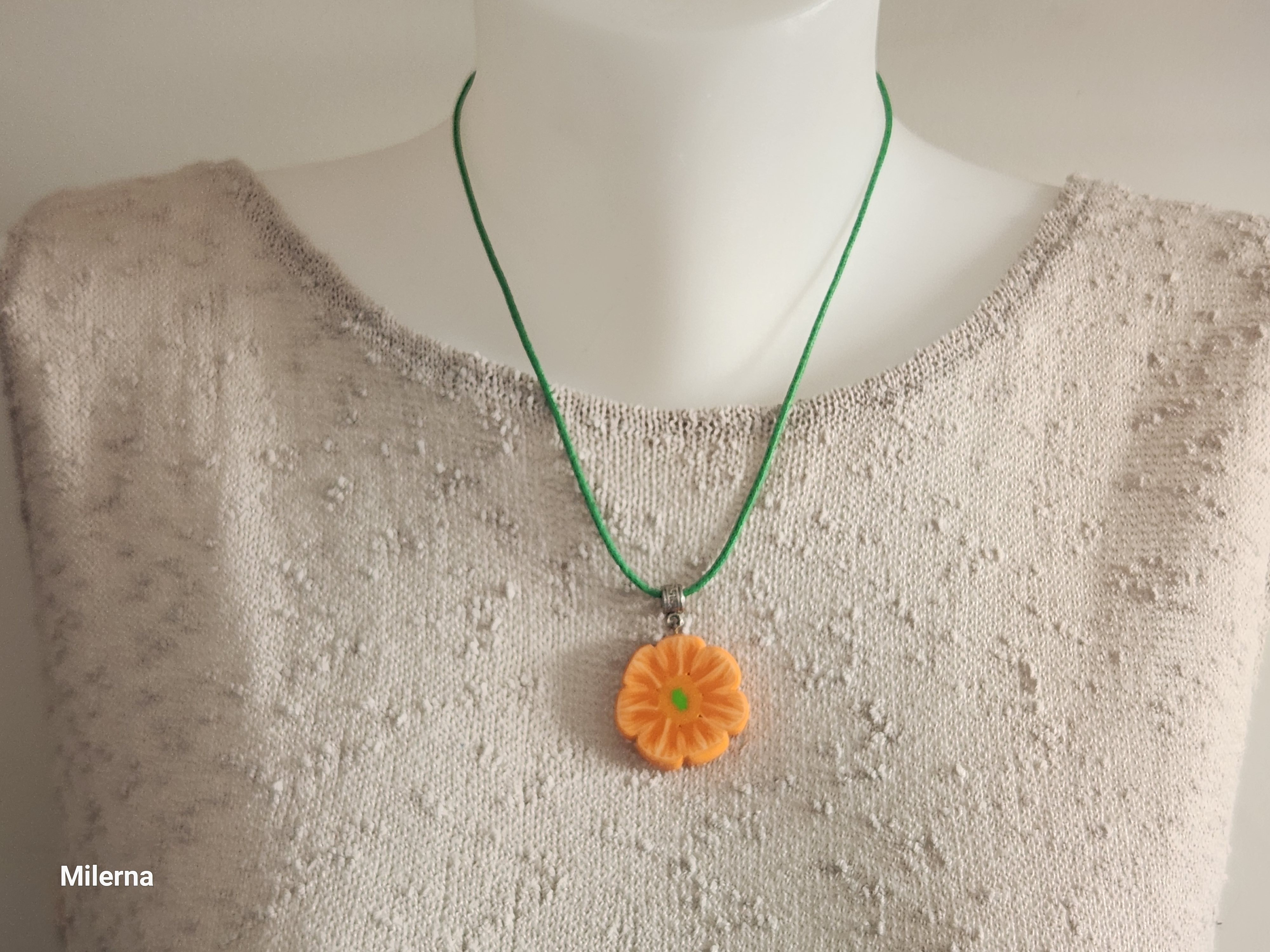 Je vous propose ce collier avec une fleur orange en polymère, monté sur tour de cou de couleur vert.