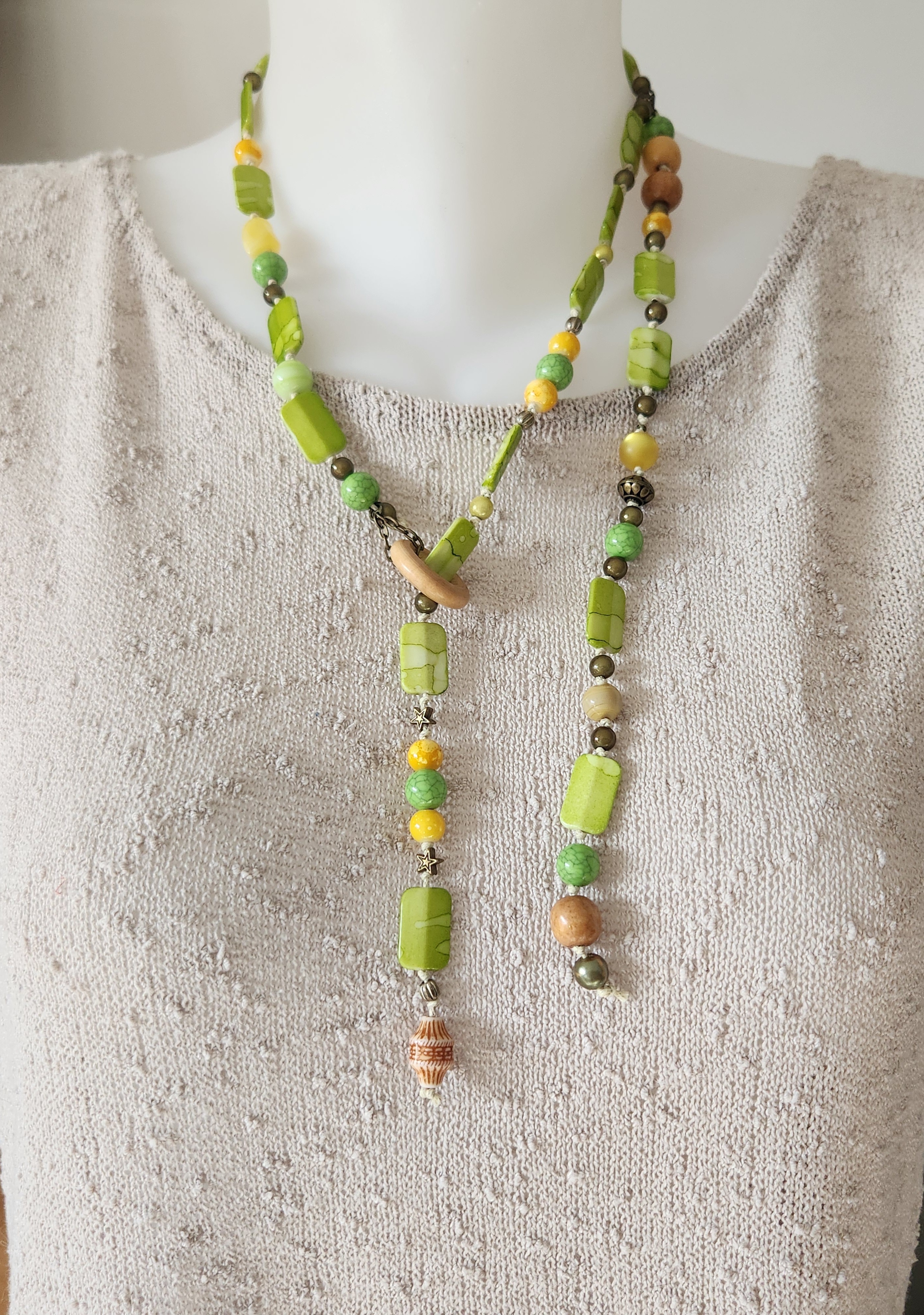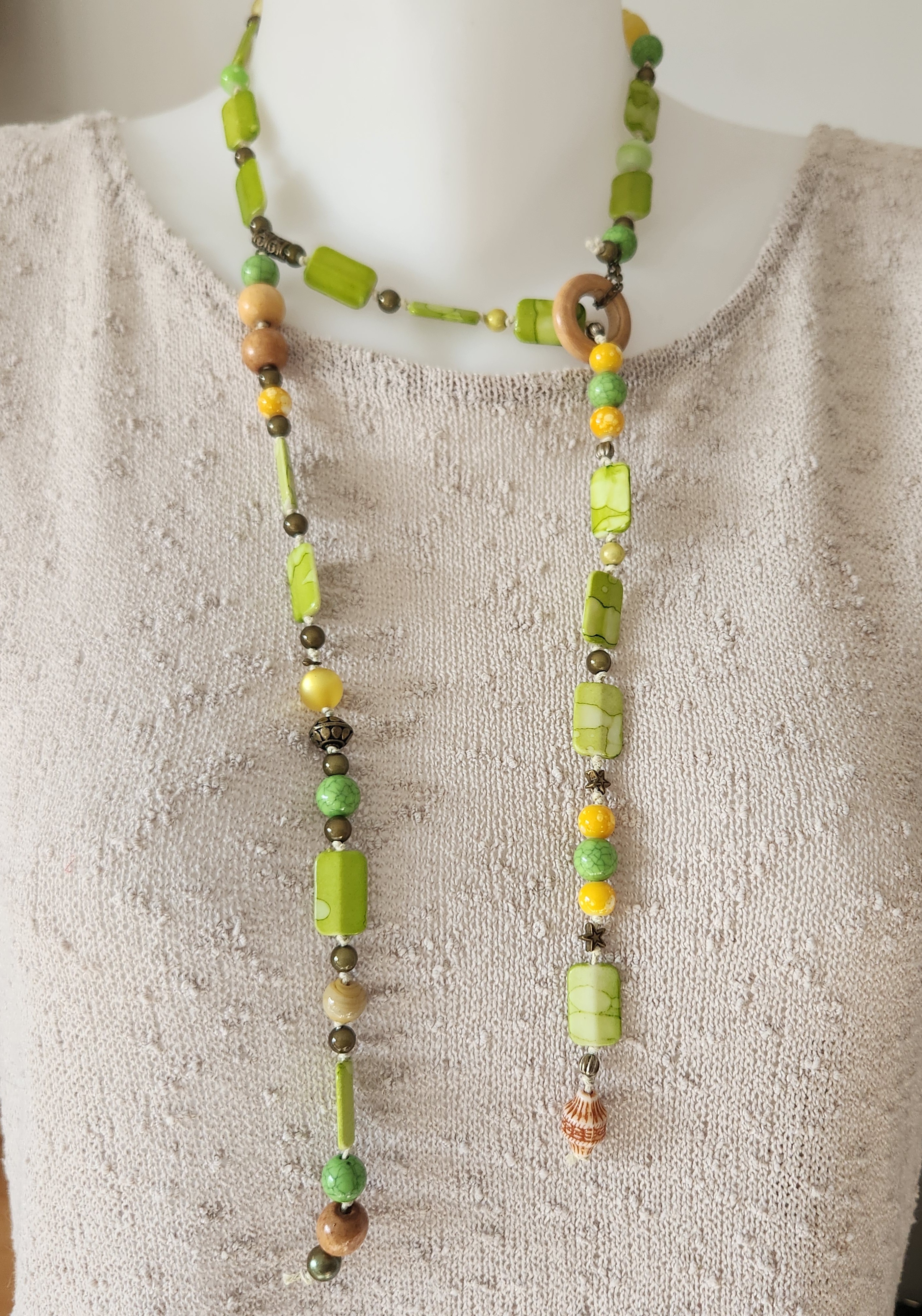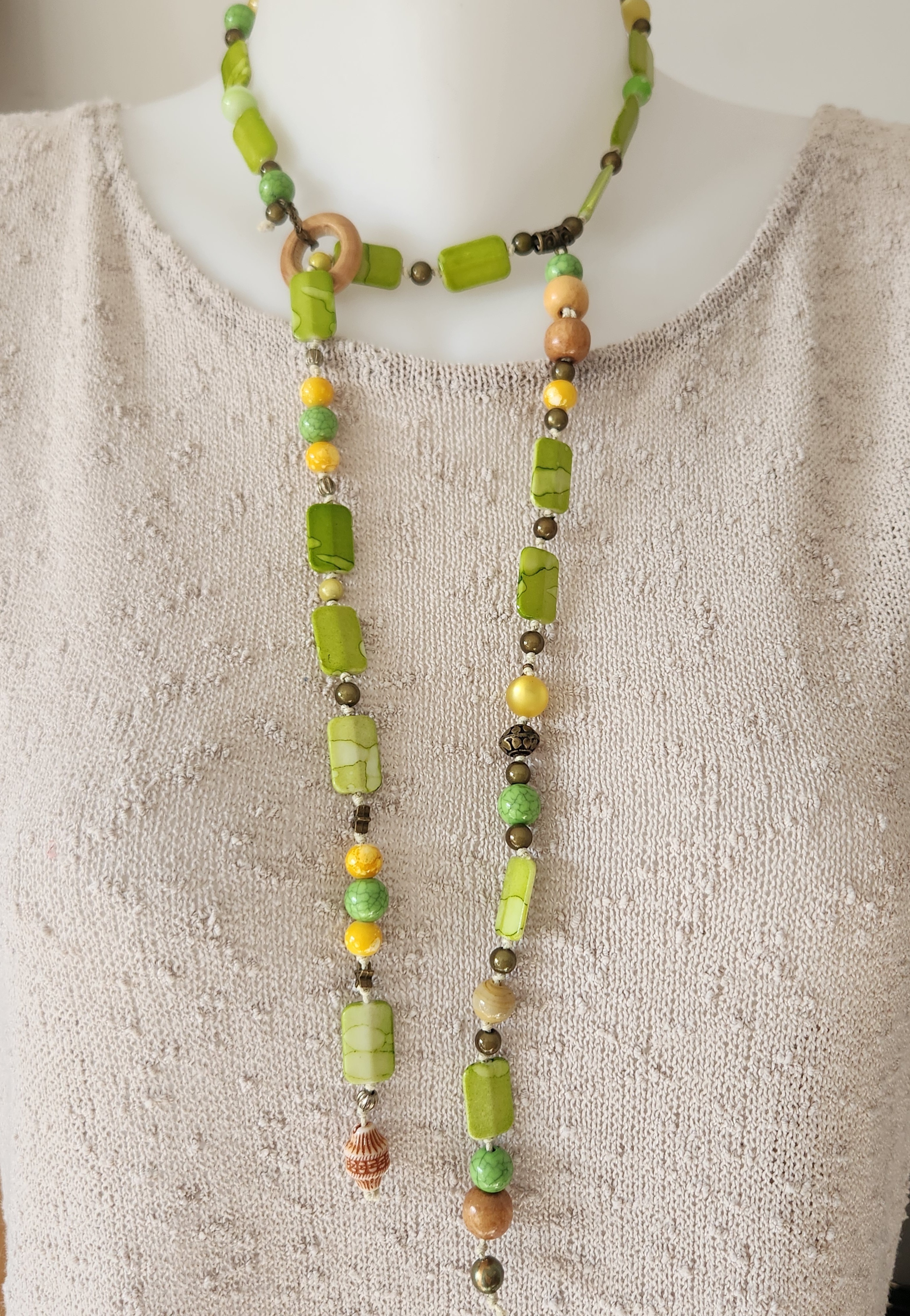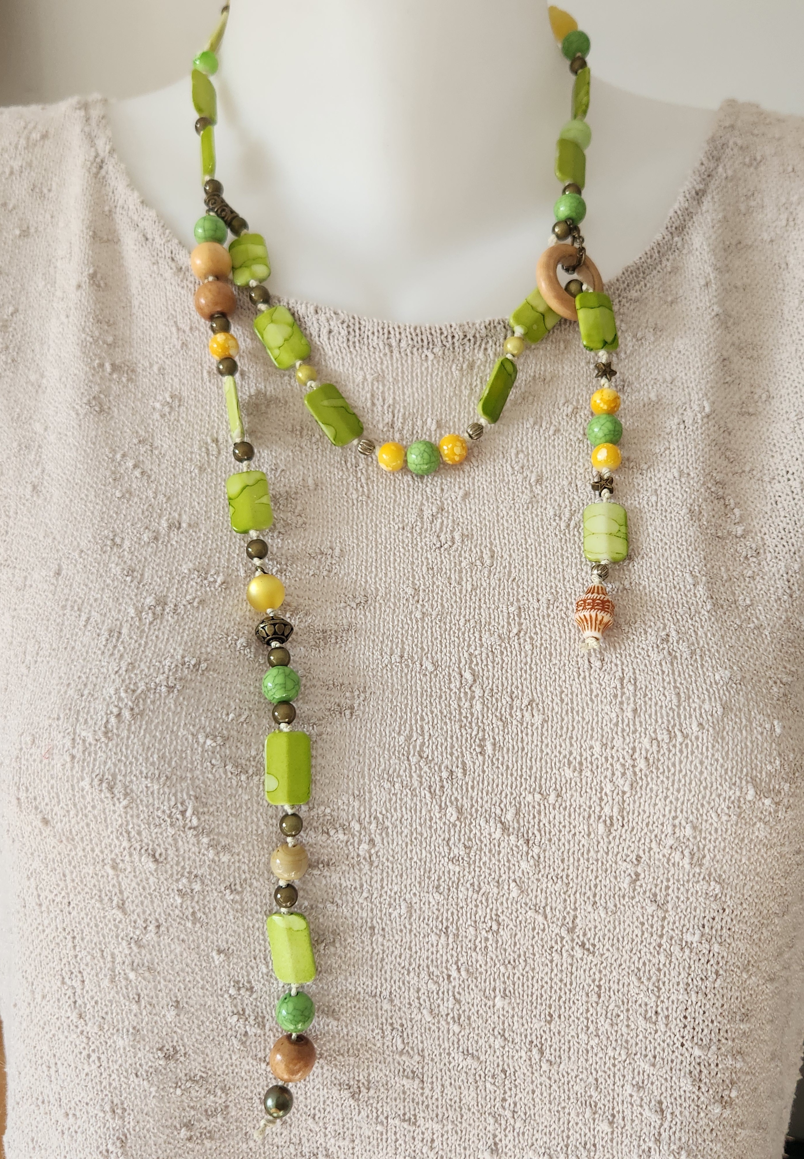 Je vous propose ce collier fantaisie dans les tons de vert et de jaune, perles à reflets, perles en bronze, bois.