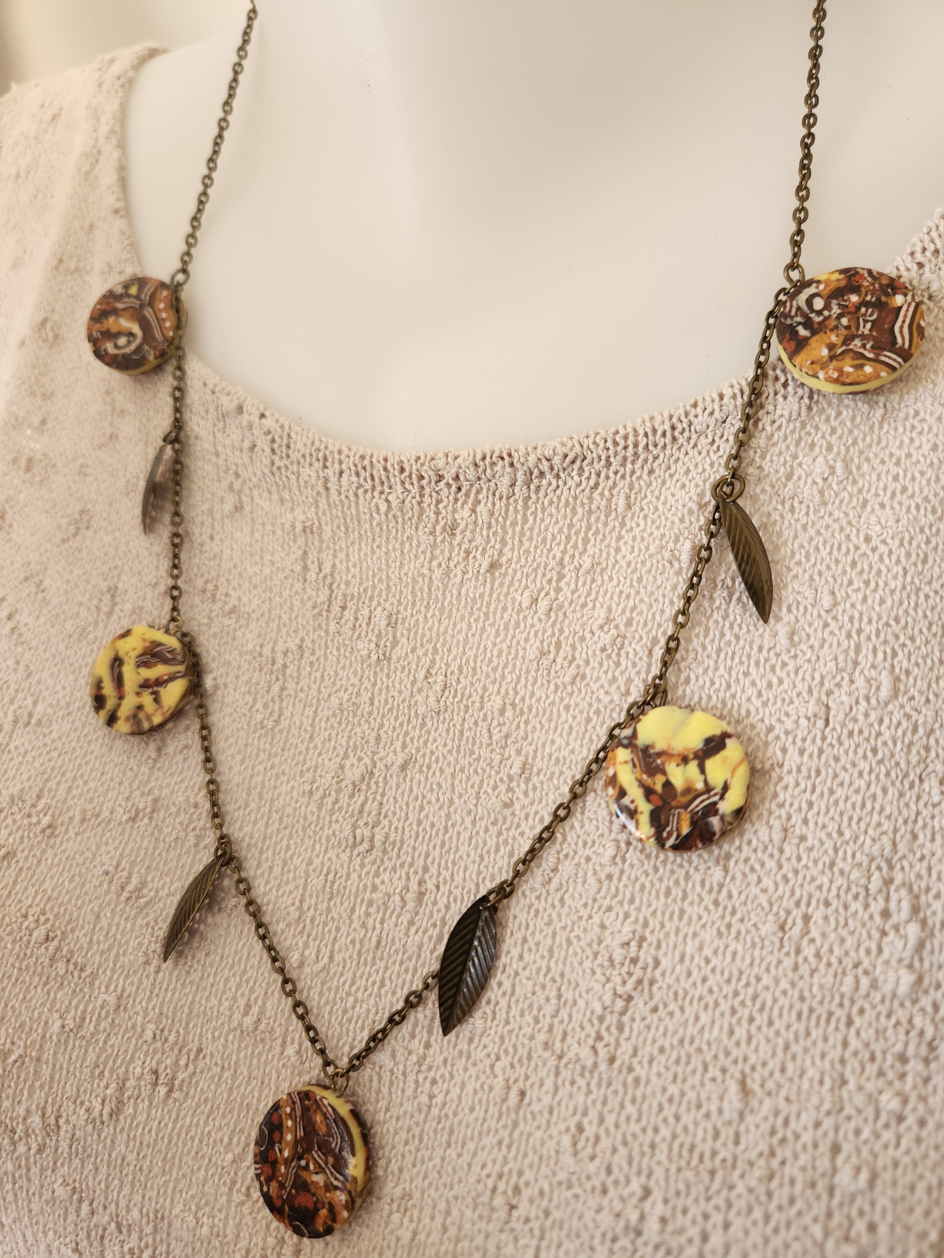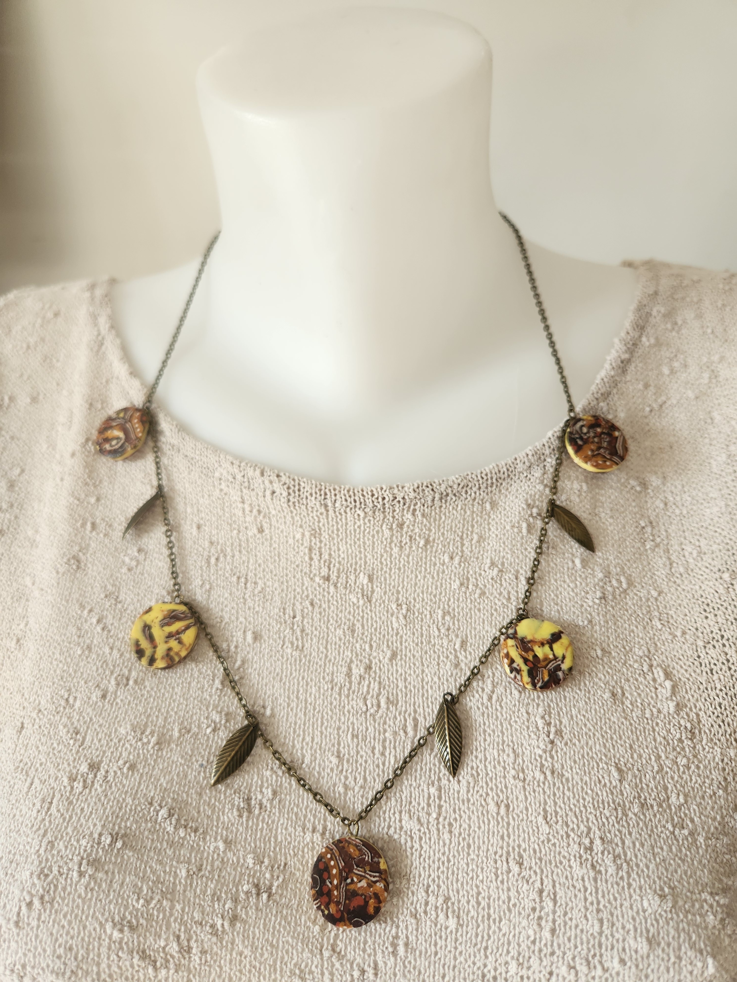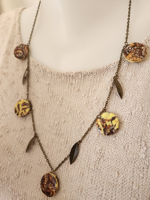Je vous propose ce collier composé de 5 perles plates en polymère ainsi que des breloques feuilles, le tout est monté sur une chaîne fantaisie en bronze avec chainette.