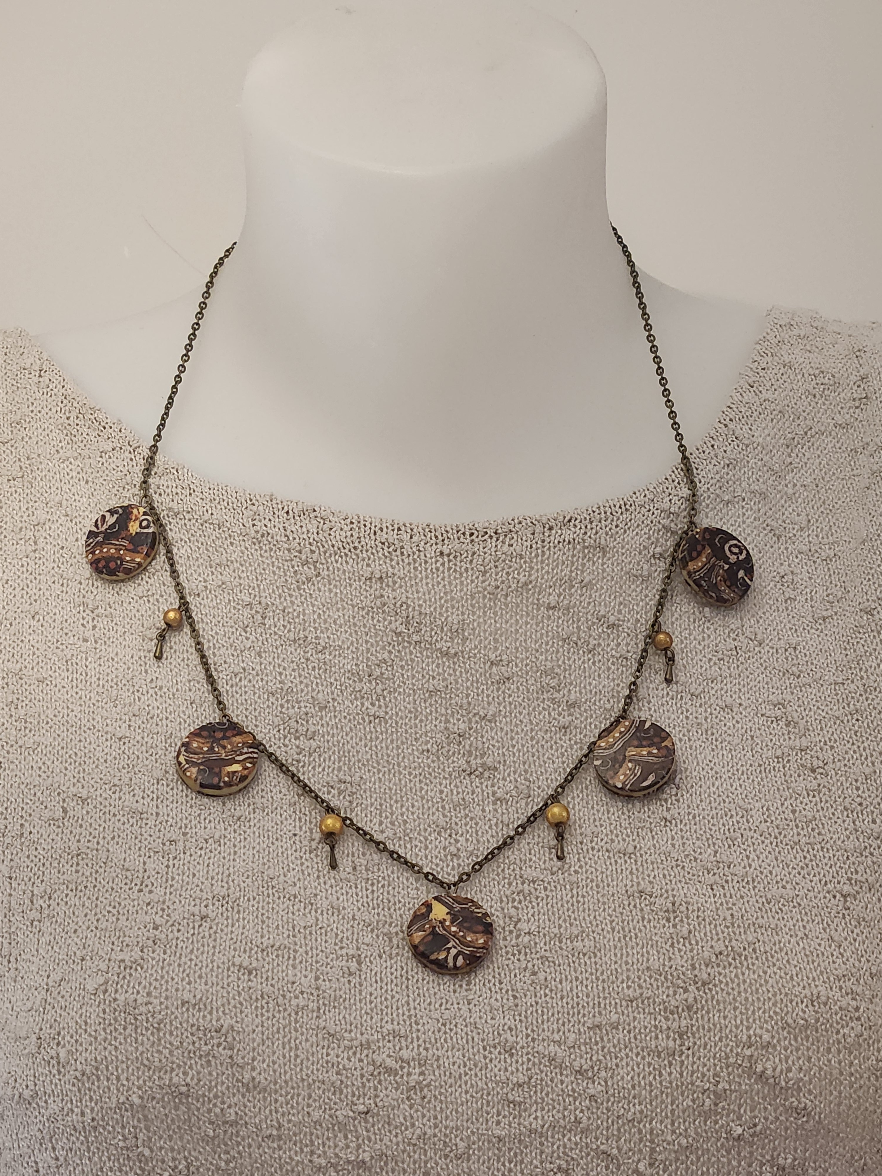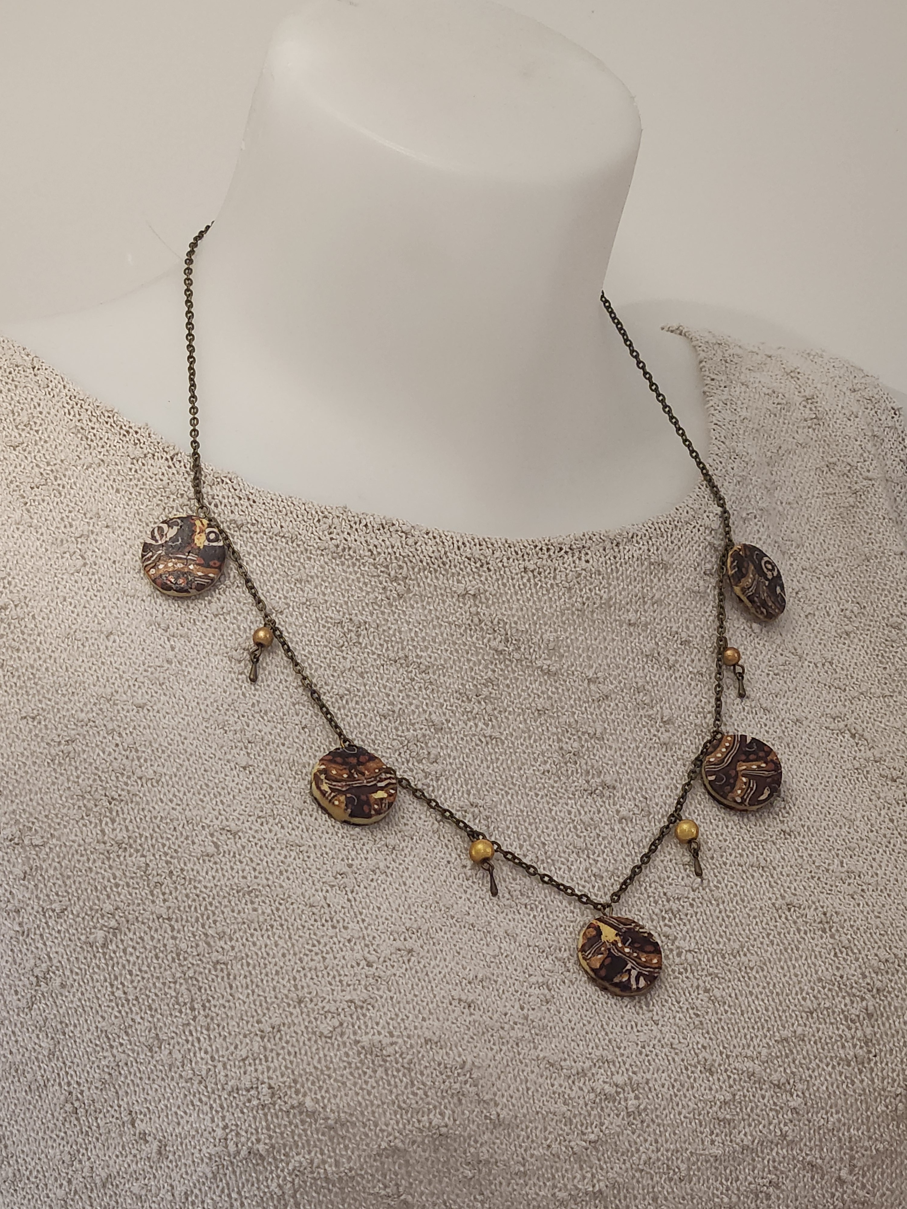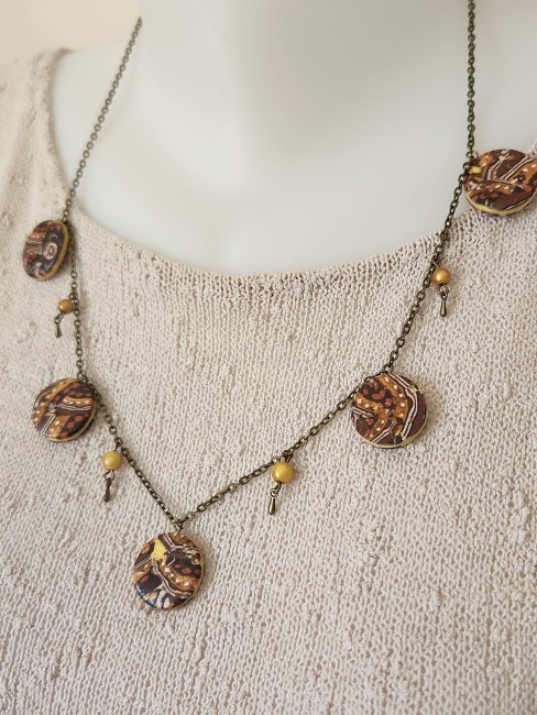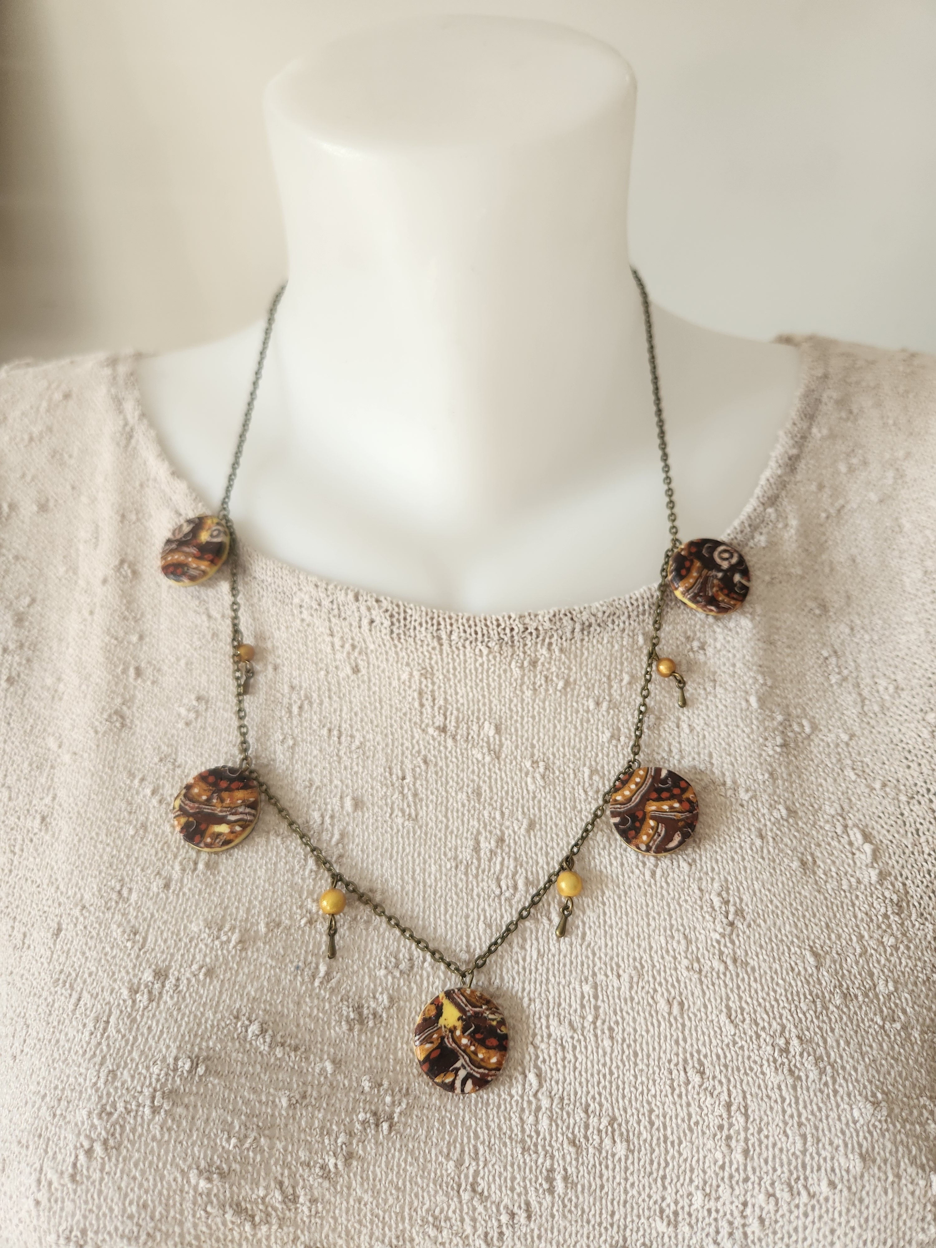 Je vous propose ce collier composé de 5 perles plates en polymère ainsi que des perles jaunes et gouttes, le tout est monté sur une chaîne fantaisie en bronze avec chainette.