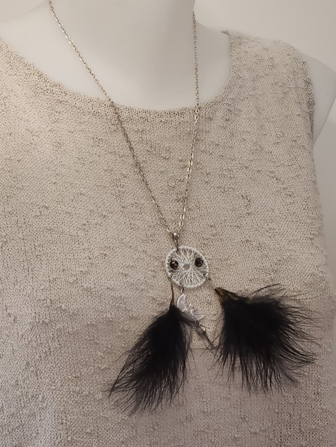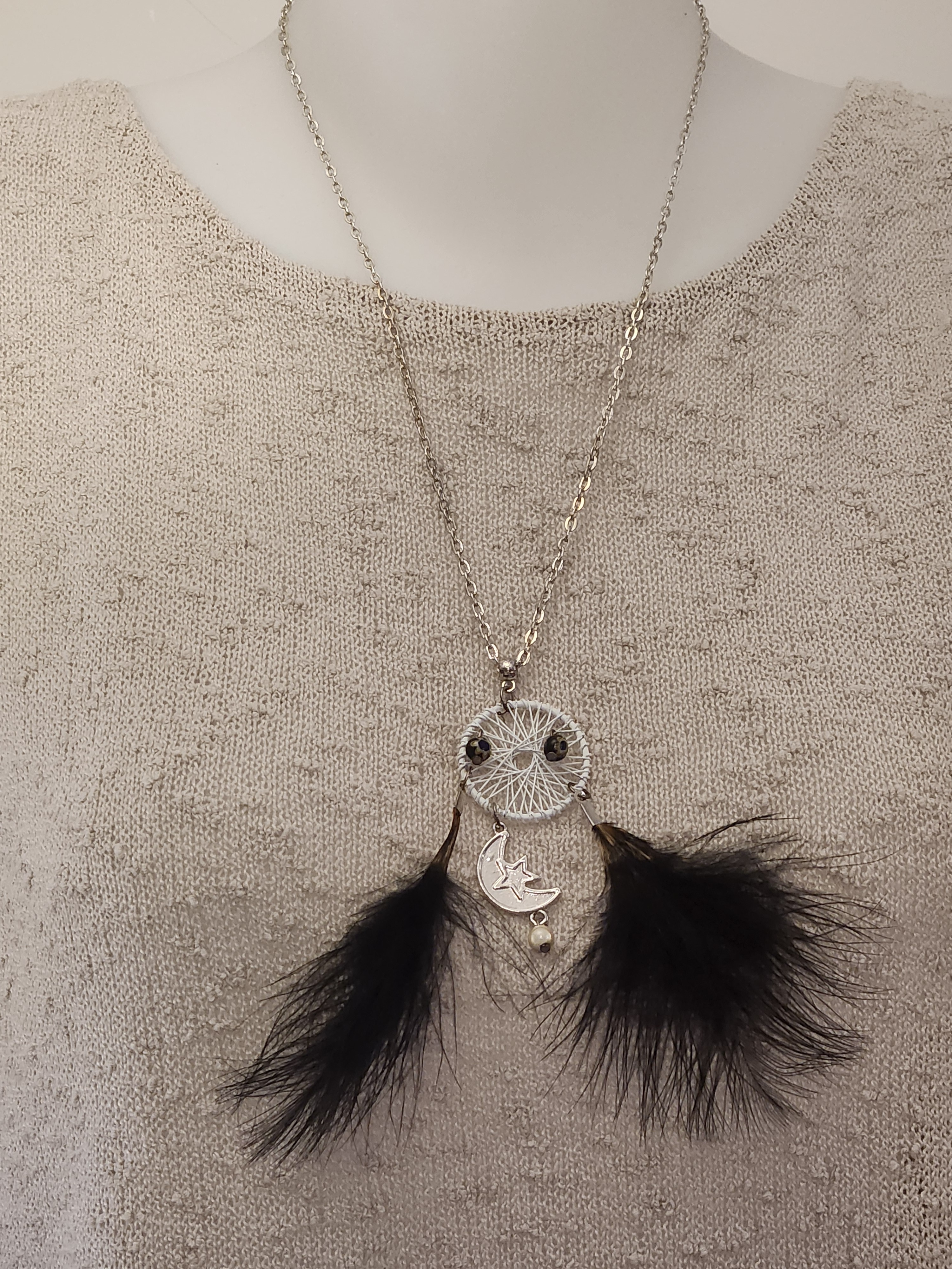 Je vous propose ce collier fantaisie attrape rêve blanc, 2 plumes noires, perles à reflet et lune en métal argenté avec une perle crème.