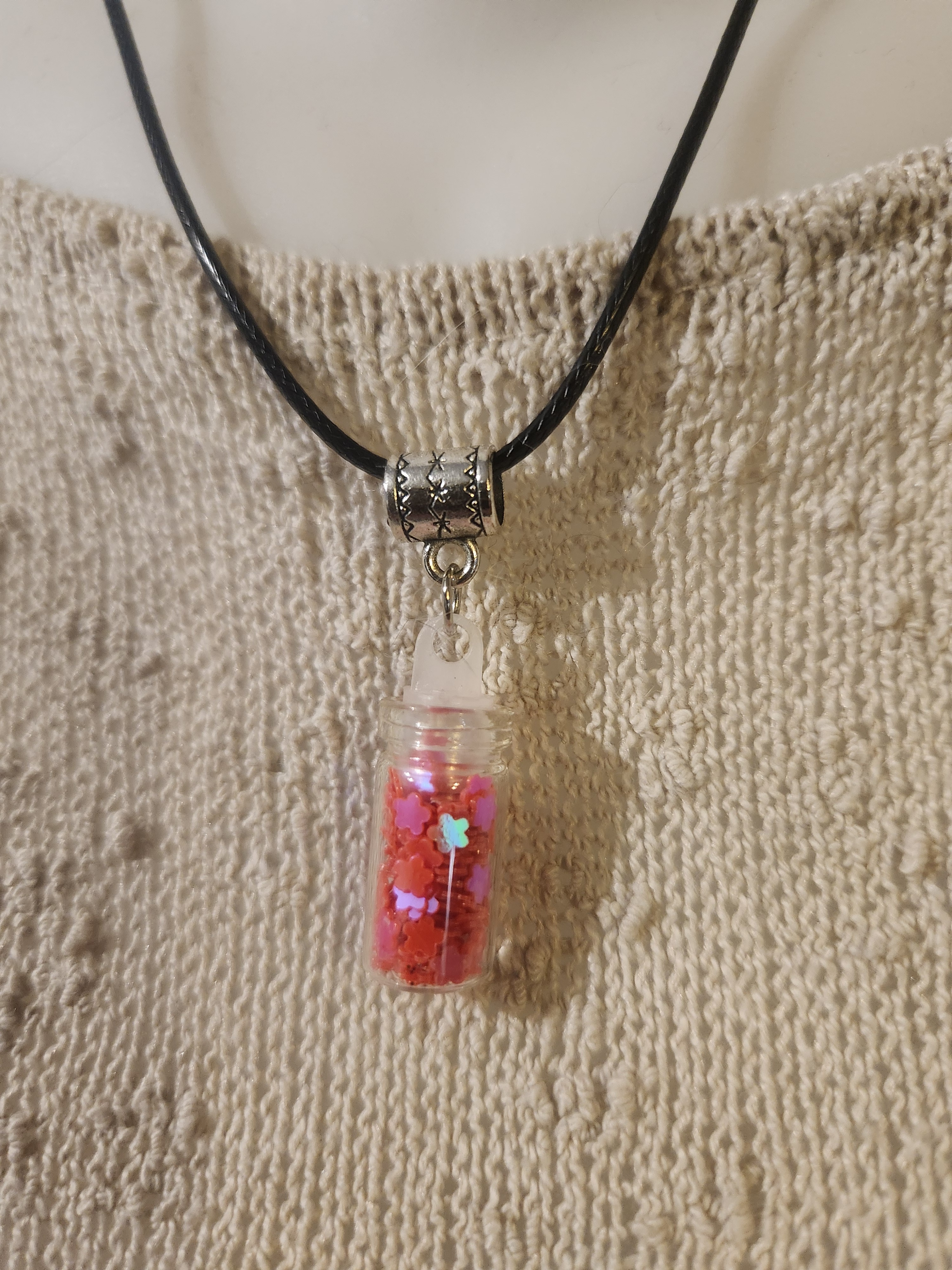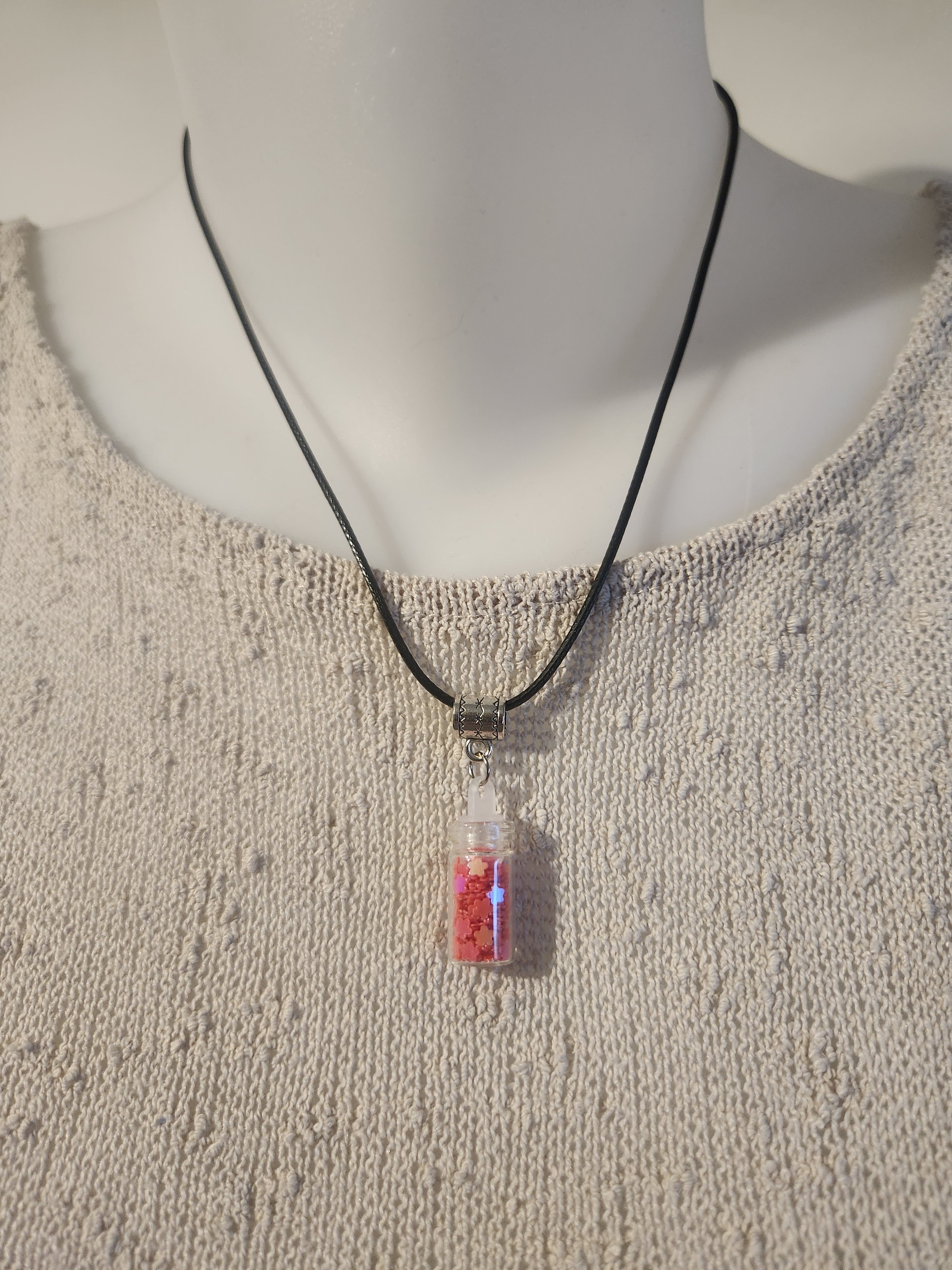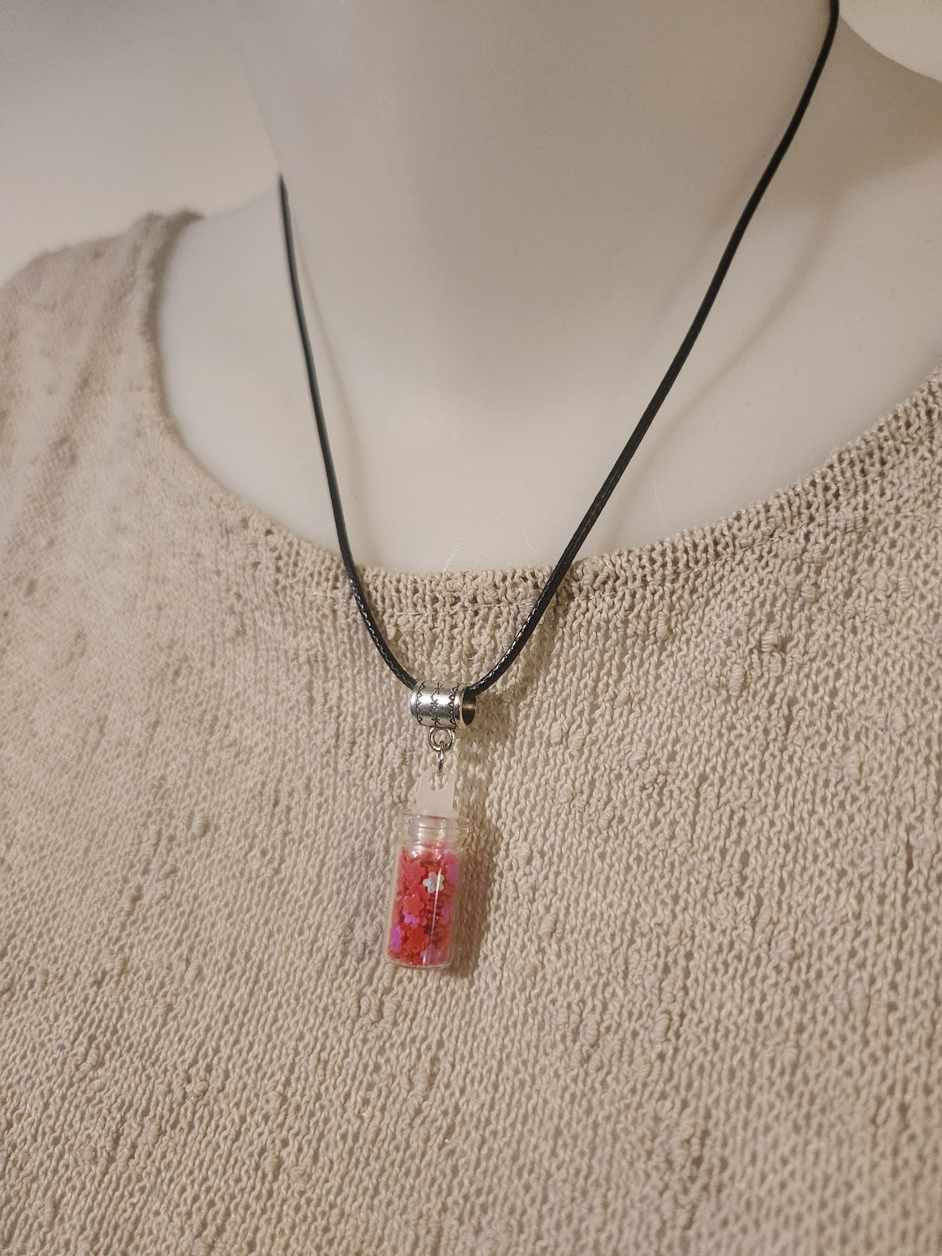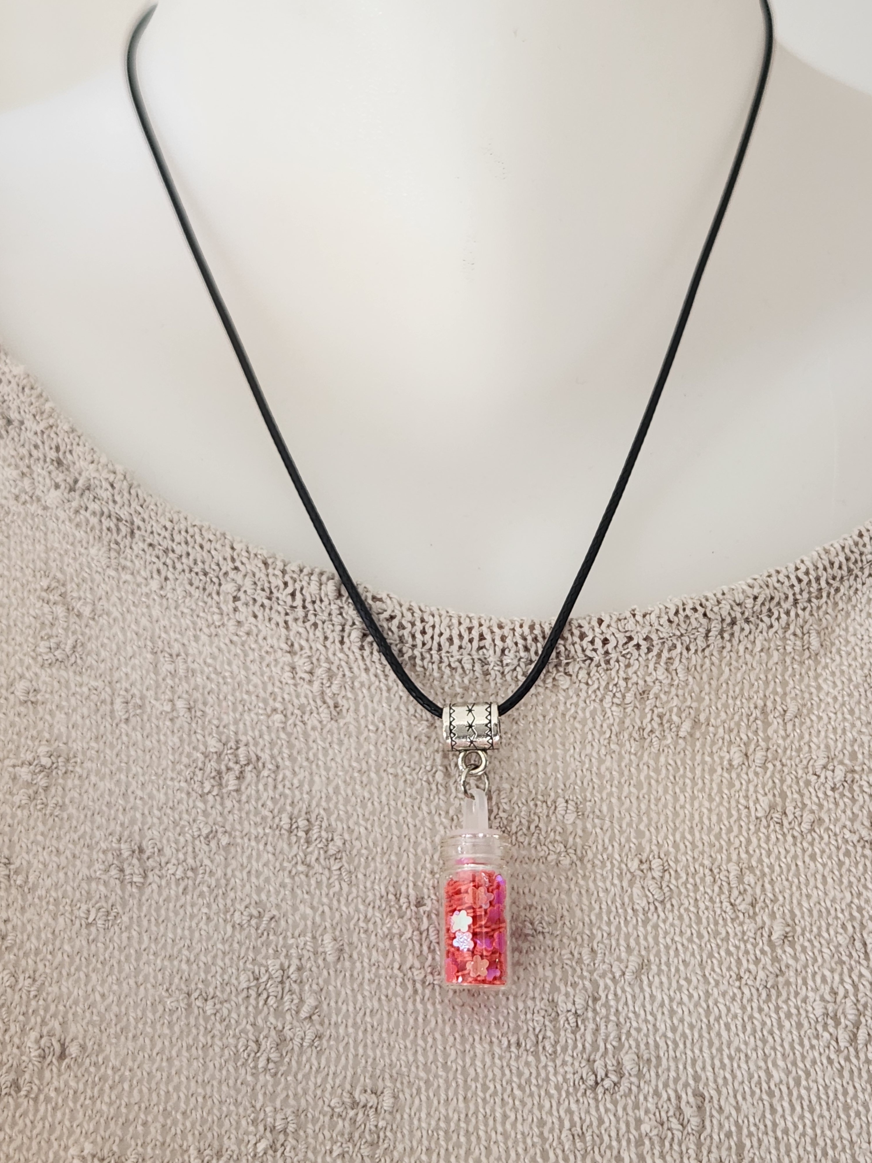 Je vous propose ce pendentif fiole avec des paillettes étoiles rose fushia, tour de cou en coton ciré noir.