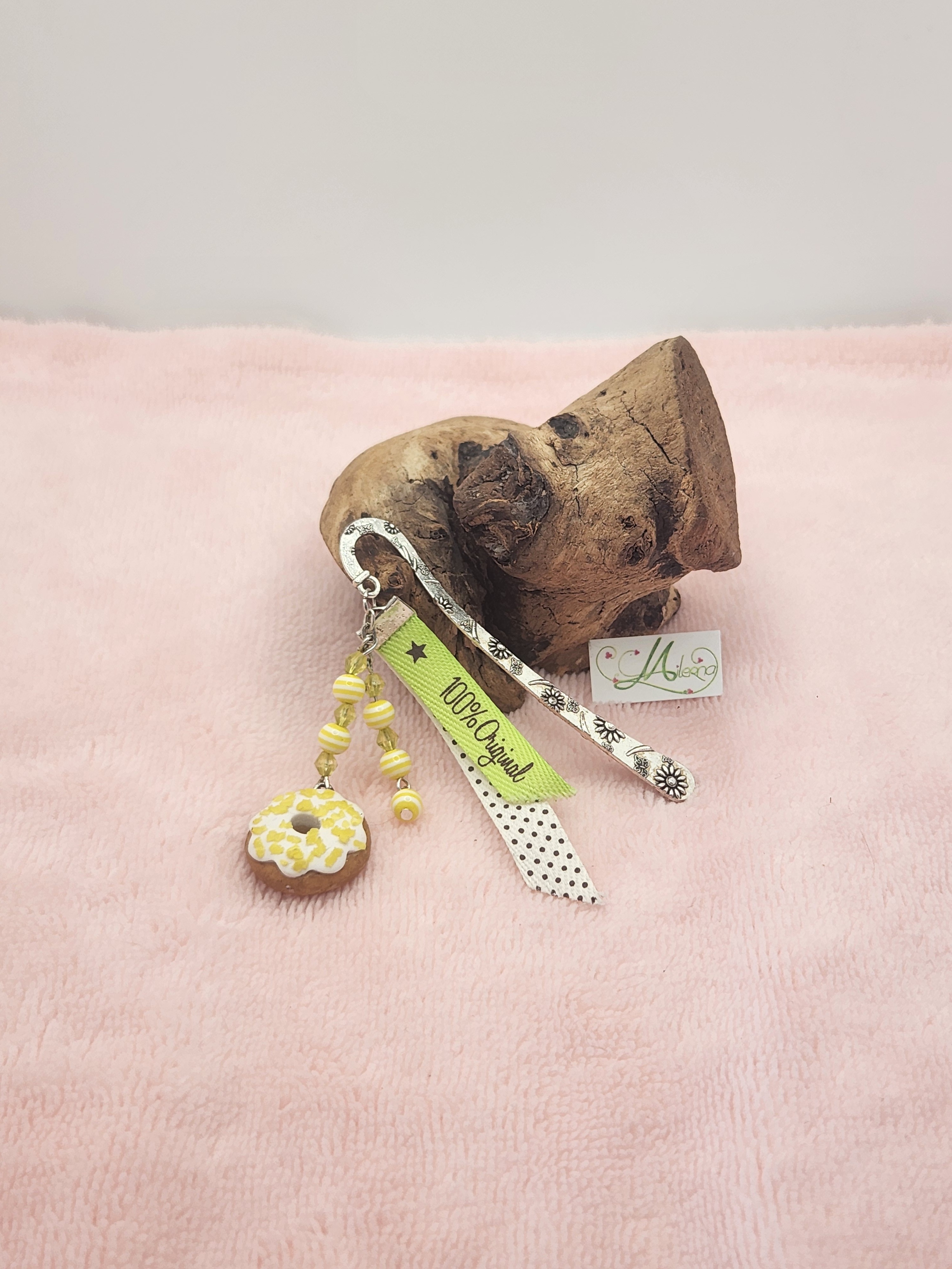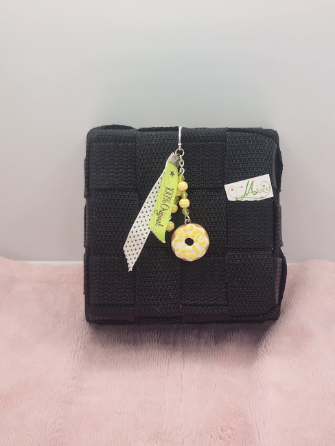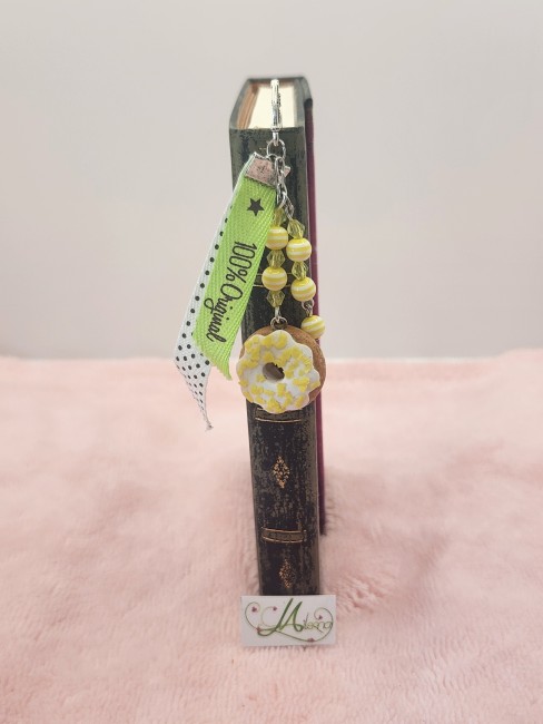 Il est composé de perles jaunes à facettes, et jaune rayé, d'un donuts vanille avec des pépites de citron.