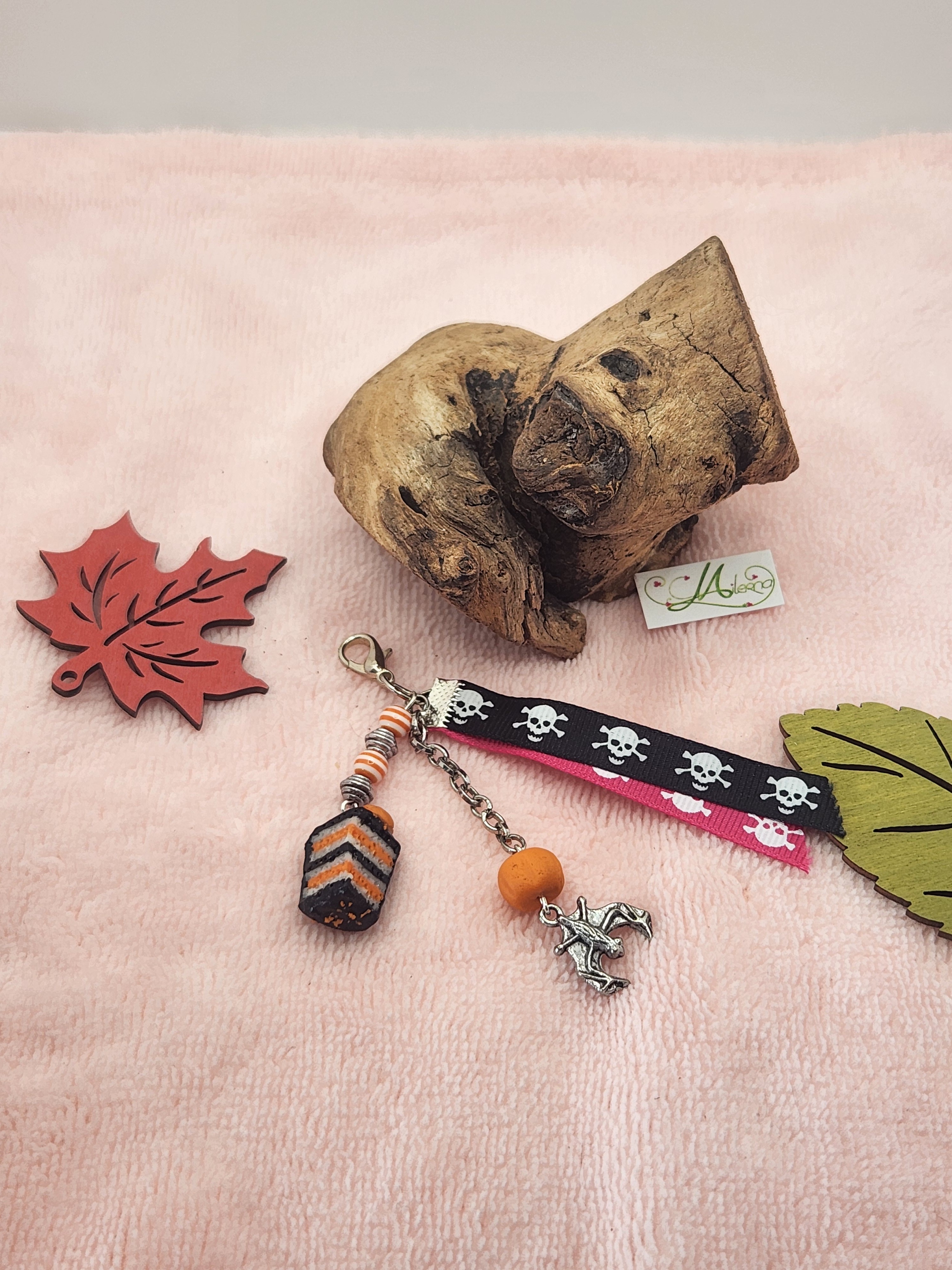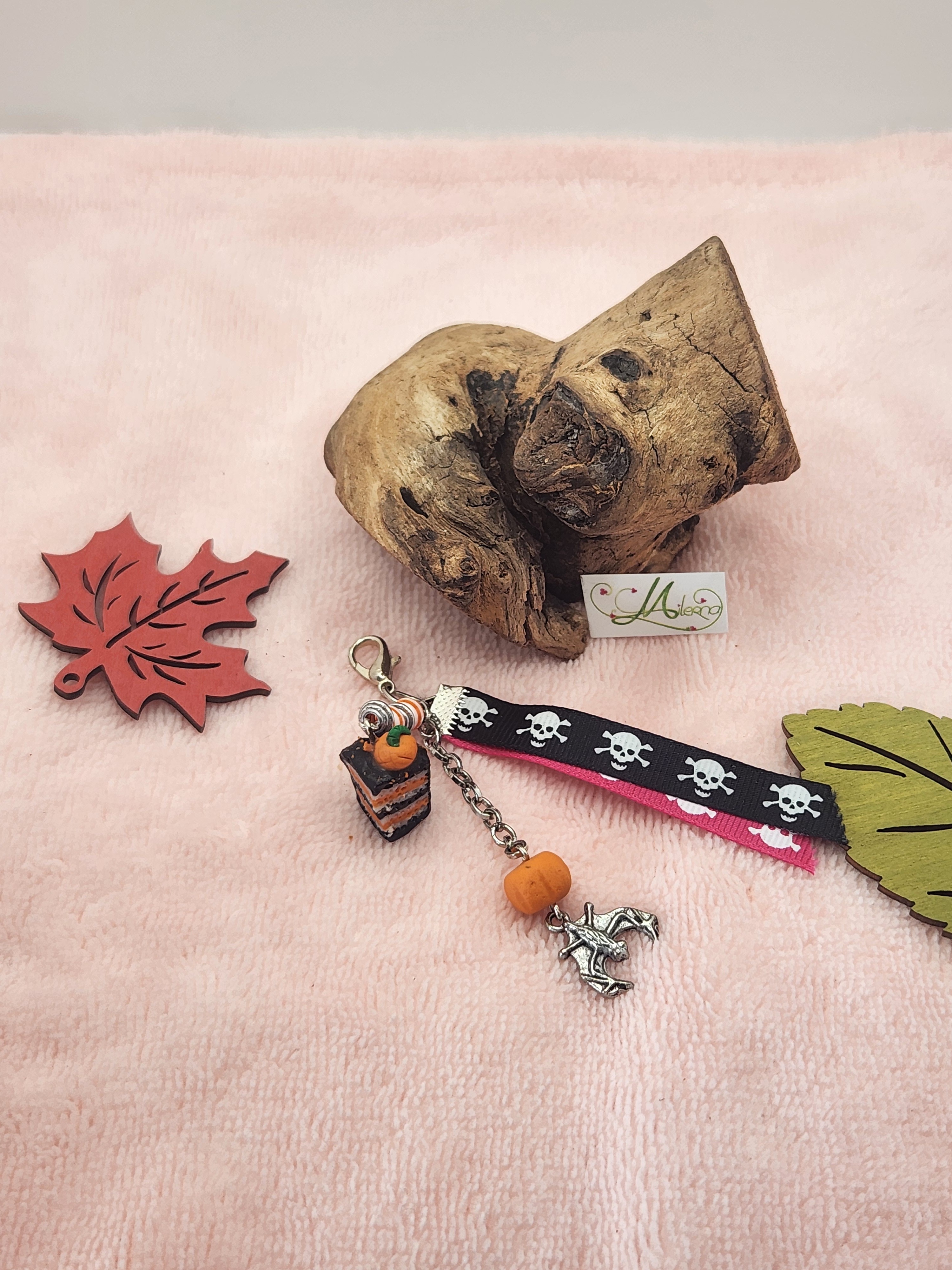Avec une part de gateau en polymère, des perles orange et argenté, une citrouille en polymère et une breloque chauve souris.