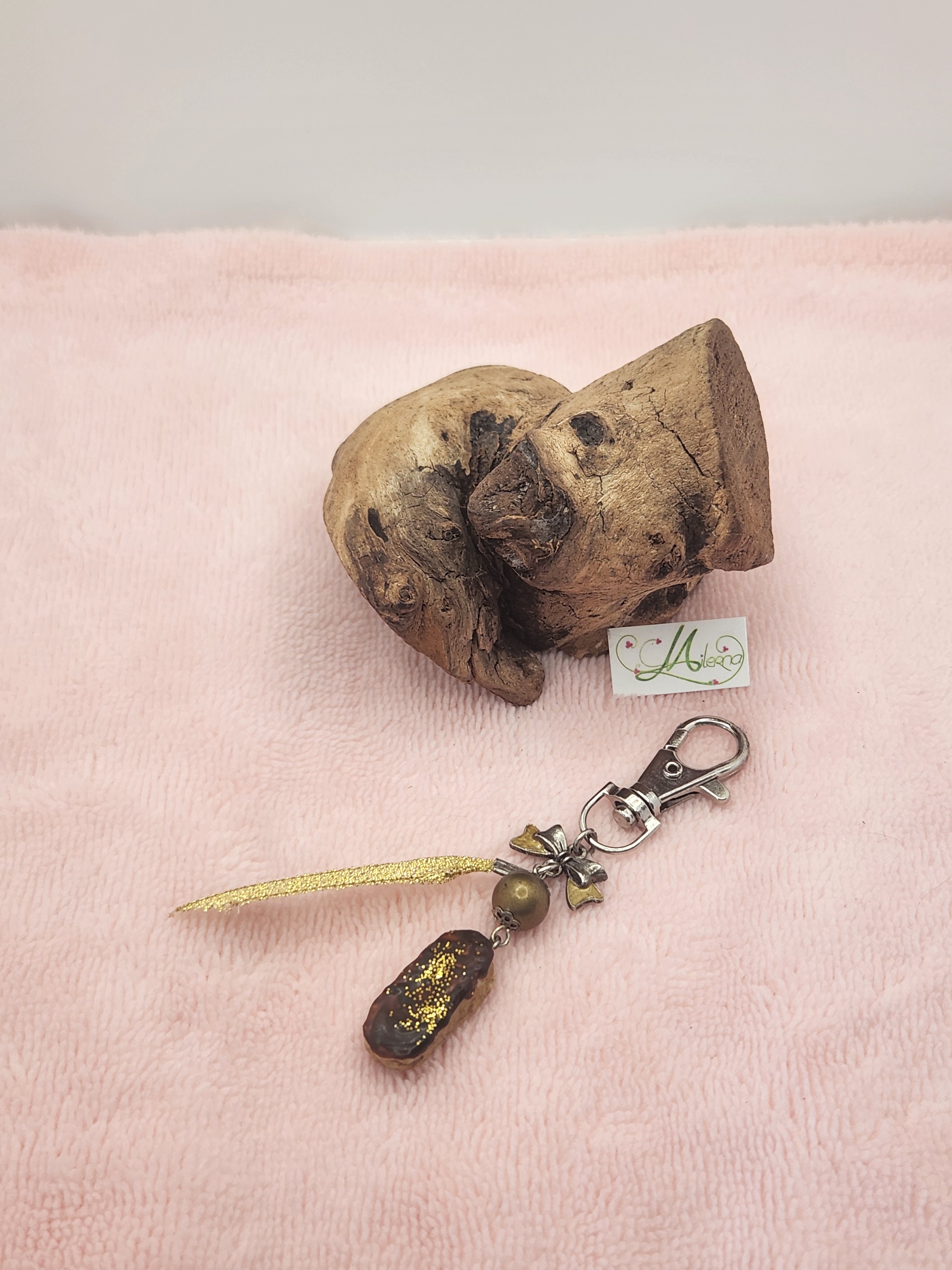 Je vous propose ce porte clefs éclair en chocolat en polymère avec une perle doré et un noeud papillon, ainsi qu'un ruban doré.