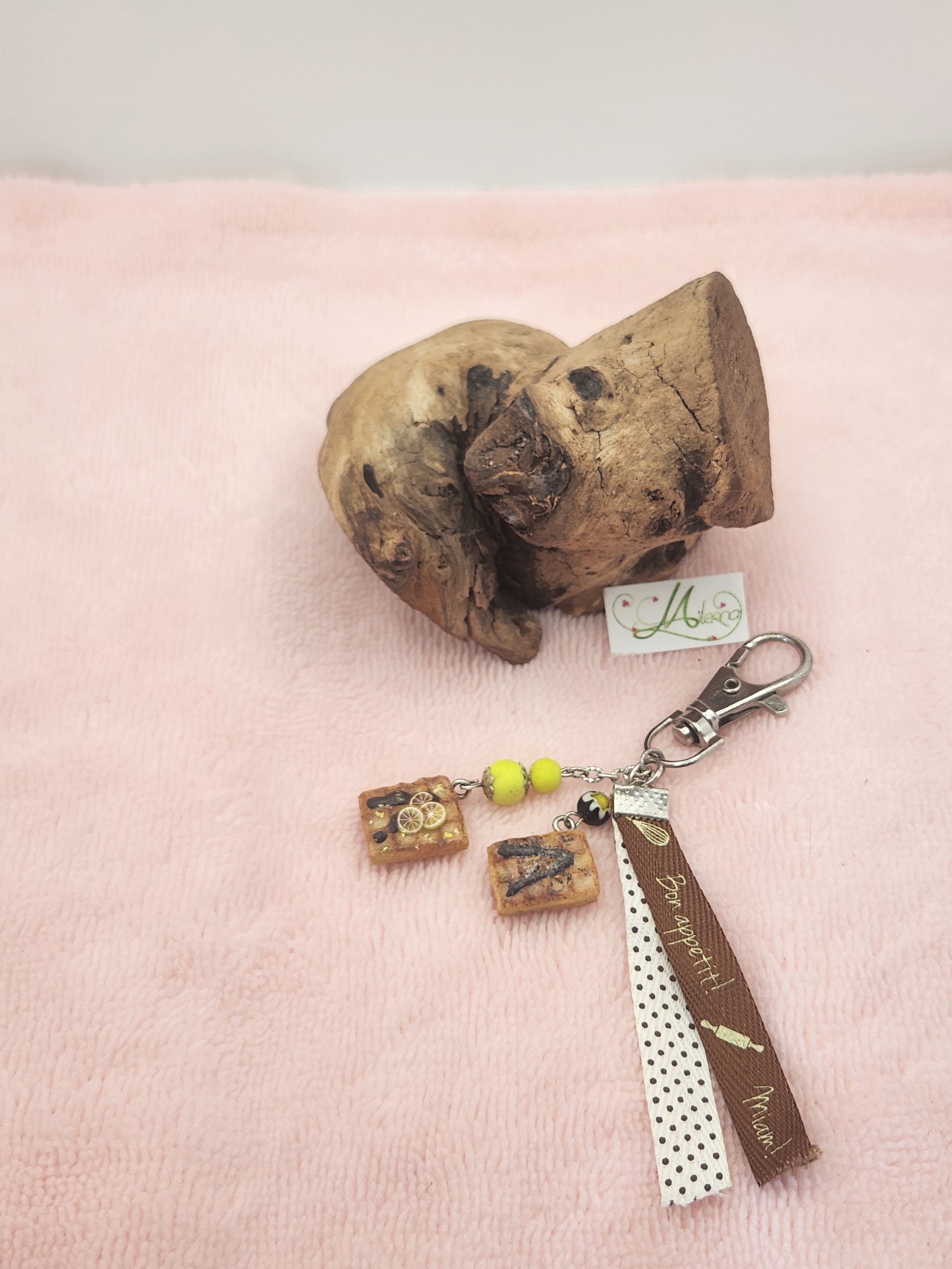 Je vous propose ce porte clefs 2 gaufres en polymère et perles jaune fluo ainsi qu'une perle noire fleurie.