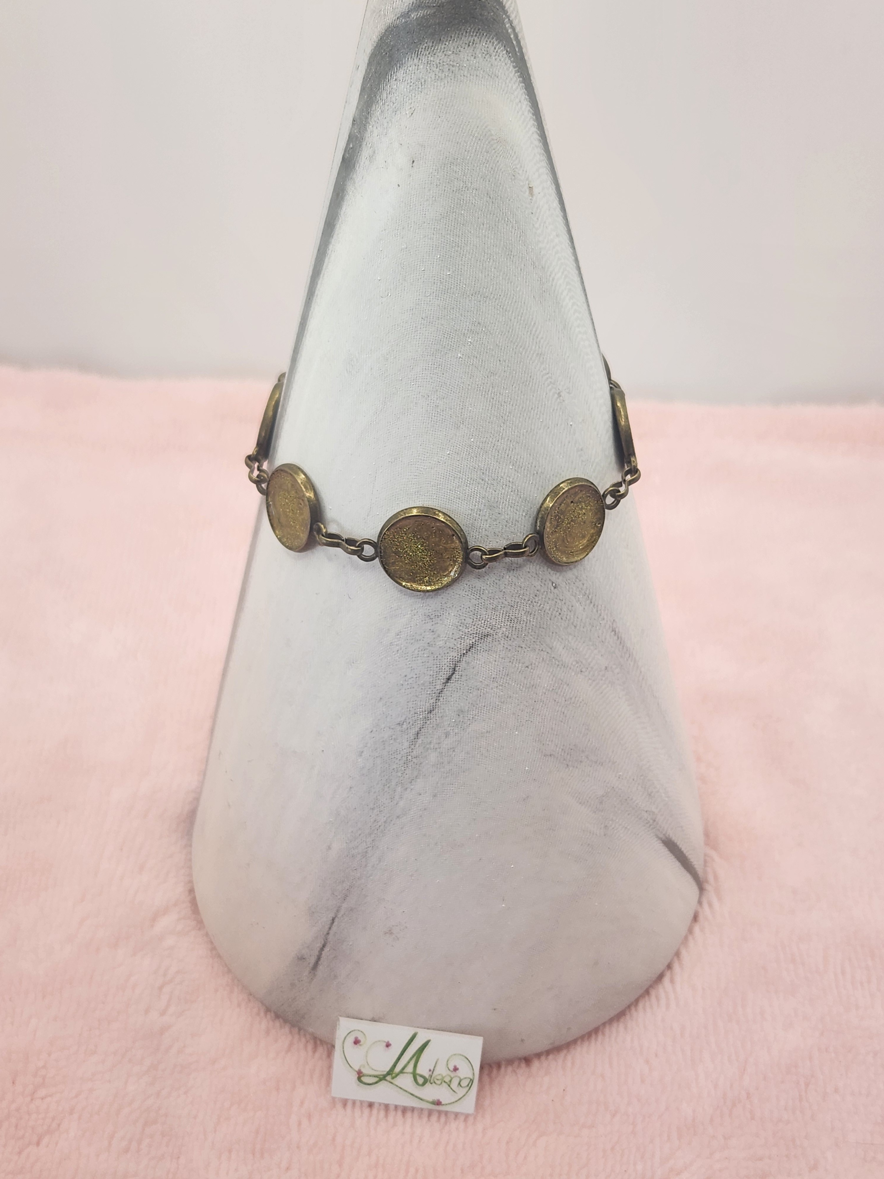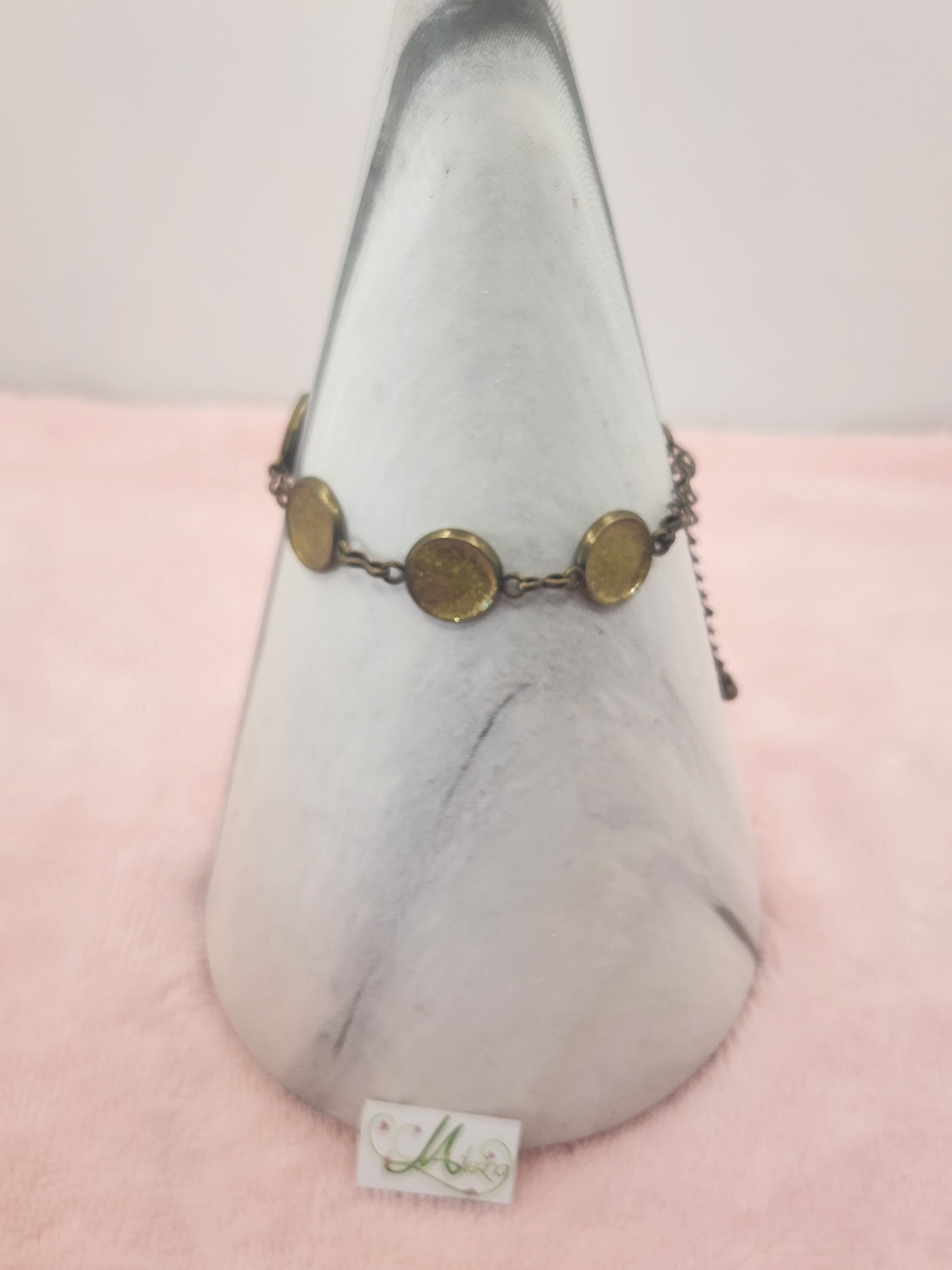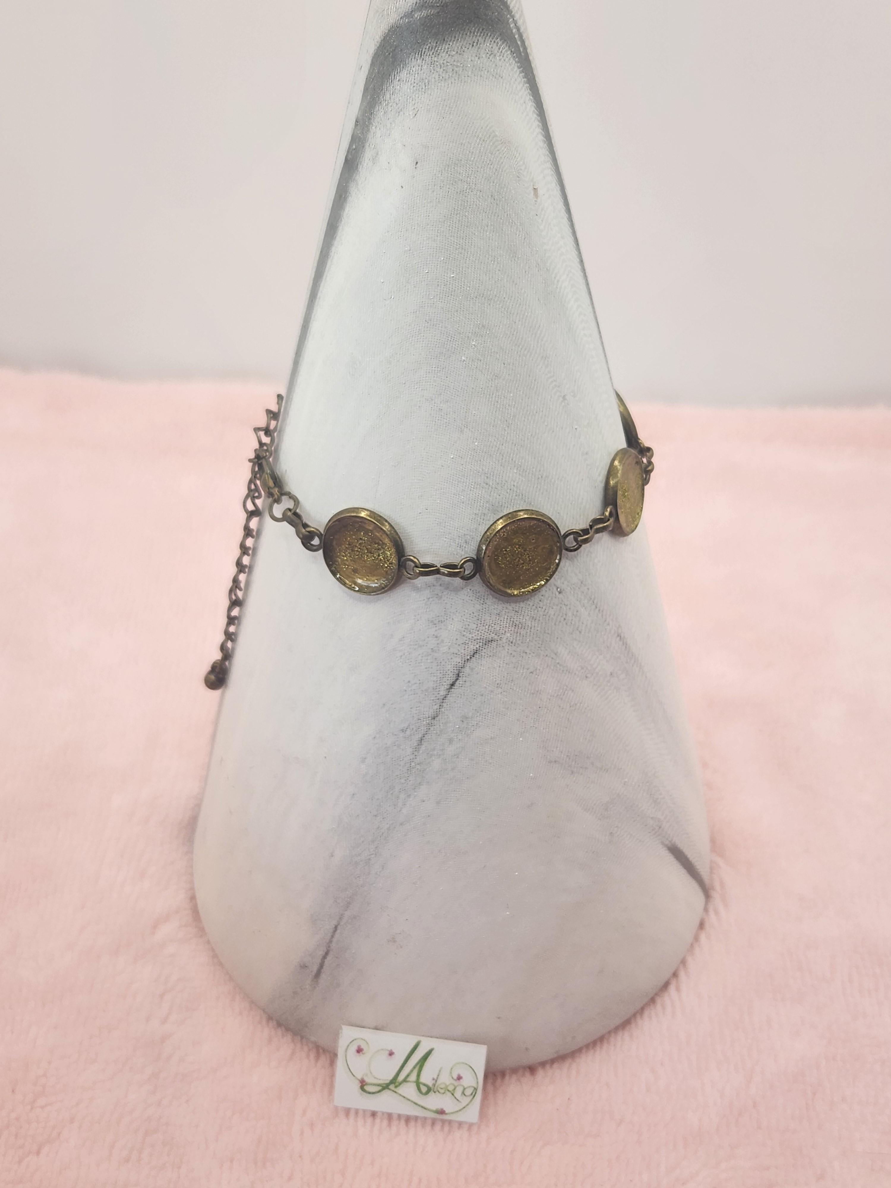 Je vous propose ce bracelet fantaisie en bronze, il est composé de 6 cabochons de couleurs doré à paillettes d'une longueur de 16.5cm et de 8cm de chainette.