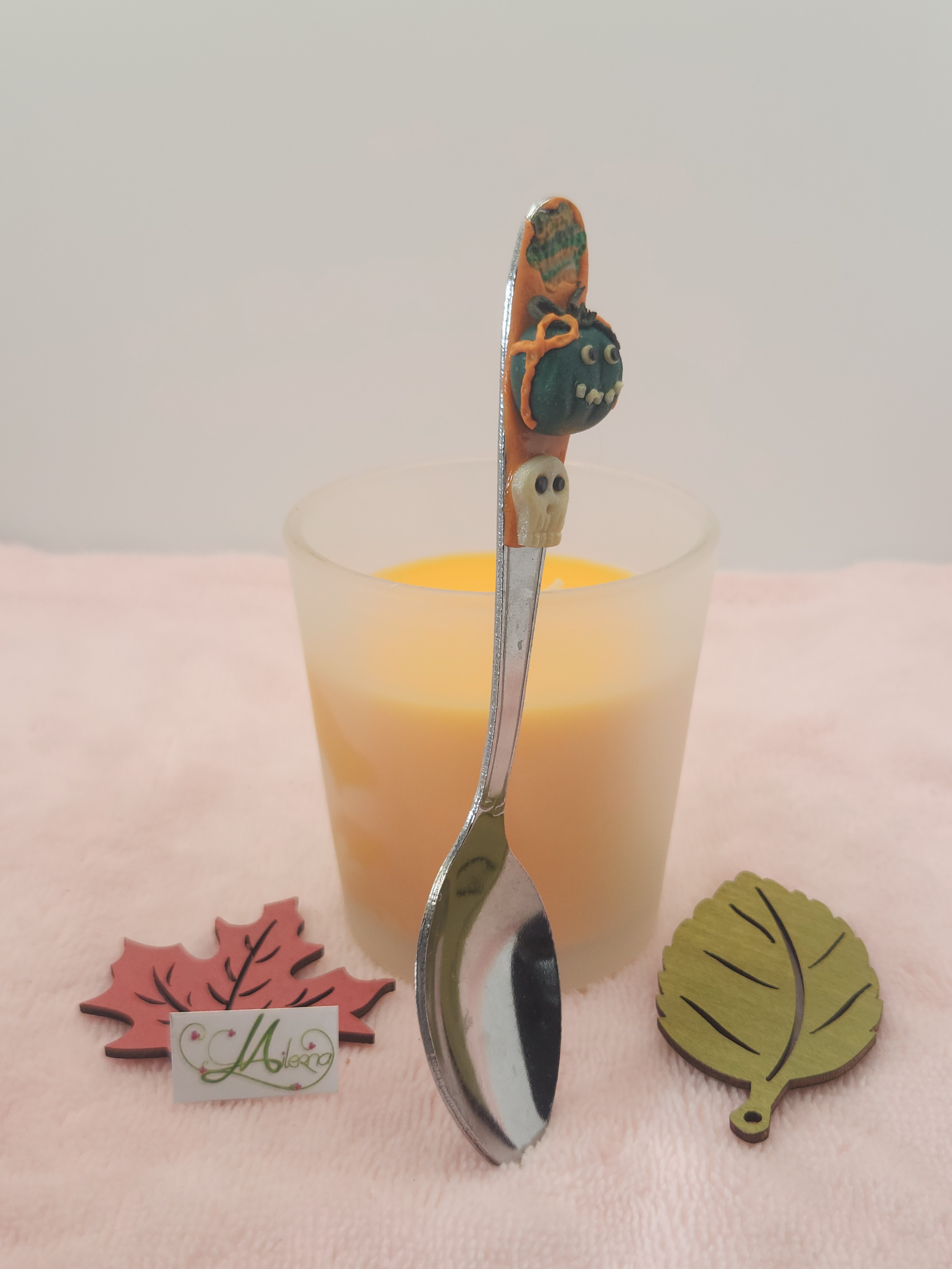 Je vous propose cette cuillière en acier inoxydable, motif citrouille de Halloween avec une tête de mort en polymère.
