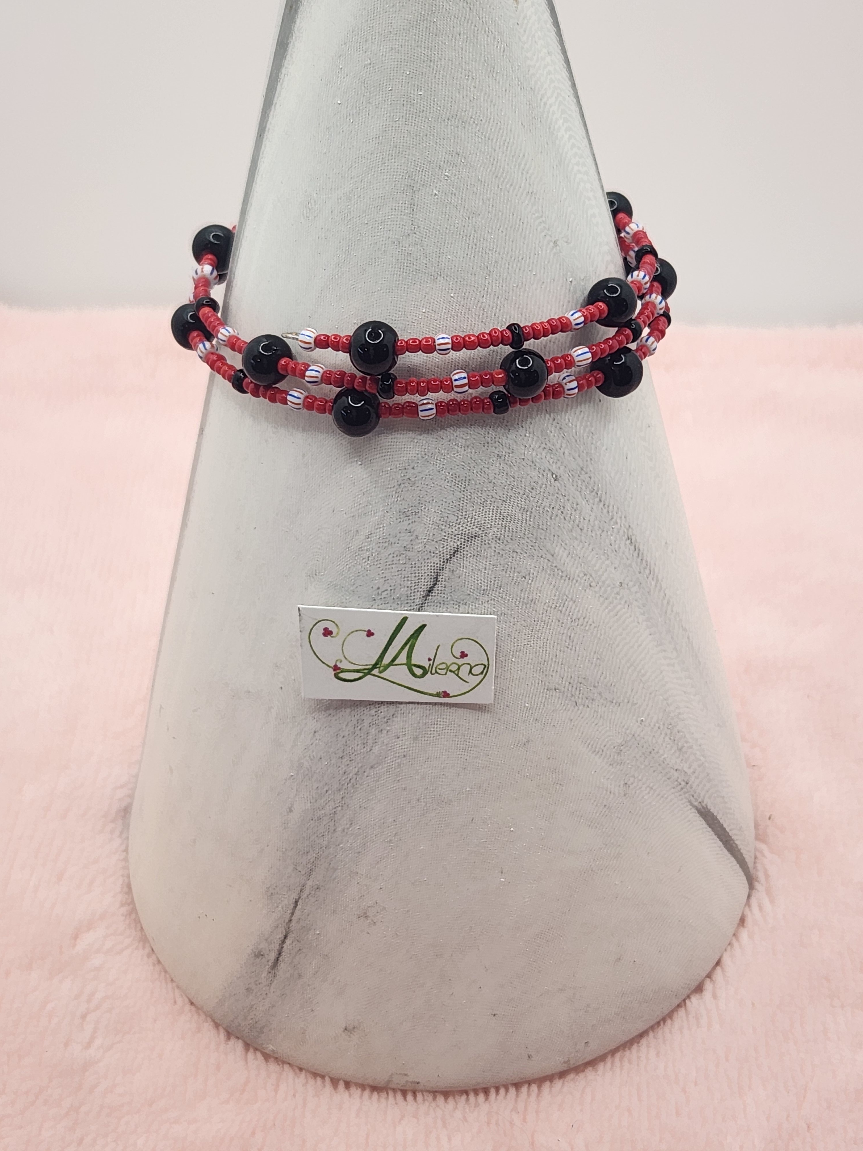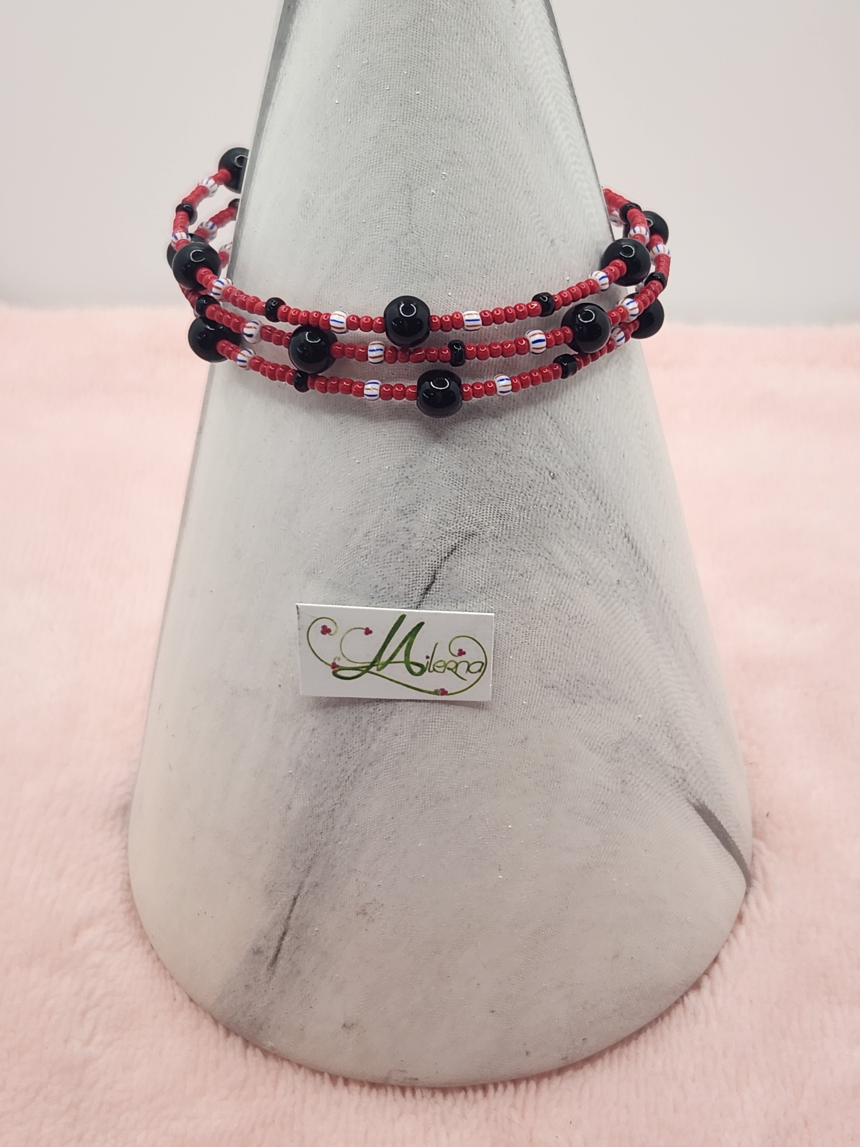 Ce bracelet contient des perles noire, rouge et blanche.