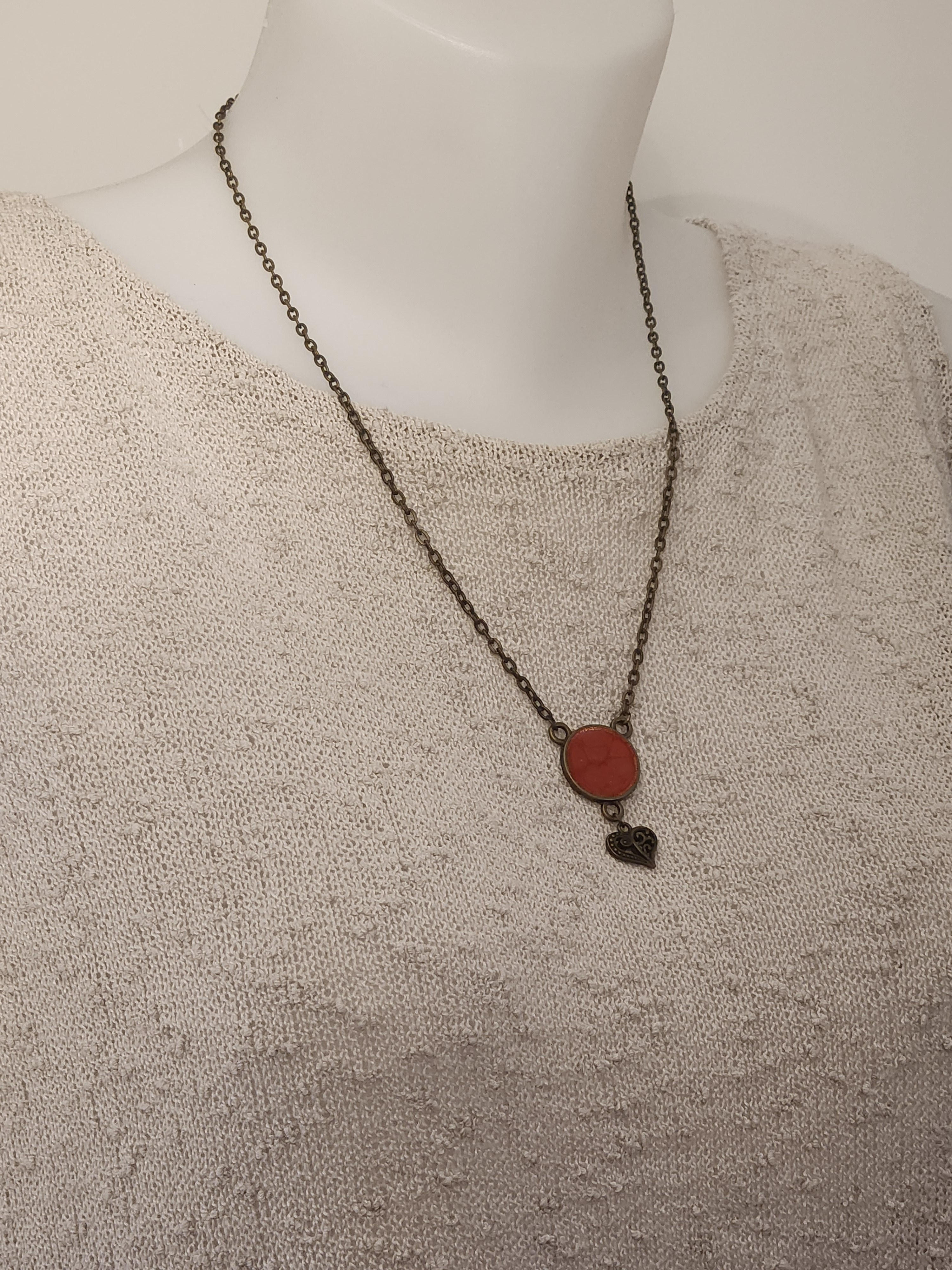 Je vous propose ce collier avec son cabochon en bronze à effet de couleur rouge avec une breloque ronde à motif coloris bronze