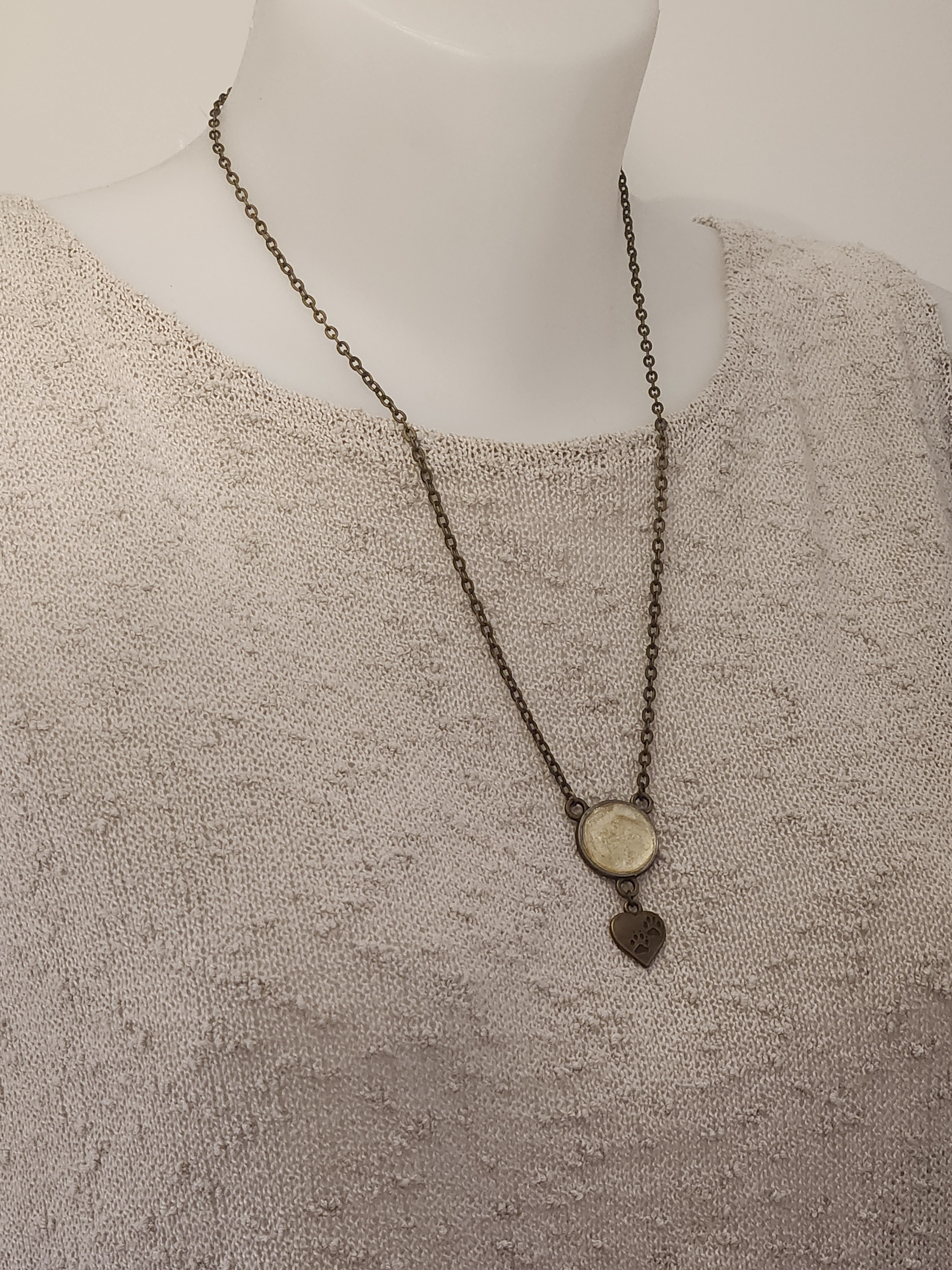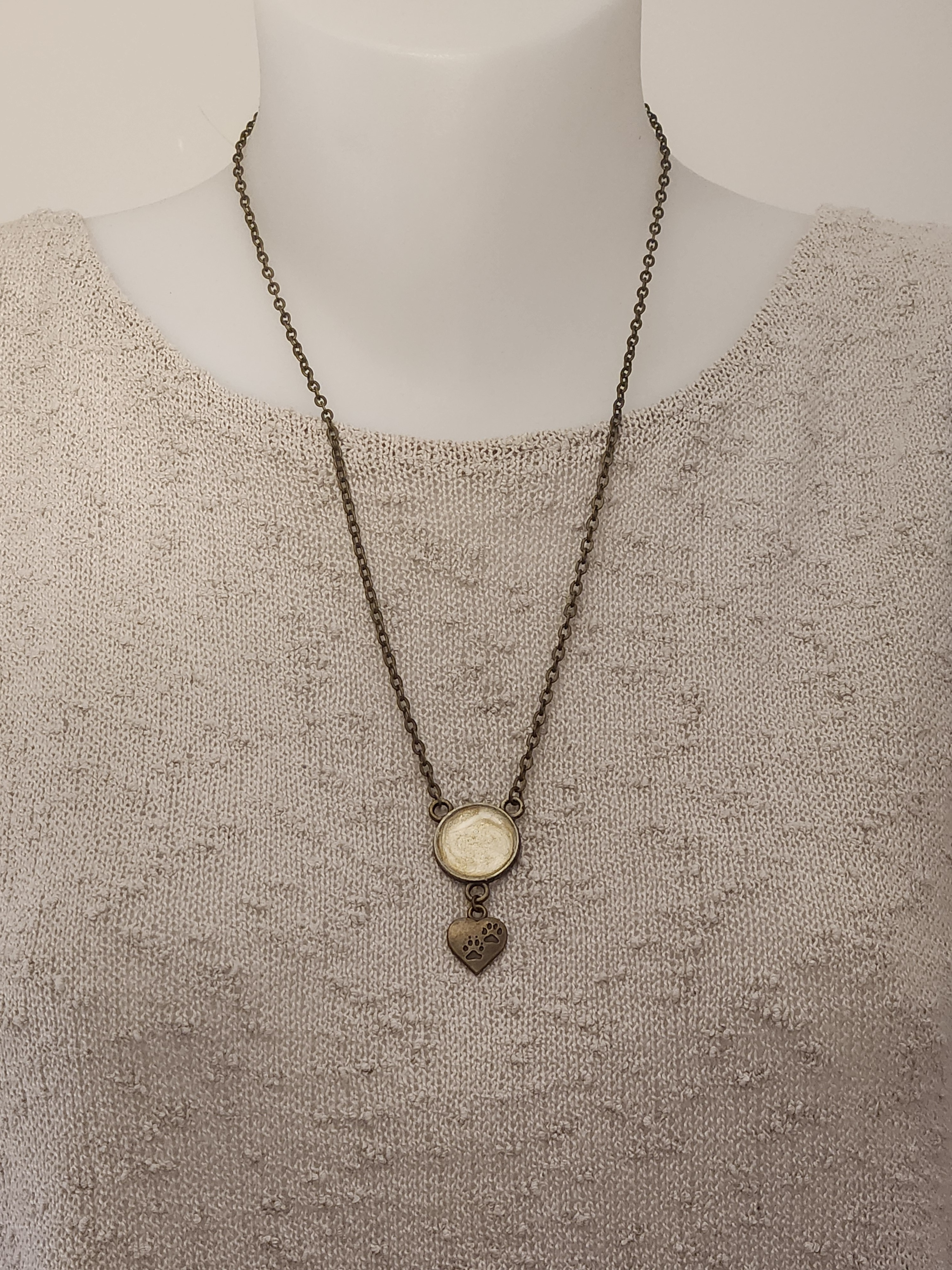 Je vous propose ce collier avec son cabochon en bronze à effet de couleur crème avec une breloque coeur à empreintes d'animaux, à motif coloris bronze