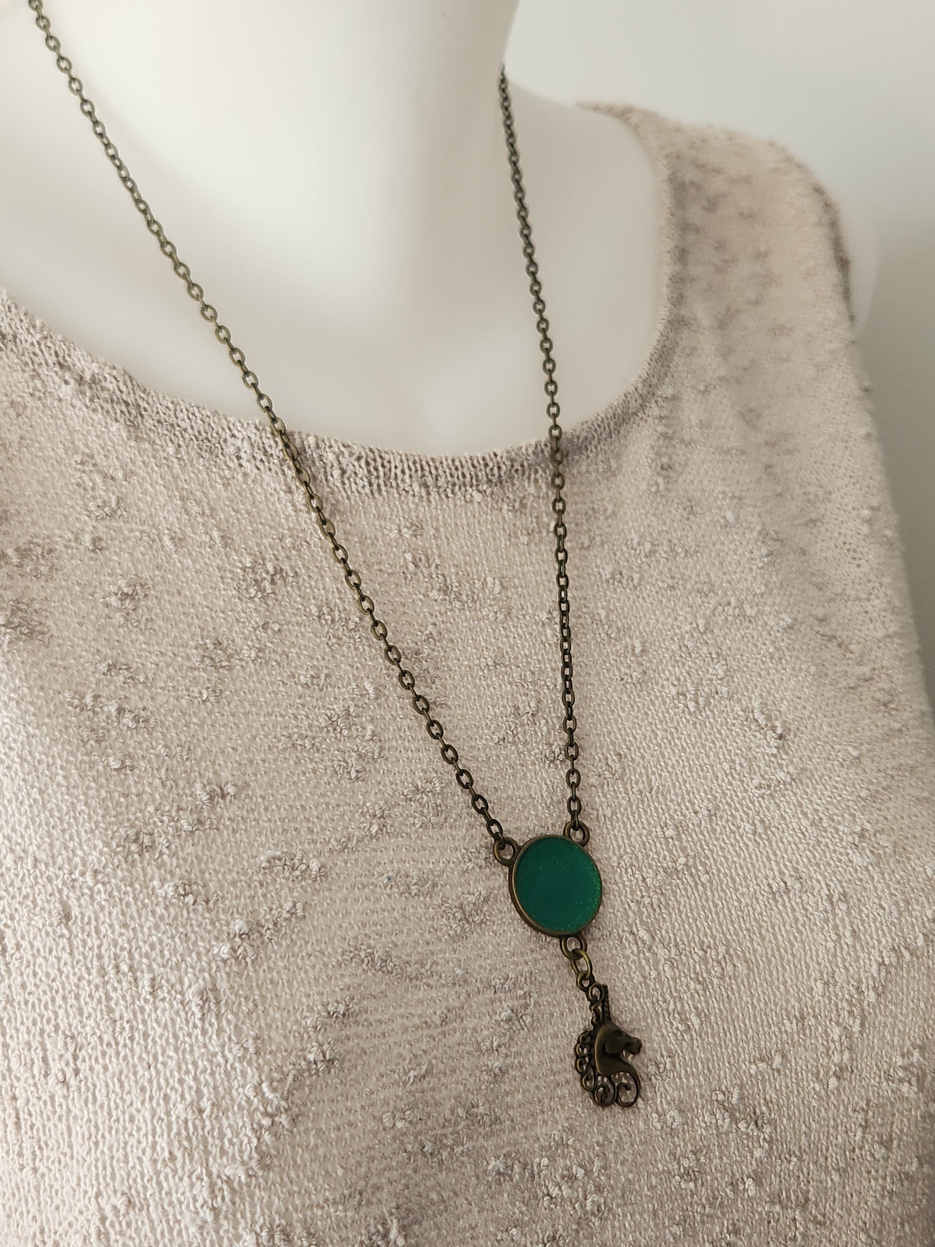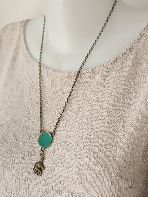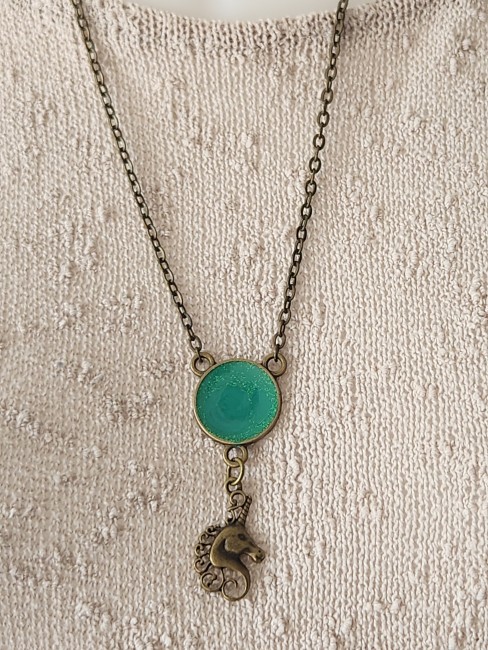 Je vous propose ce collier avec son cabochon en bronze à effet de couleur bleu turquoise/vert avec une licorne à motif coloris bronze
