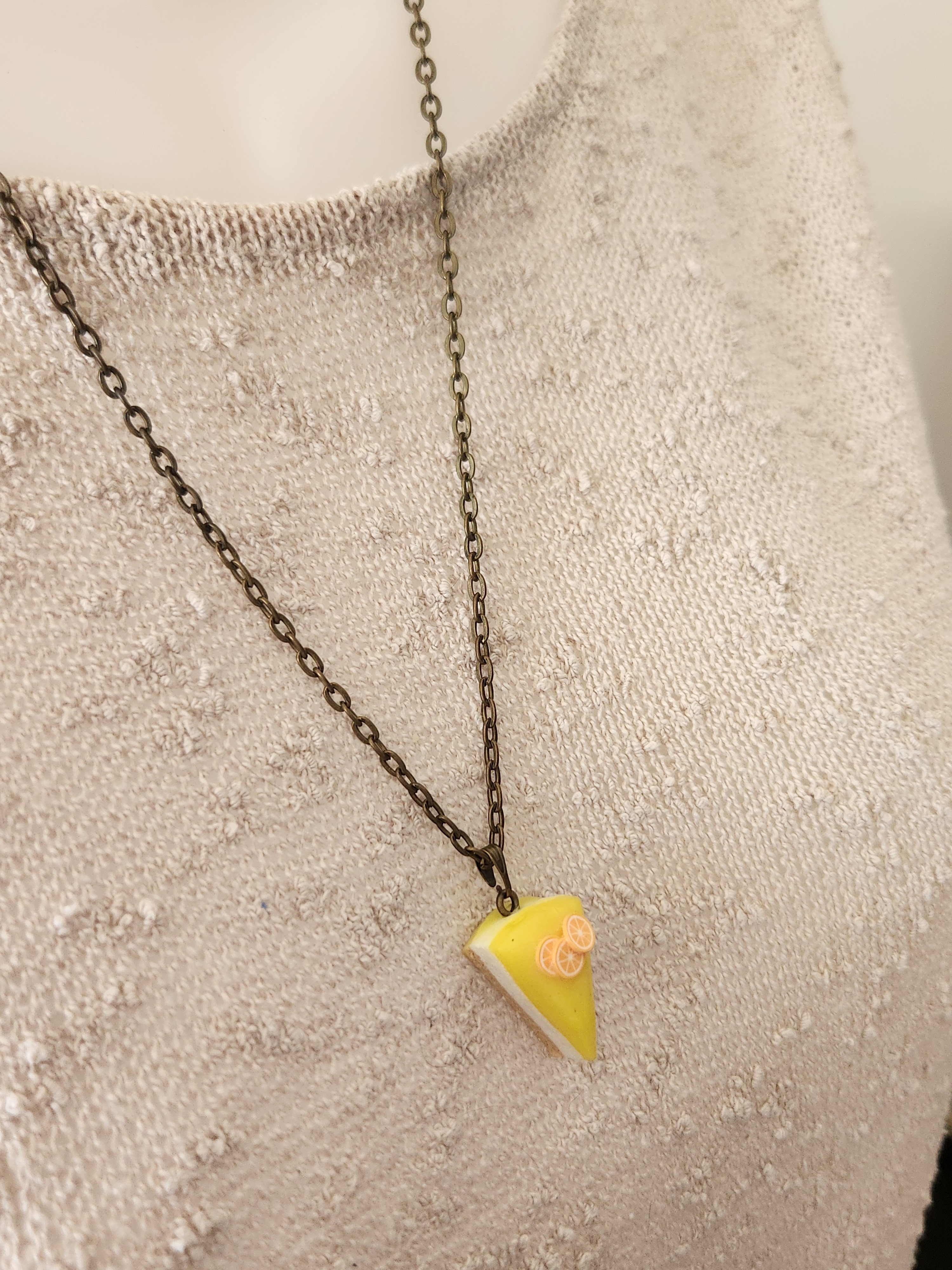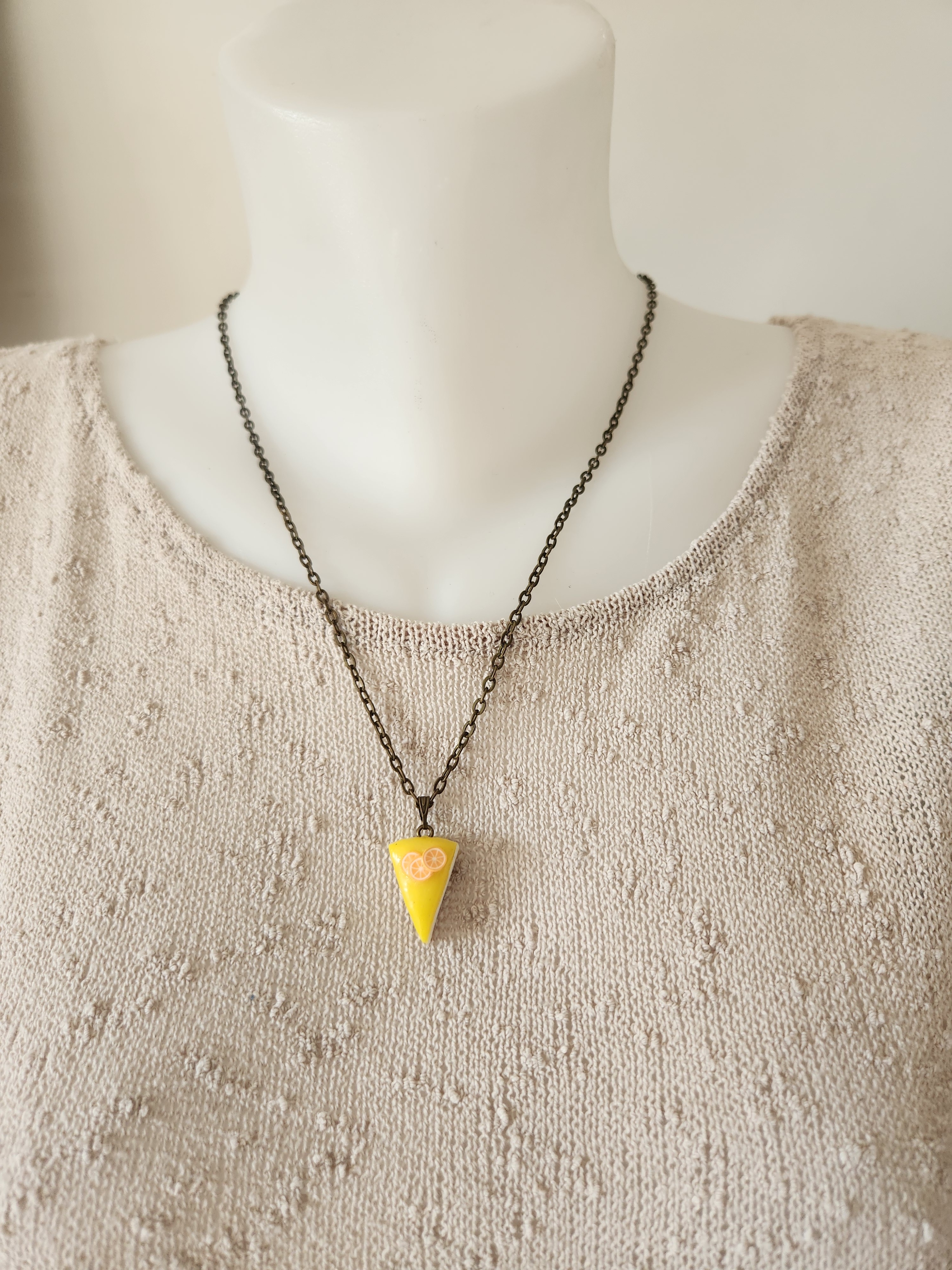Je vous propose ce pendentif gourmand, part de tarte citron en polymère, monté sur chaine coloris bronze.