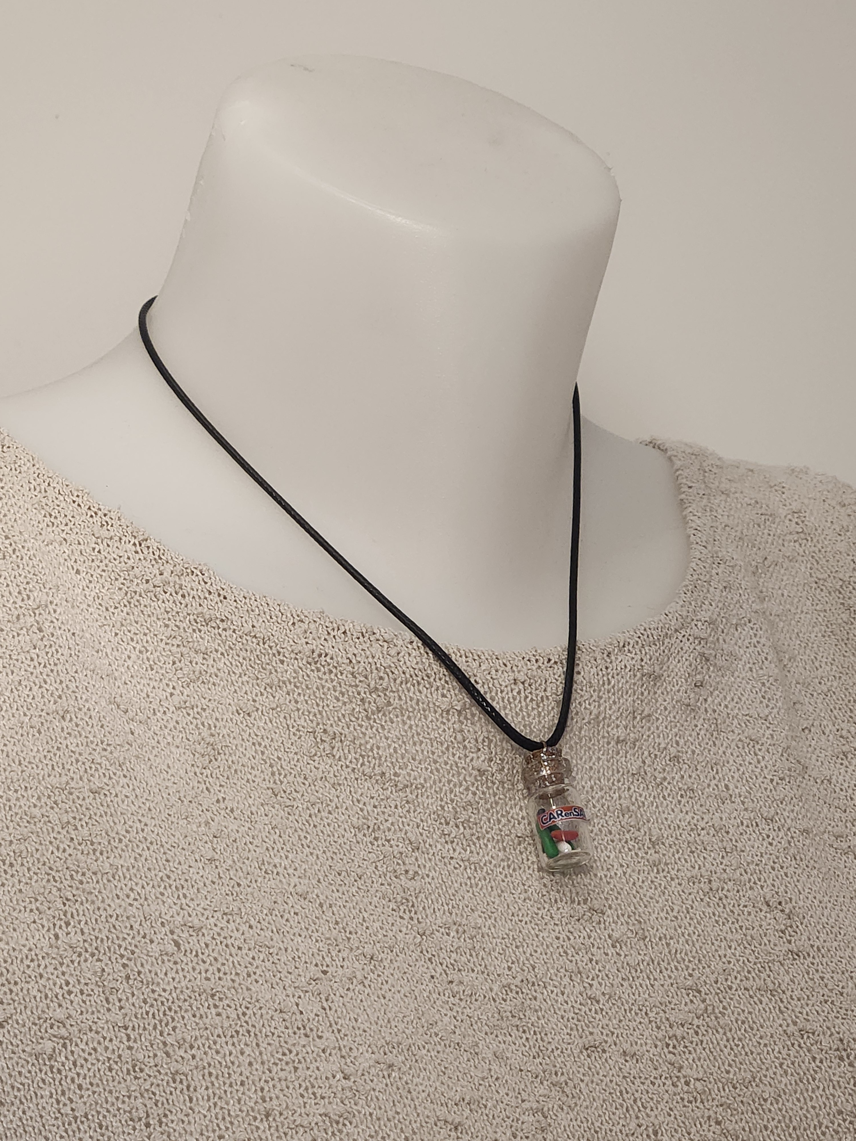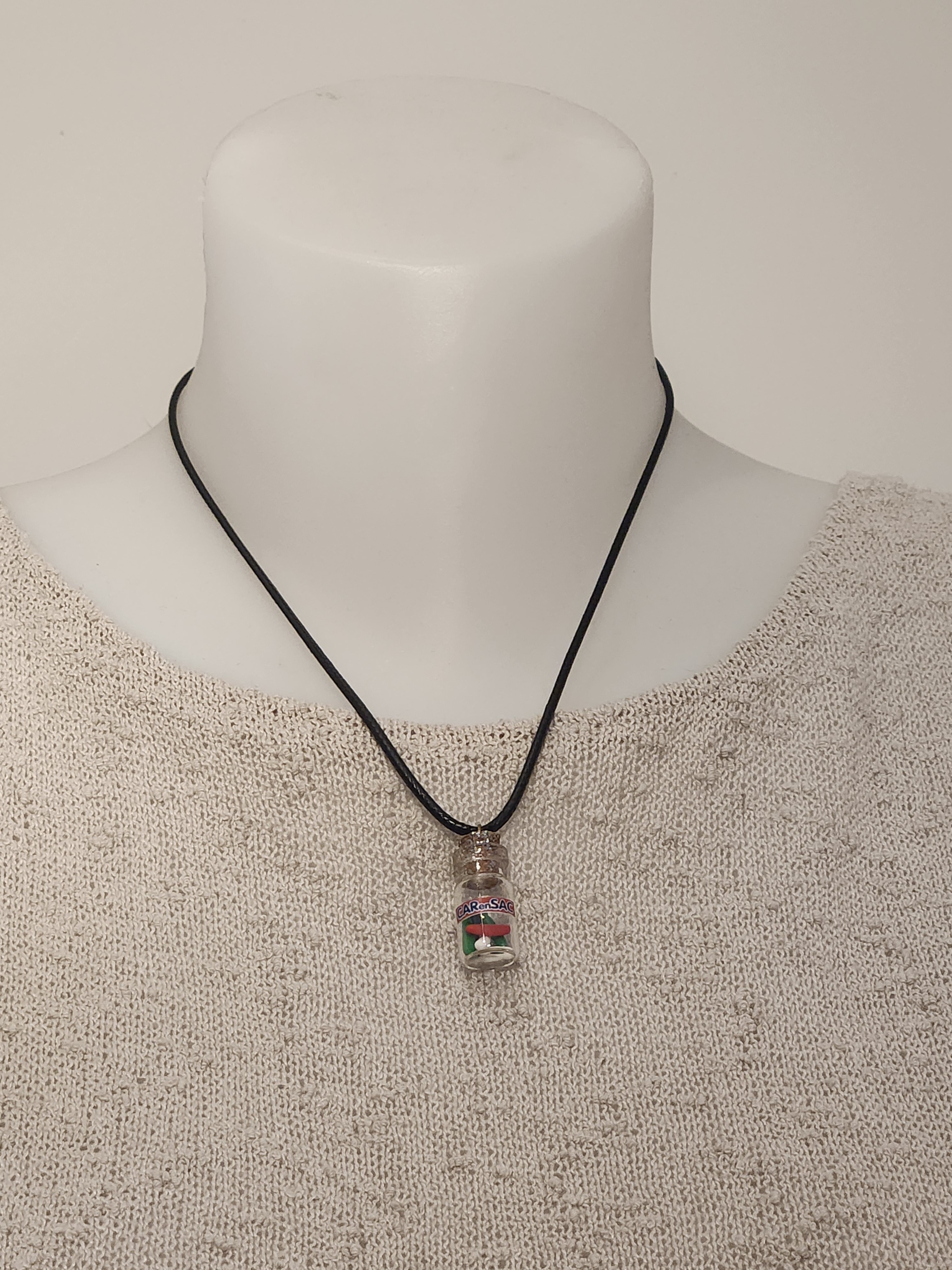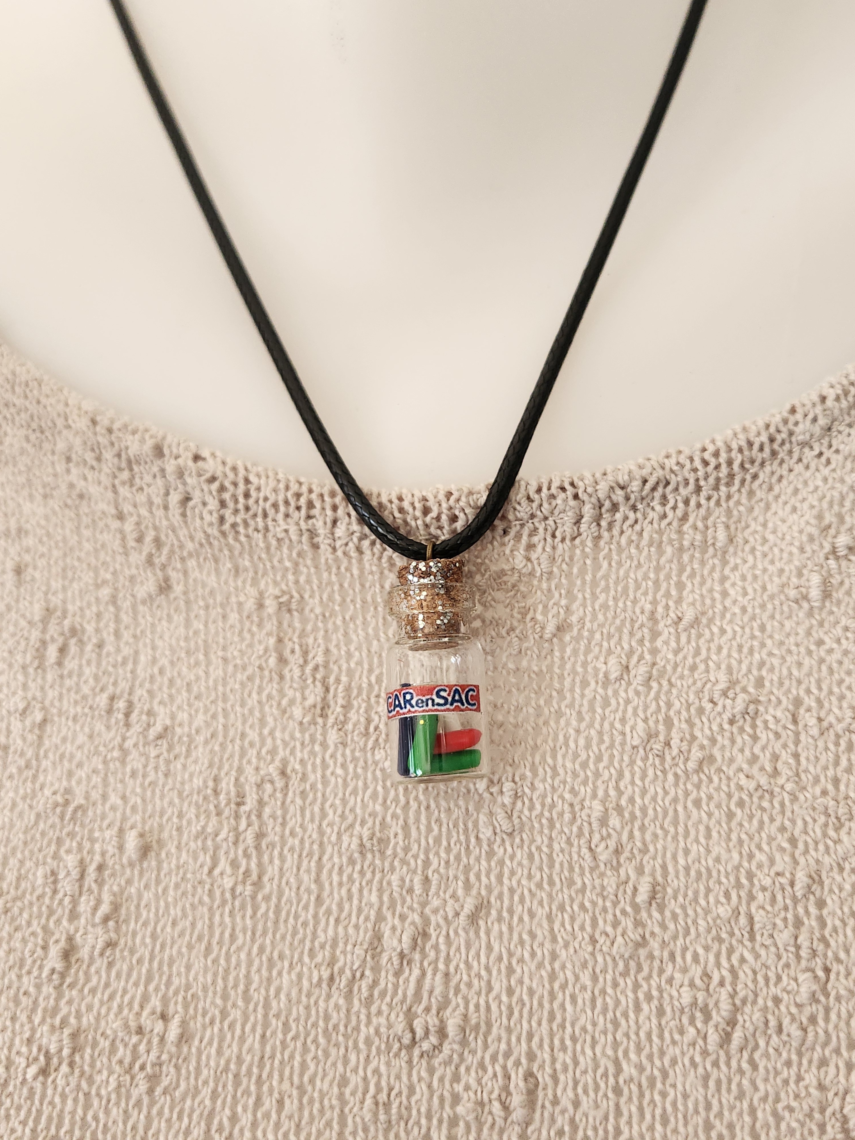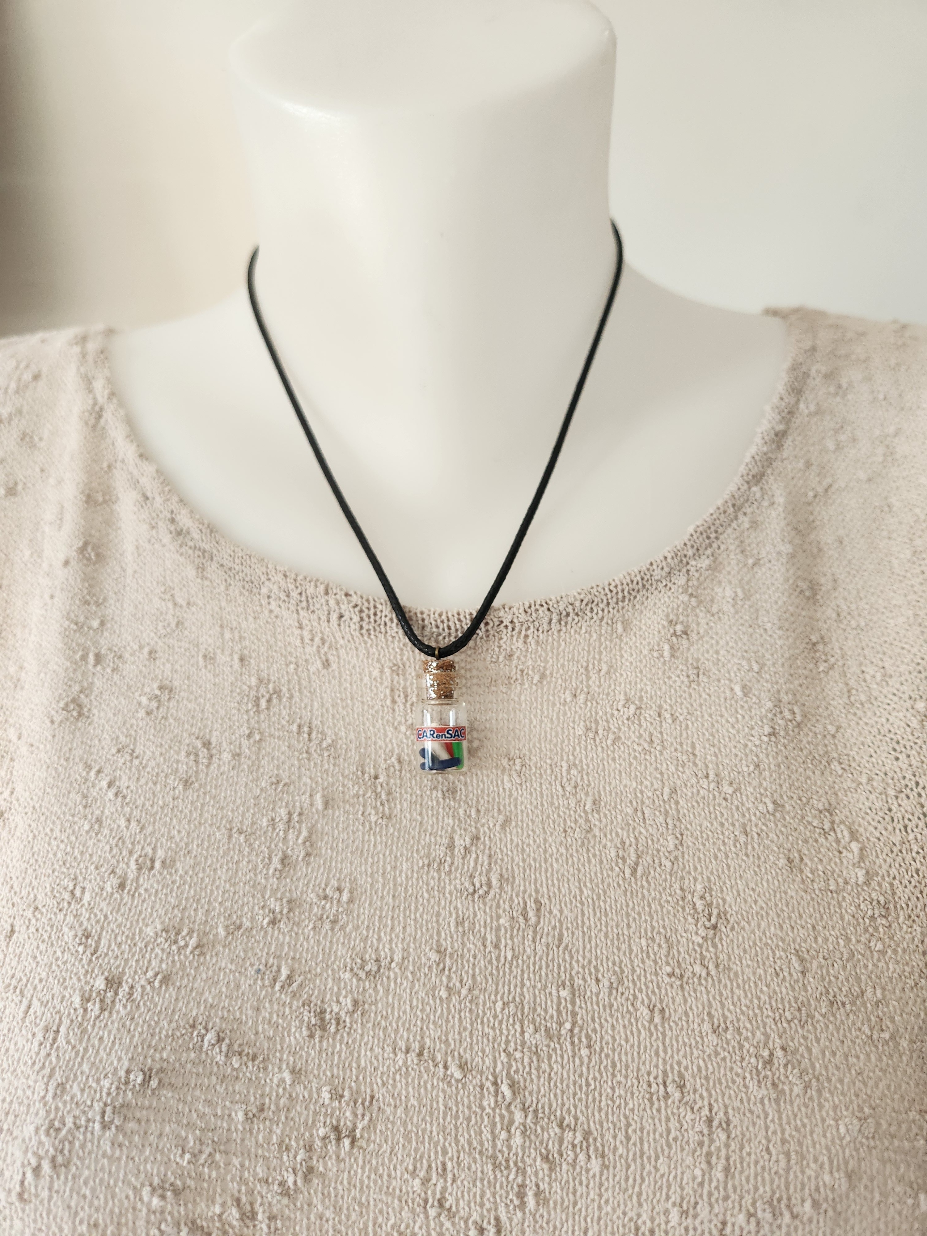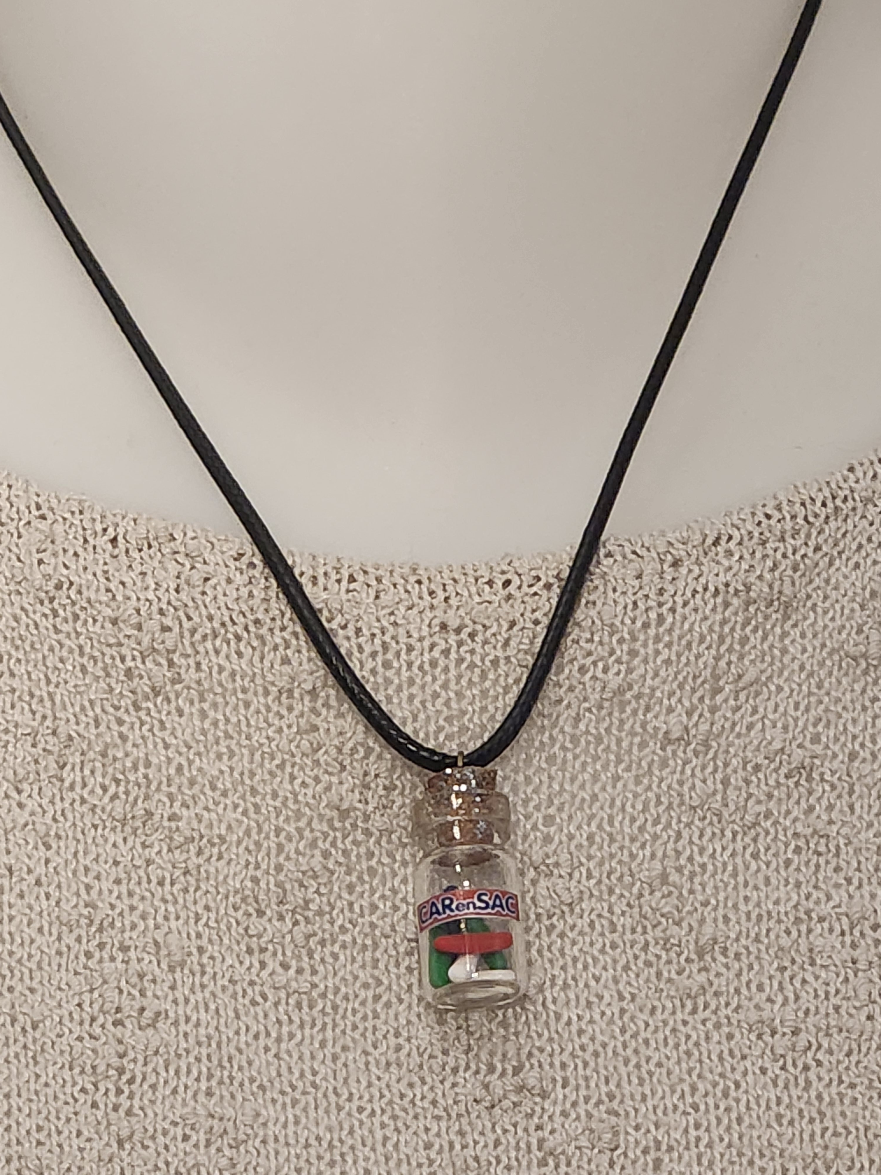 Je vous propose ce pendentif fiole des bonbons car en sac en polymère.