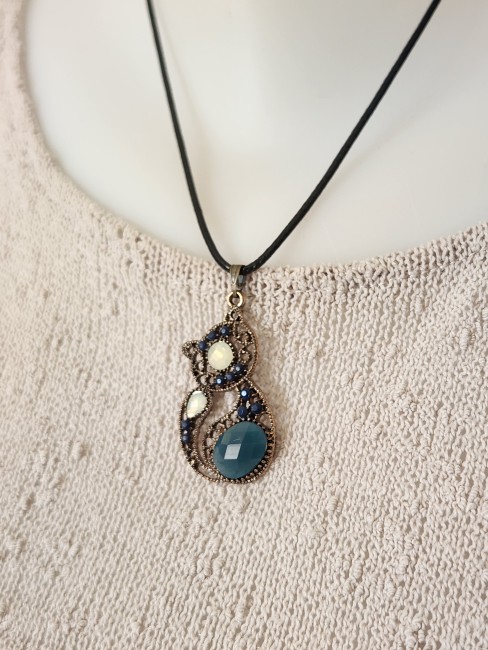 Je vous propose ce collier fantaisie chat avec strass bleu et crème, il est monté sur un cordon coton ciré noir.