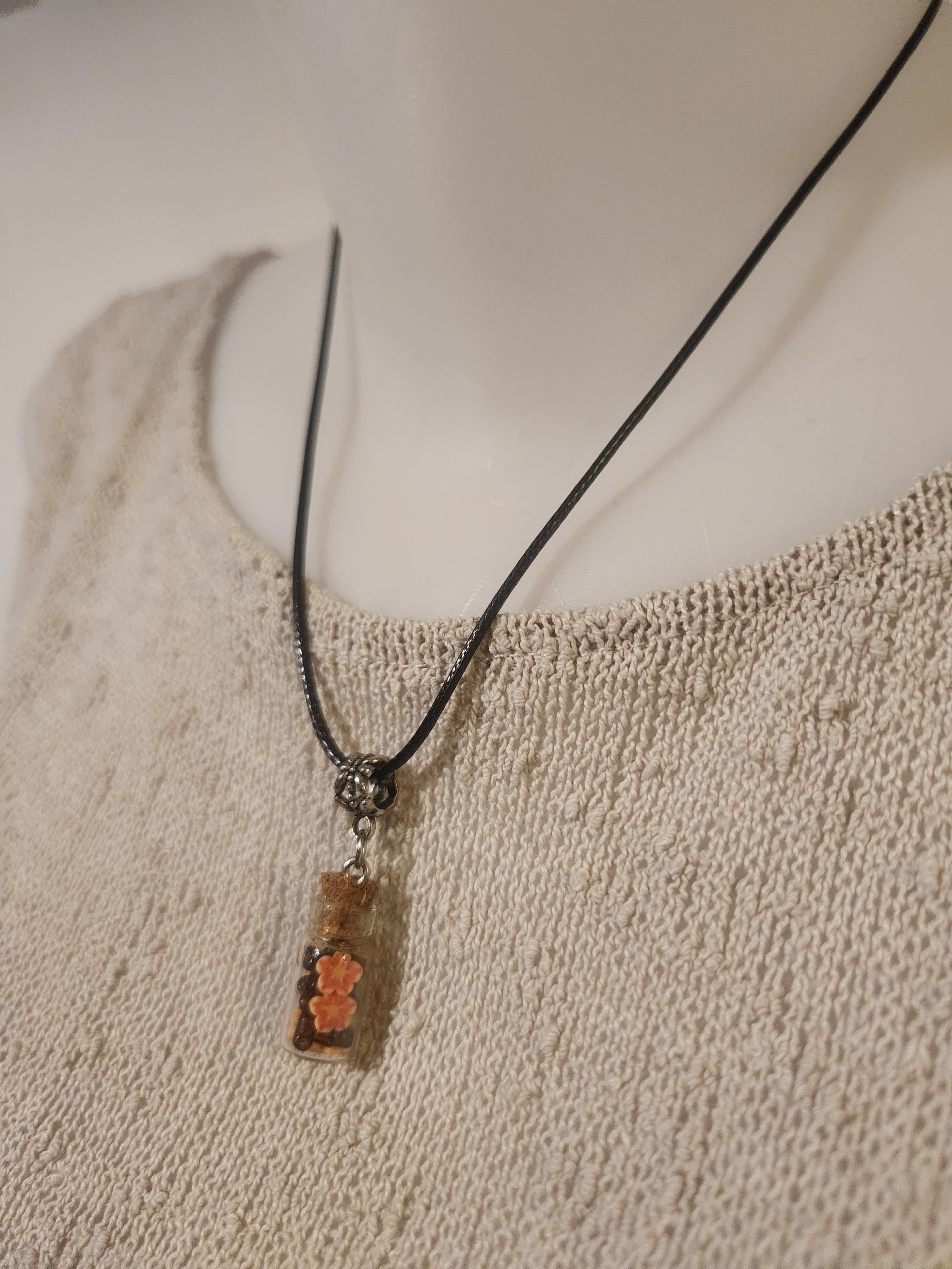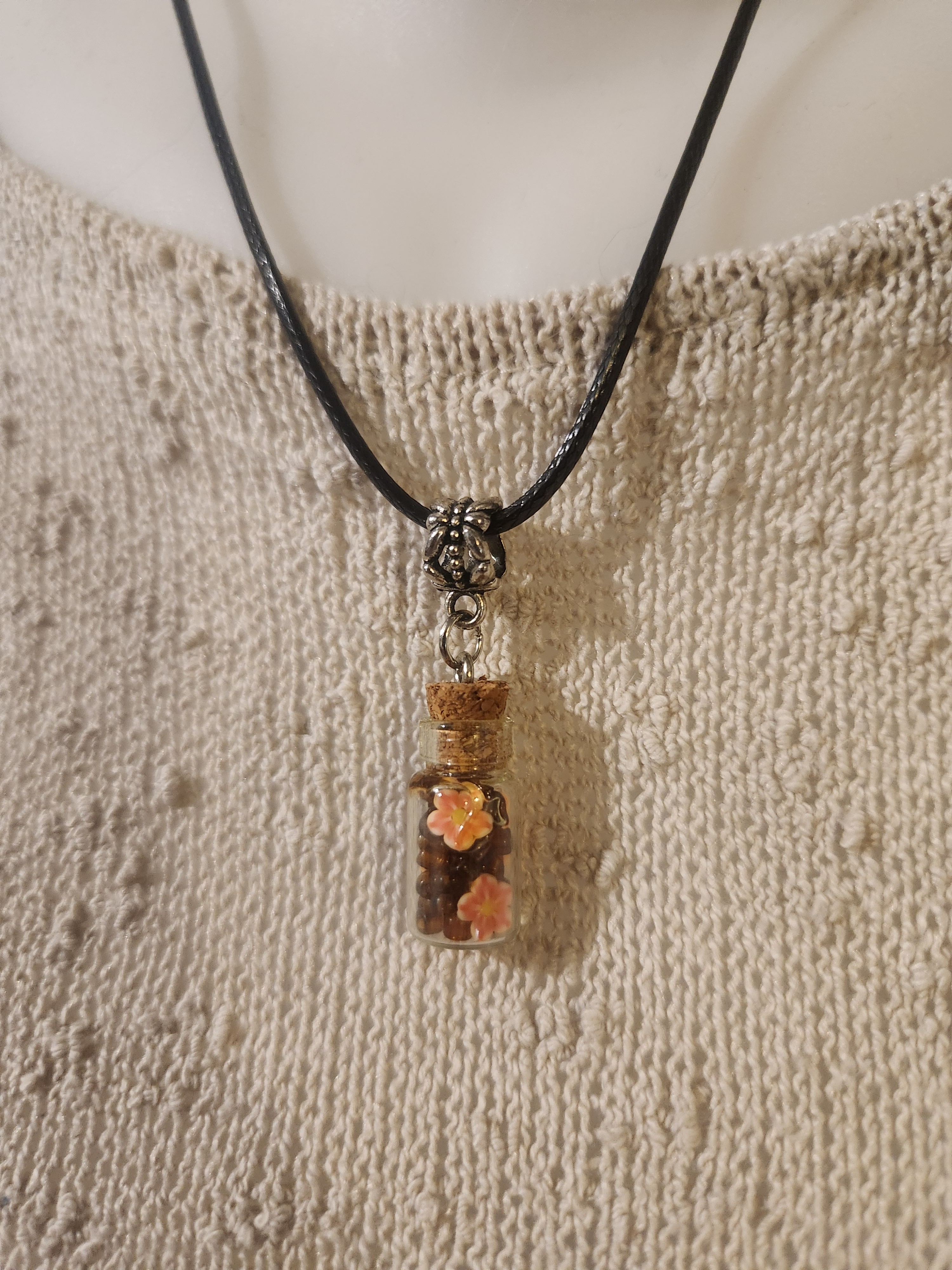 Je vous propose ce pendentif fiole, monté sur bélière, tour de cou coton ciré noir.