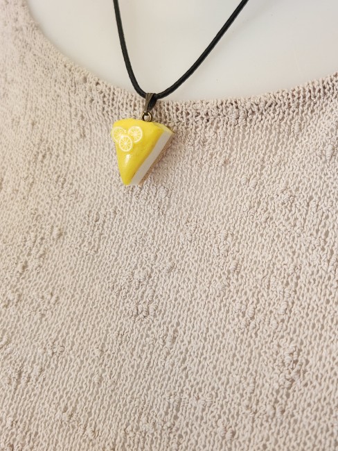 Je vous propose ce pendentif gourmand, part de tarte citron en polymère, monté sur cordon en coton ciré noir.