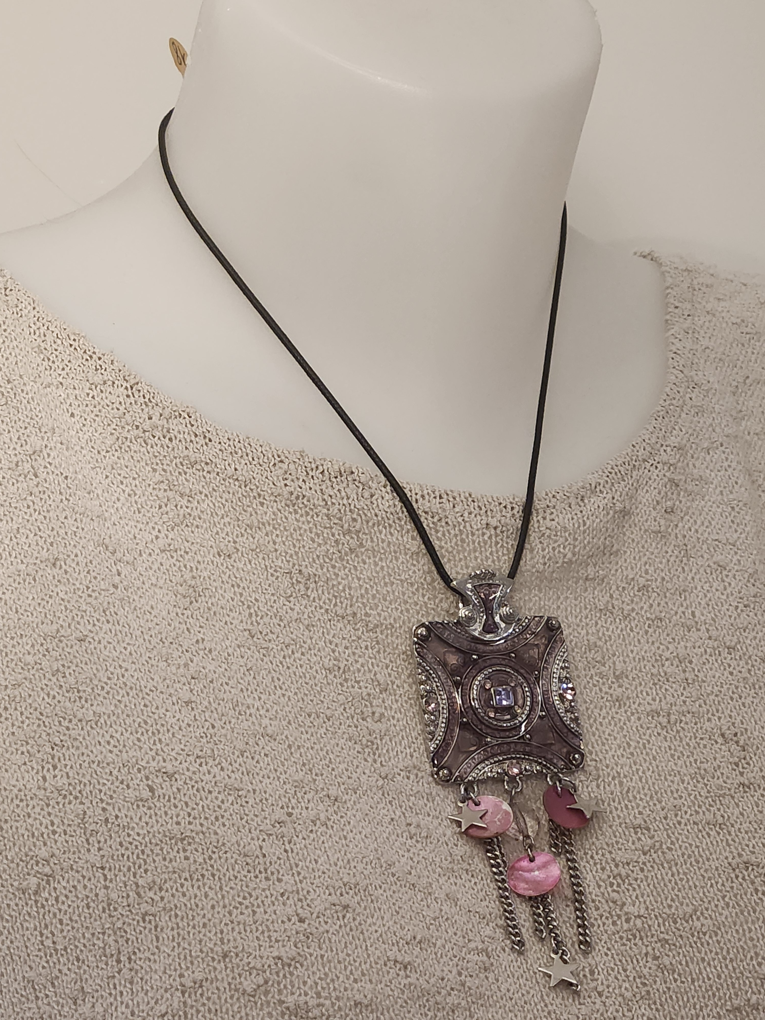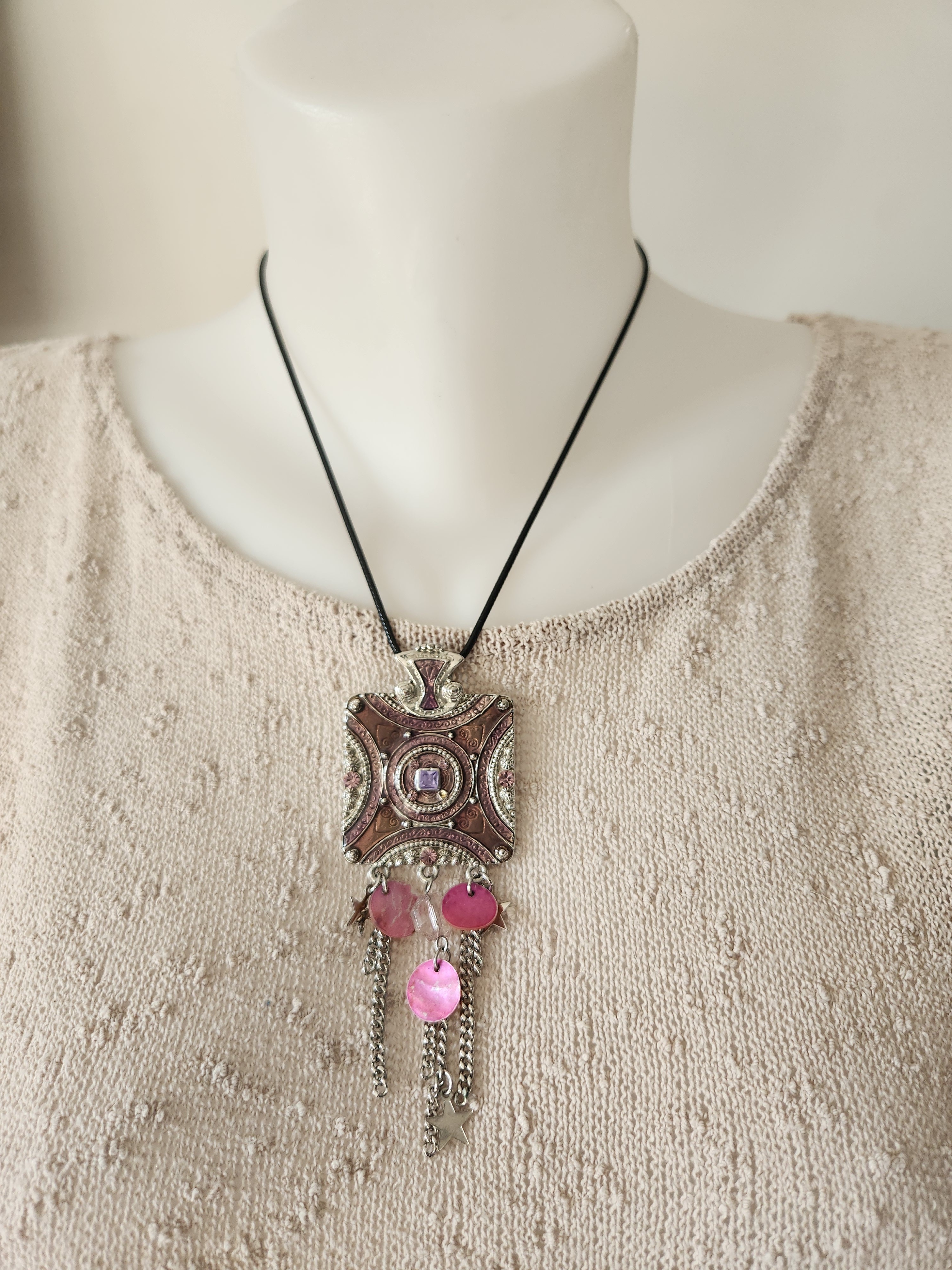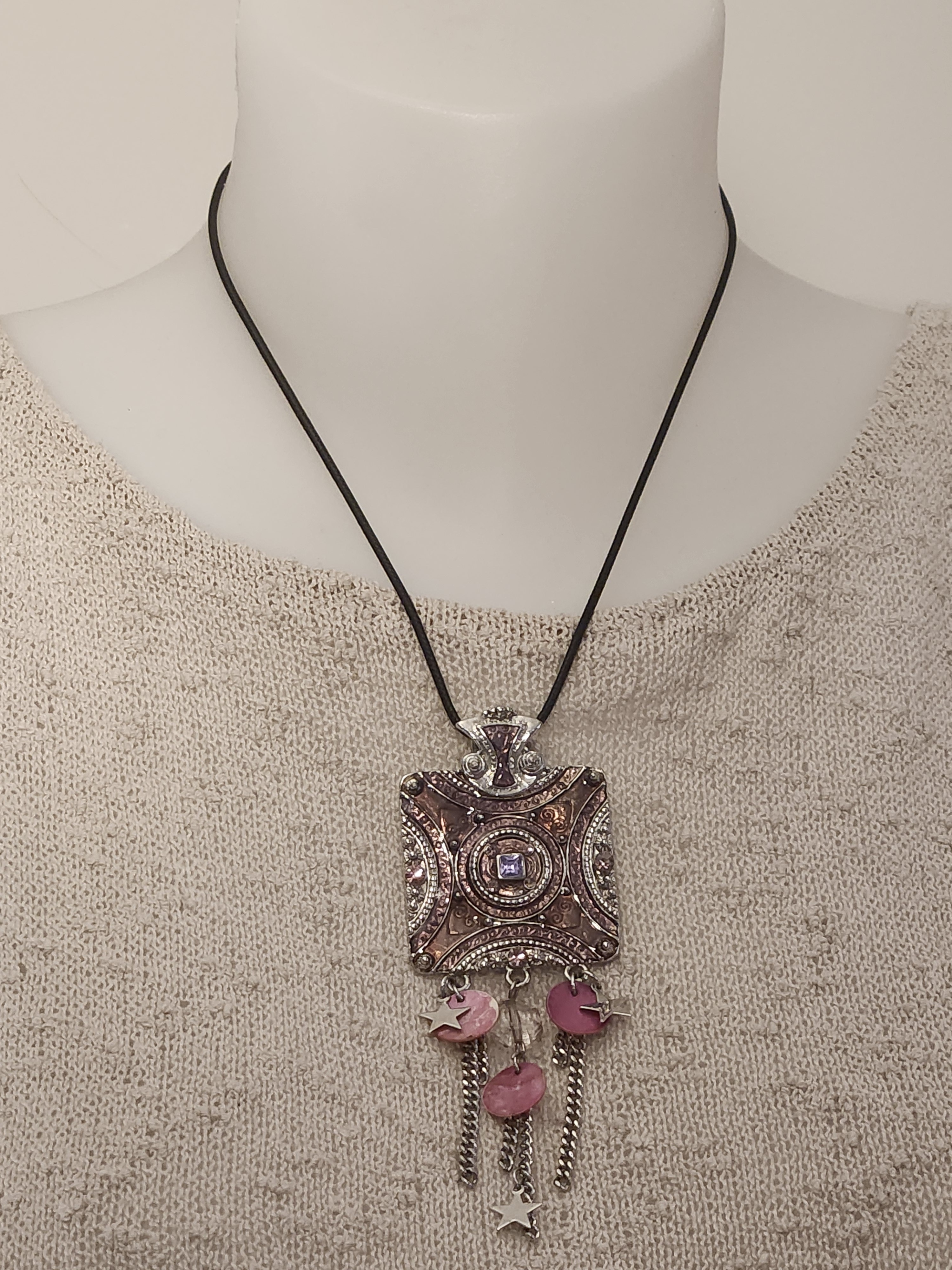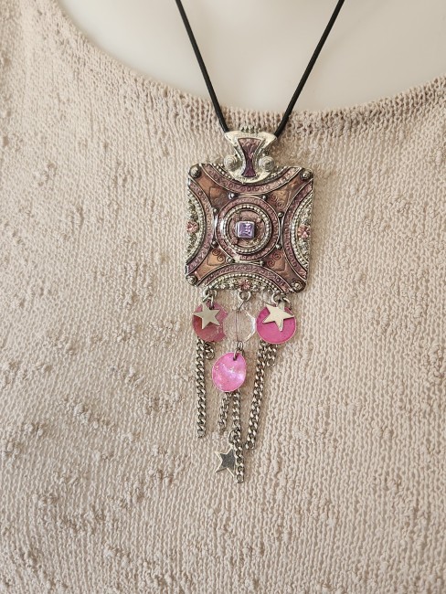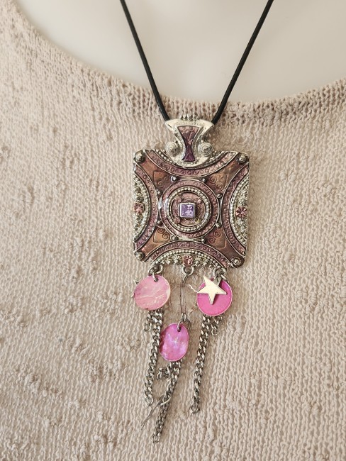 Je vous propose ce pendentif carré avec bélière intégré rose/violet en métal fantaisie argenté, il est résiné dans les coloris rose et violine.