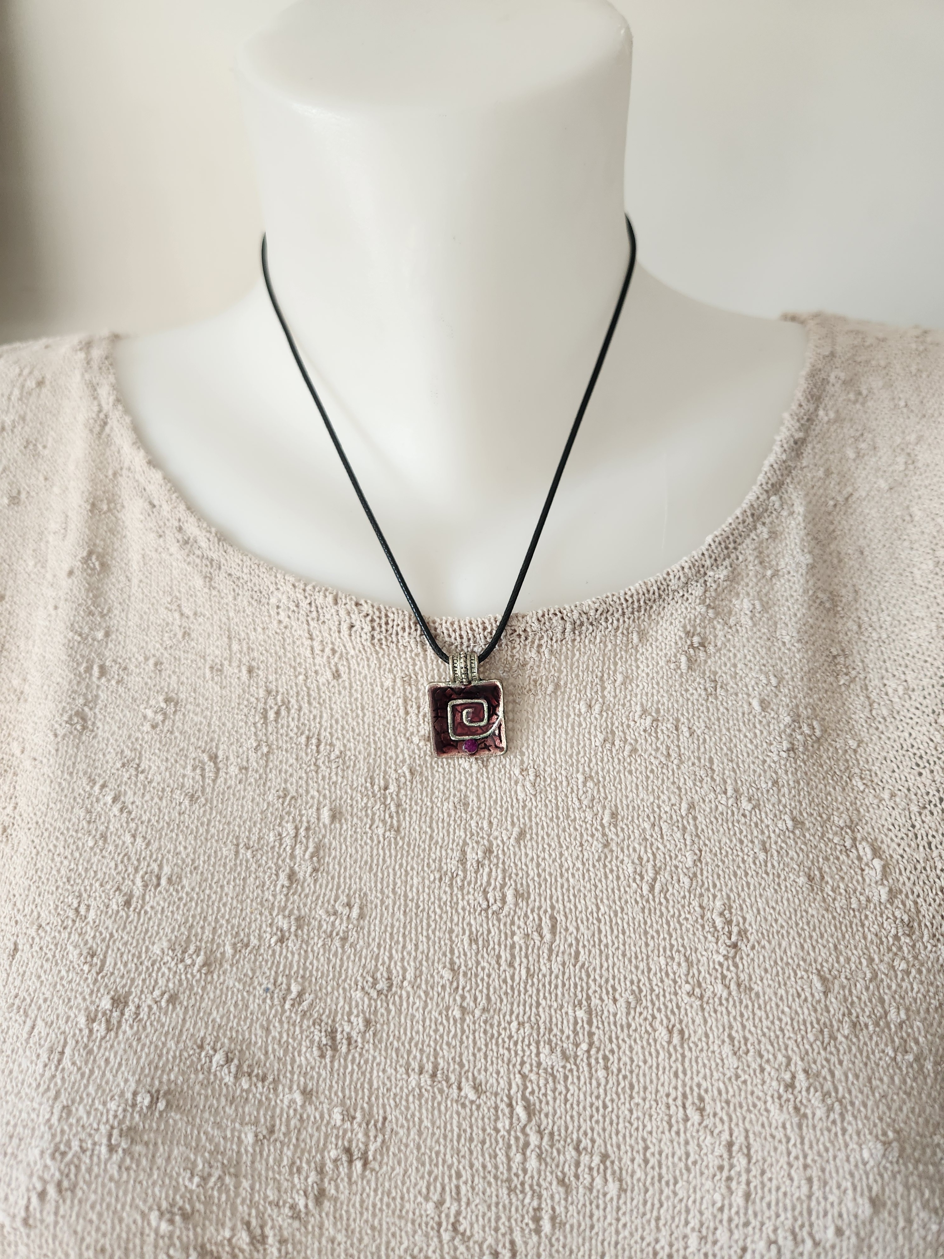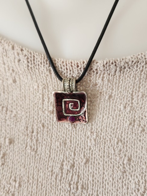 Je vous propose ce pendentif carré avec sa bélière intégré en métal fantaisie argenté, il est émaillé. Ton de violet avec strass.