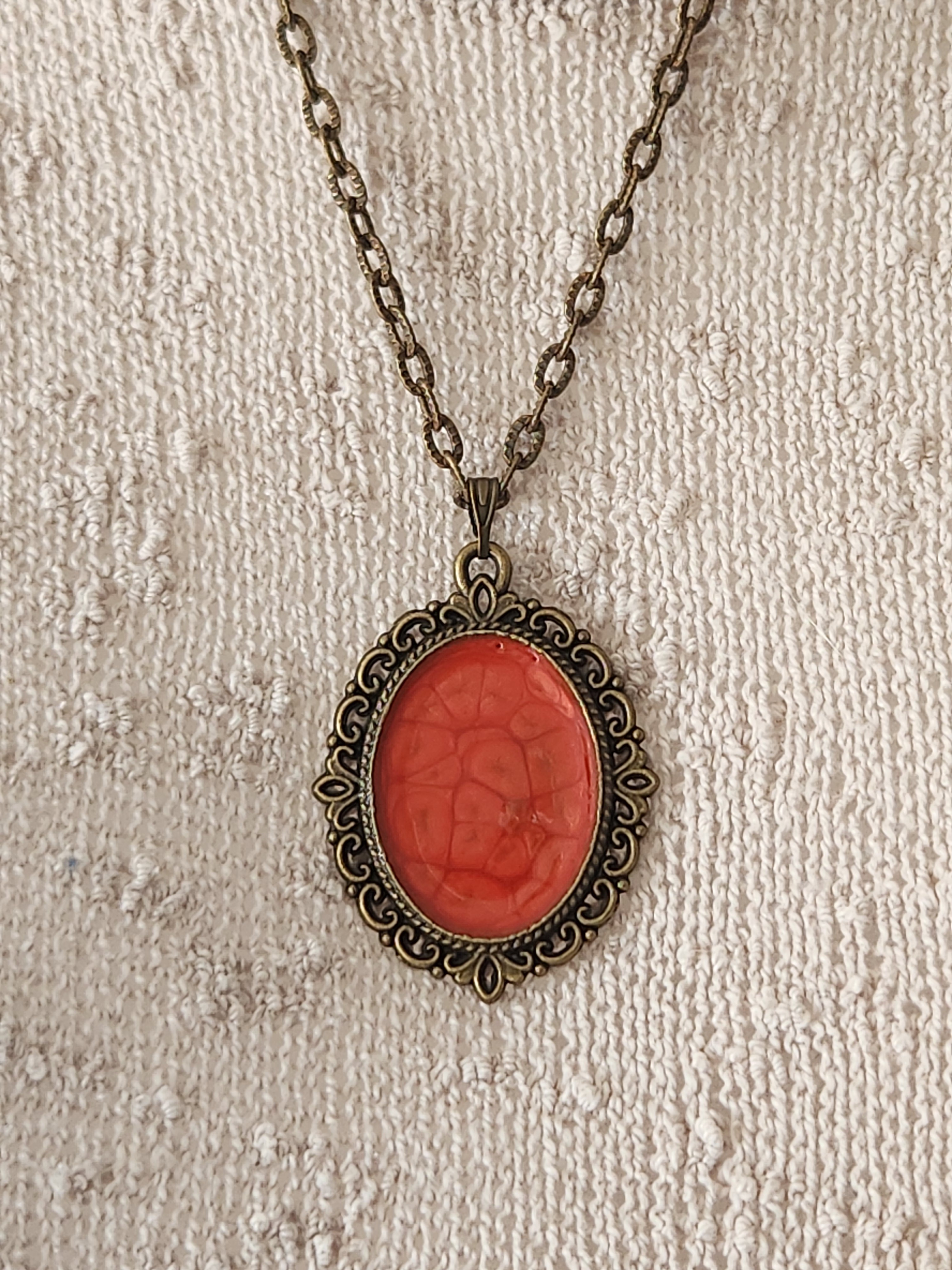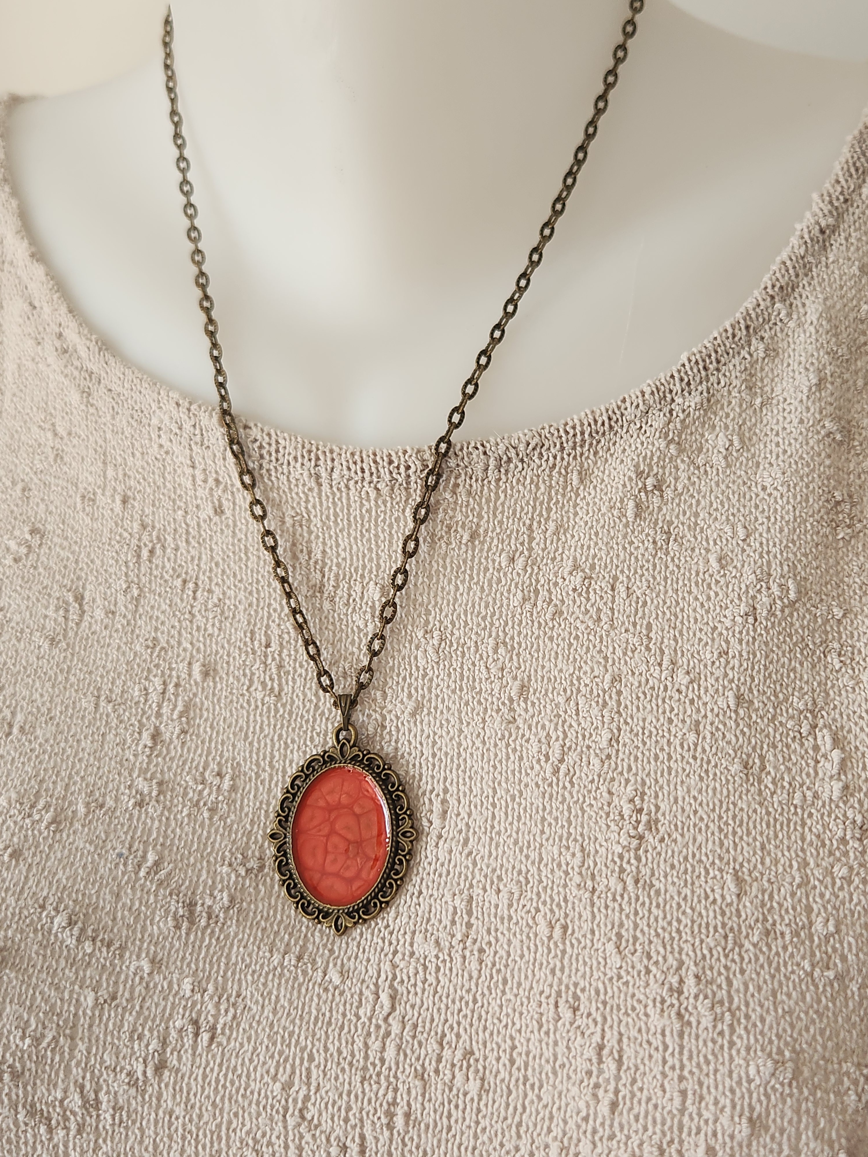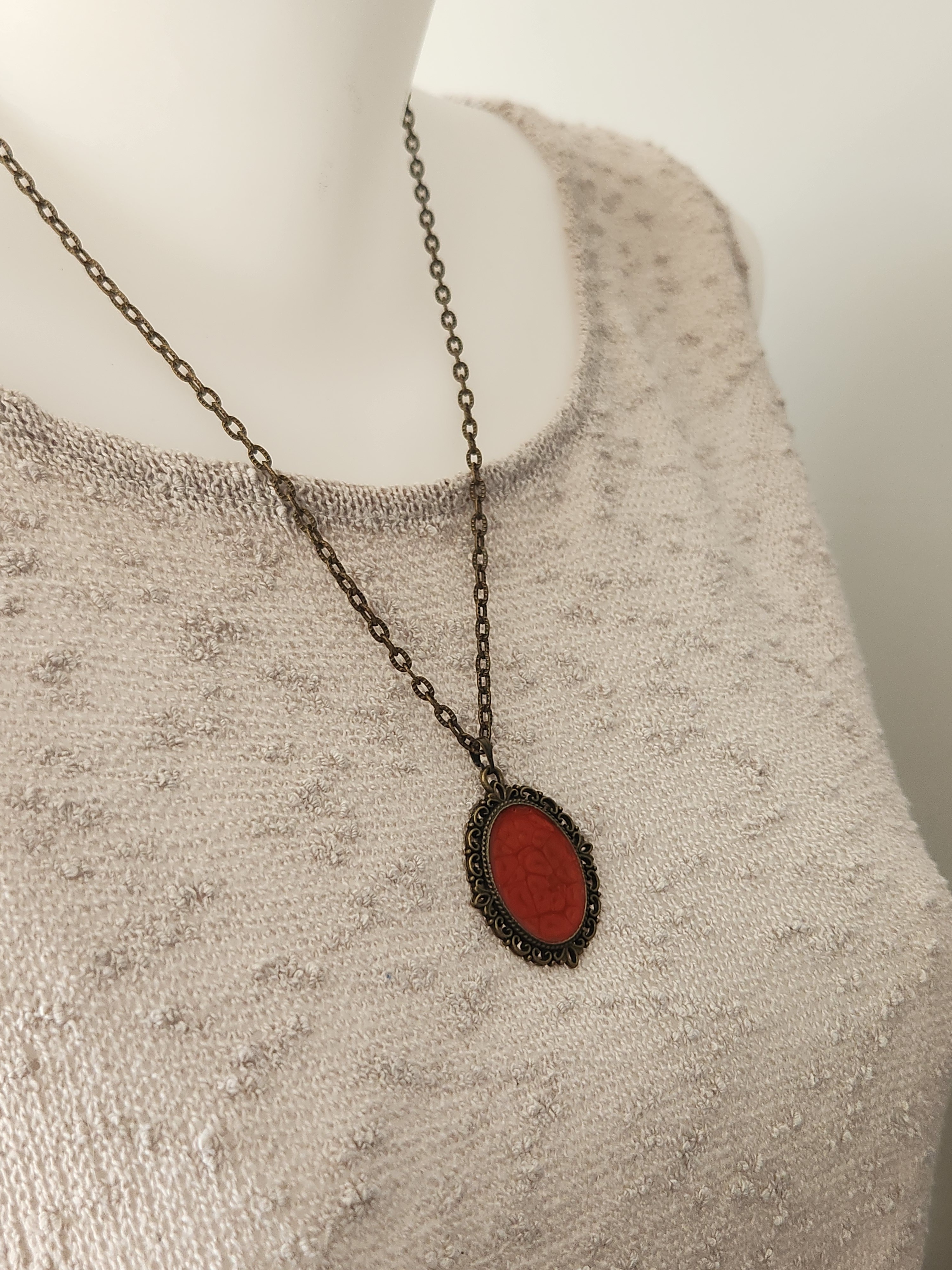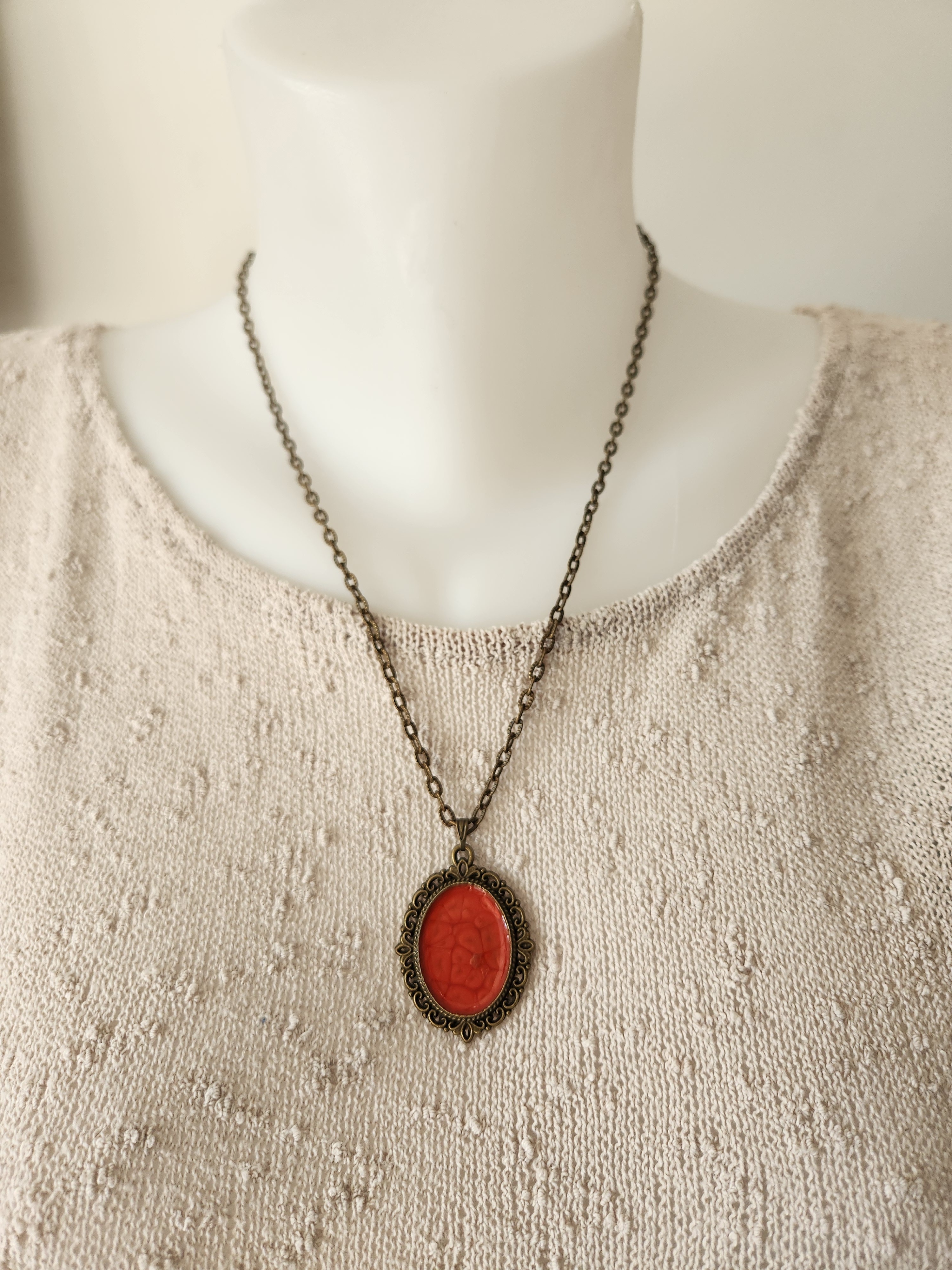 Je vous propose ce collier avec son pendentif en bronze à effet de couleur rouge
