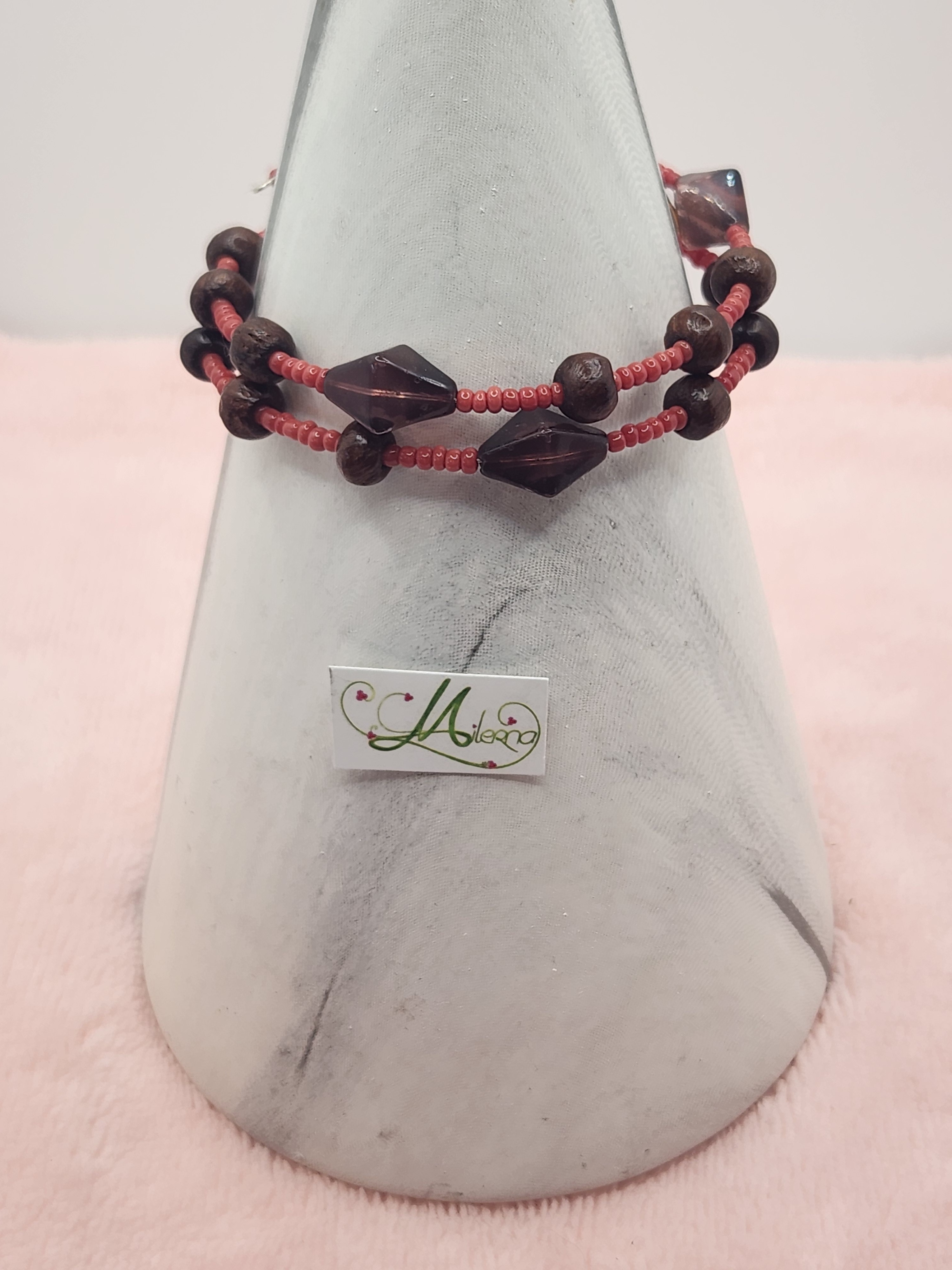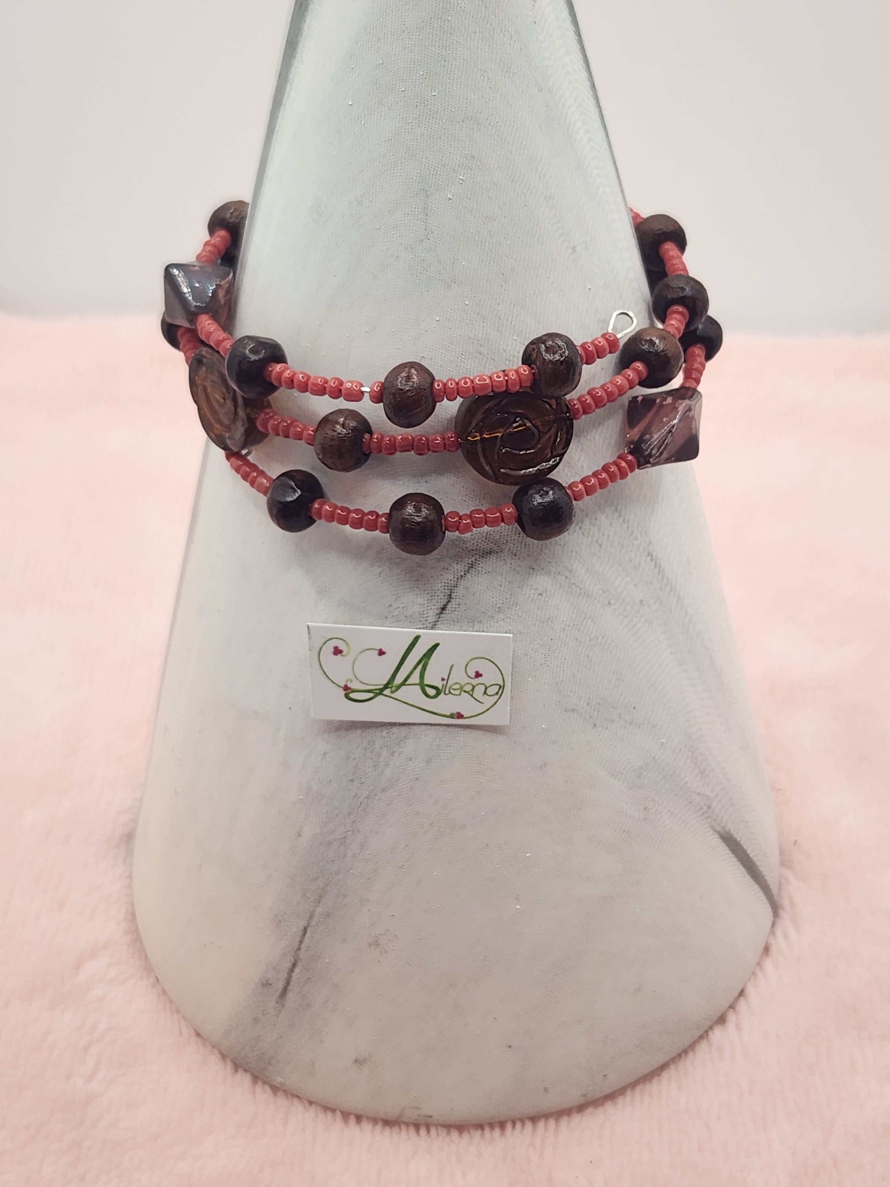 Il se compose de perles de rocaille rouille, perles en bois et de perles à facettes de couleur marron,