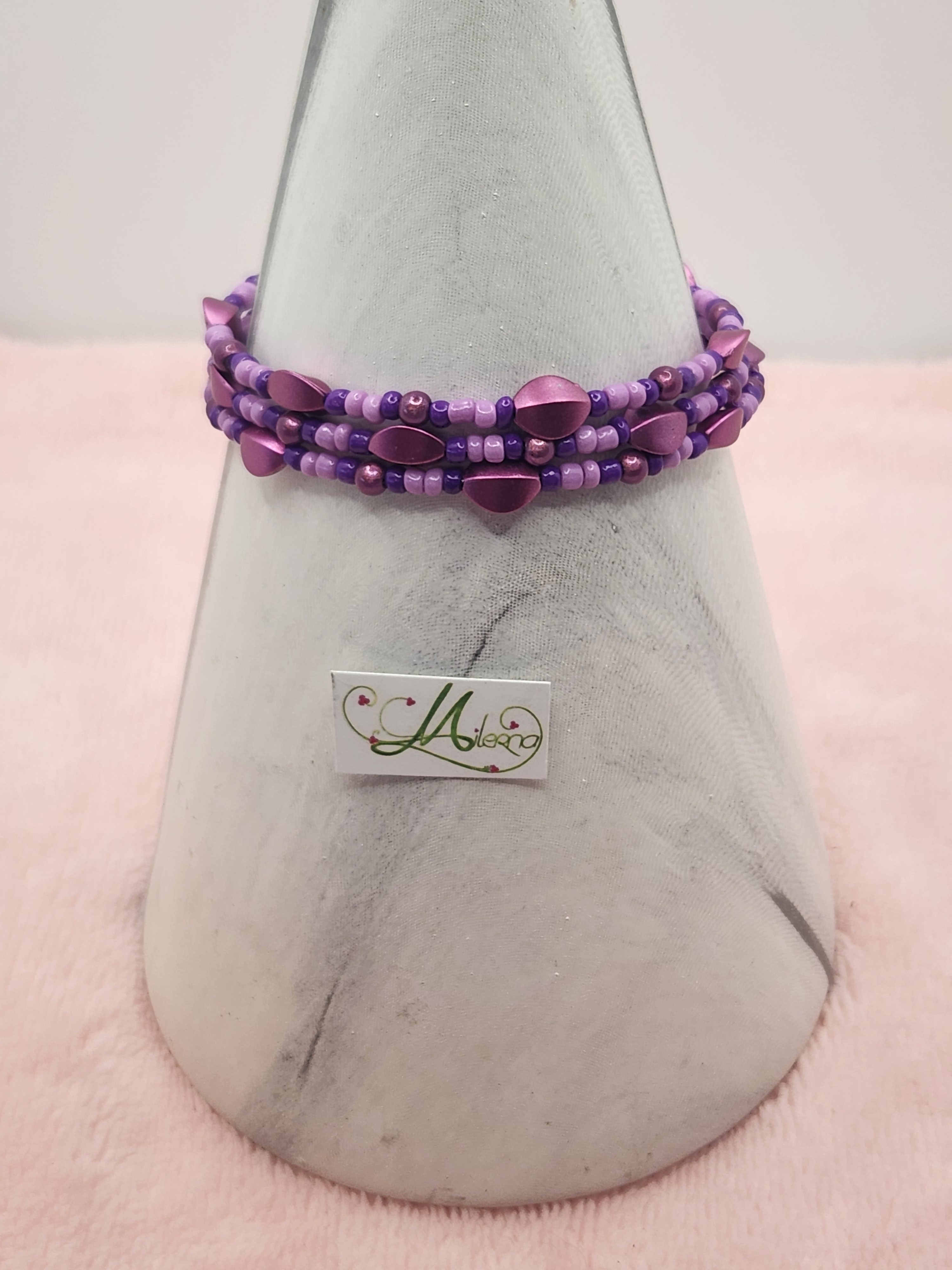 Il se compose de perles de rocaille violet clair et foncé, perles ronde brillante et perles à facettes dans les tons de violet.