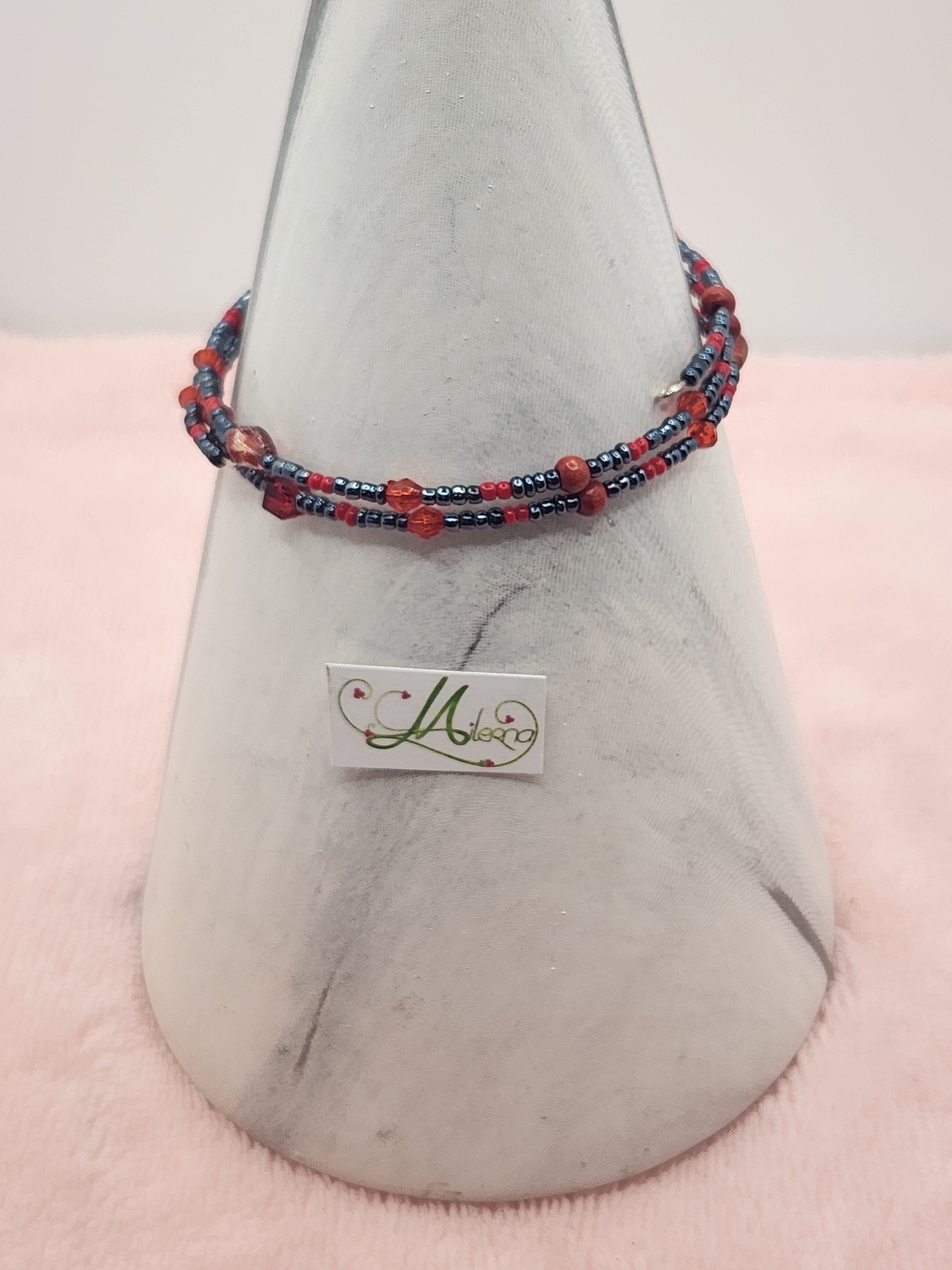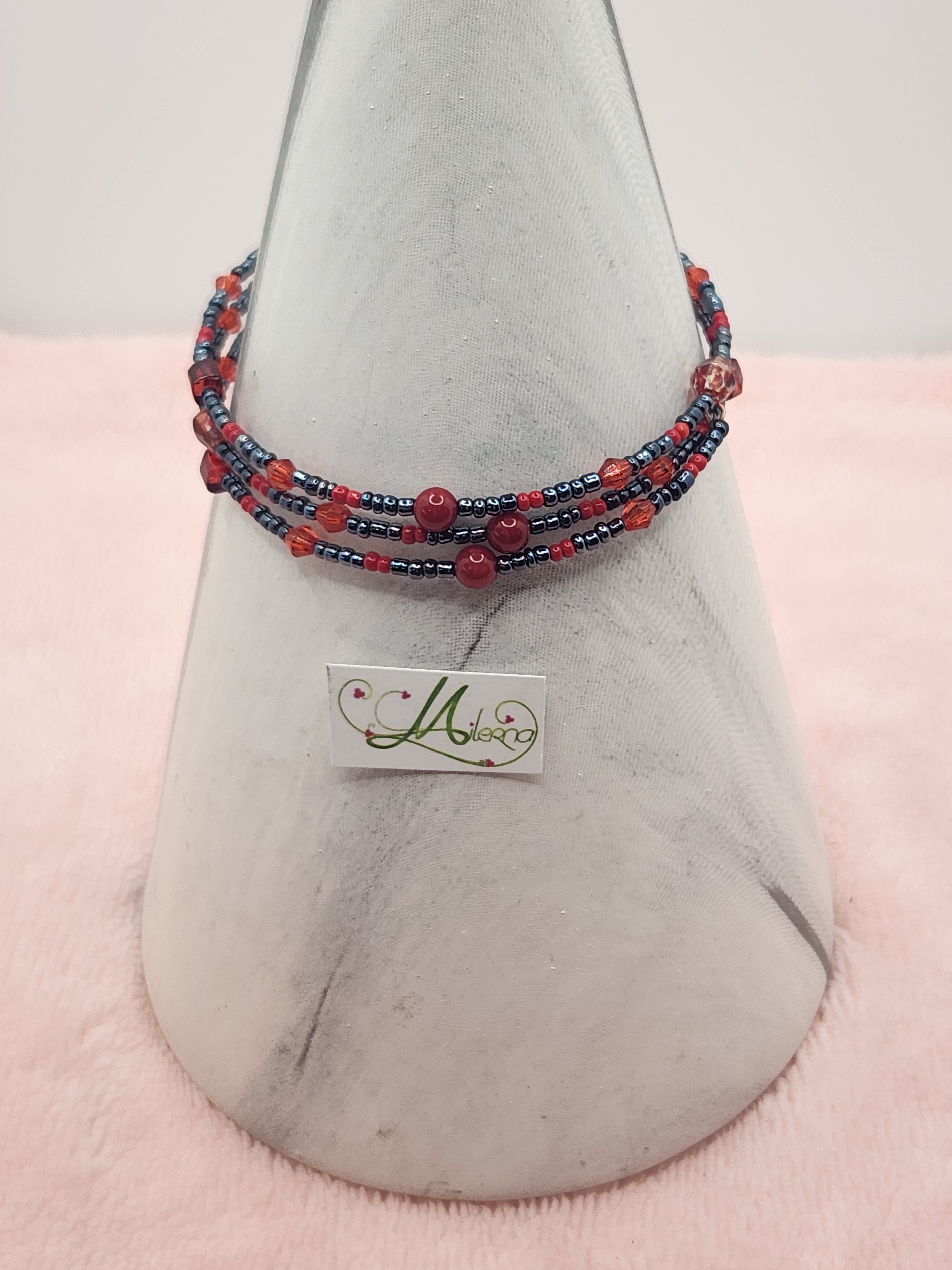 Il se compose de perles de rocaille rouge et grise, perles carrés, à facette, ronde de couleur rouge.