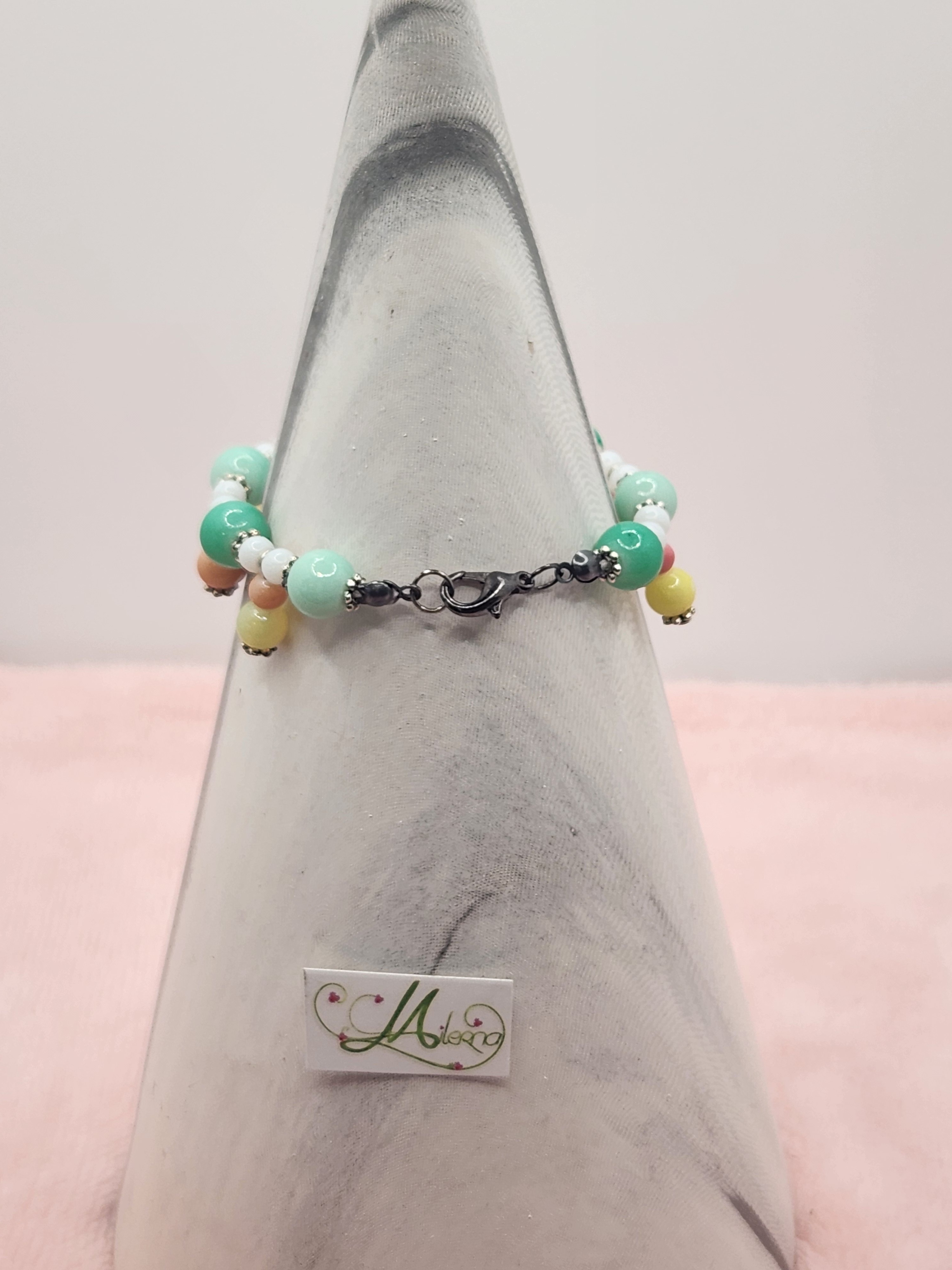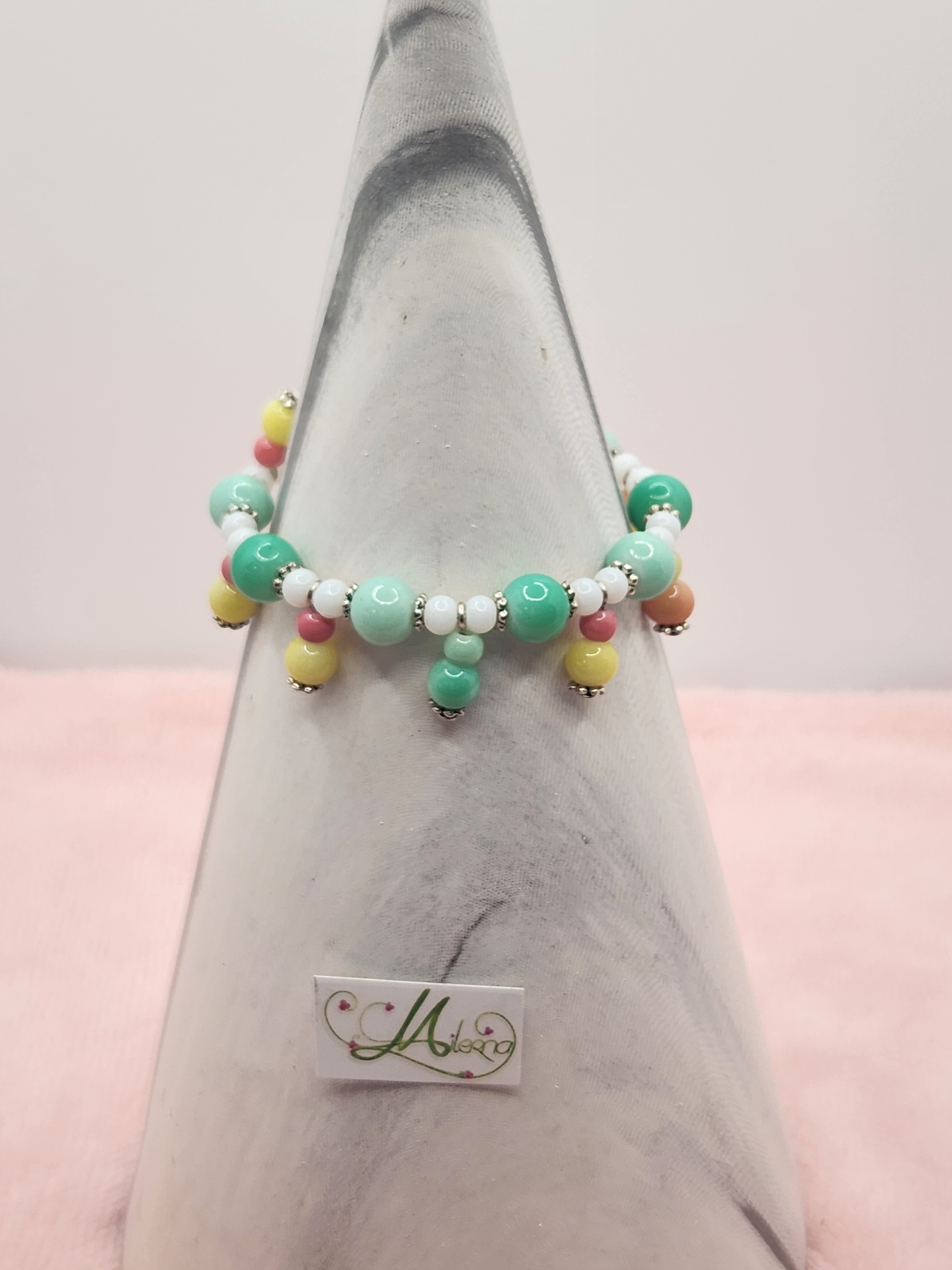Je vous propose ce bracelet enfant/ado en perles tons de jaune, blanc, vert et rose.