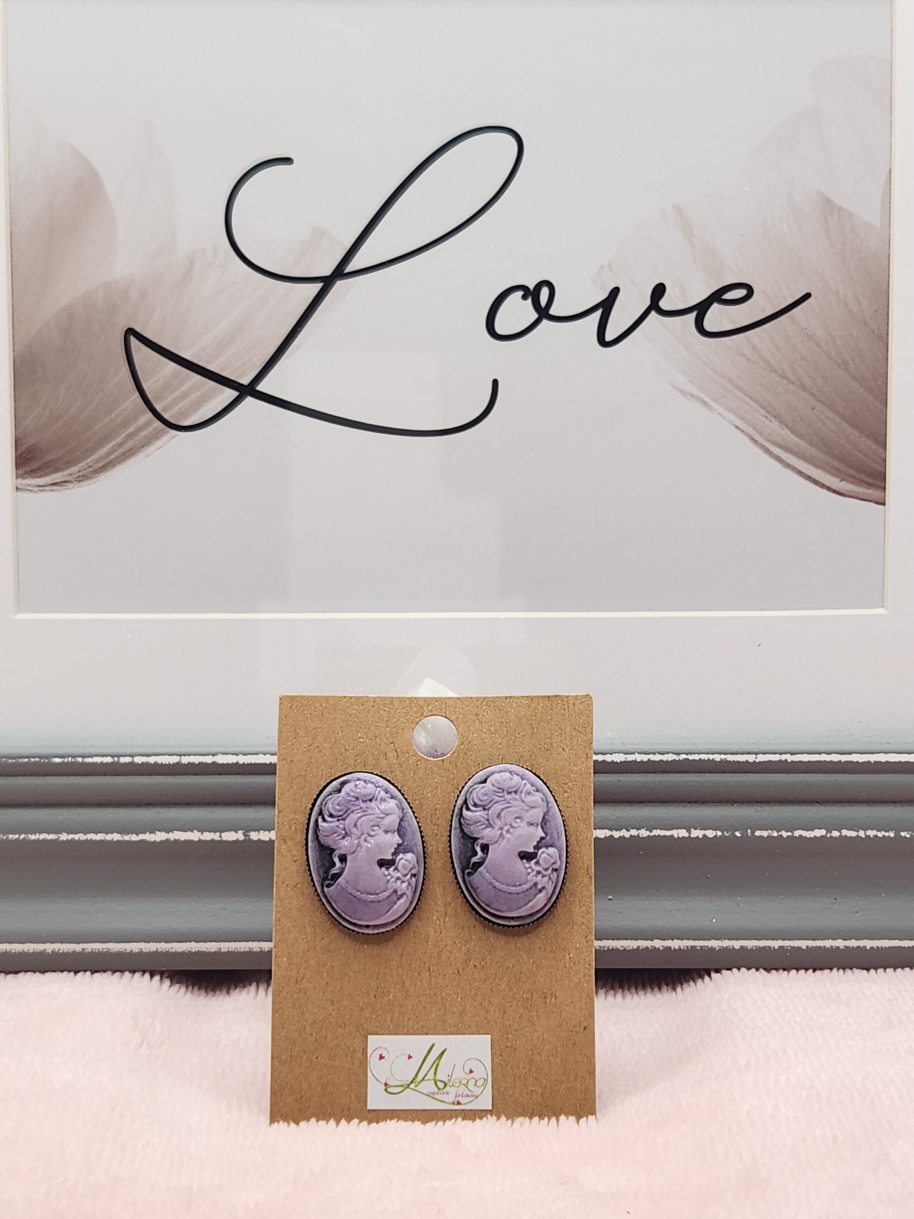 Boucles d'oreilles fantaisie cabochon camé en bronze, coloris ton de violet.
