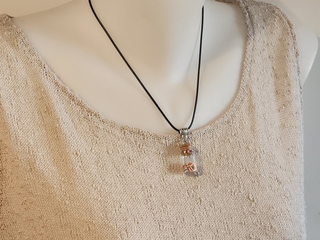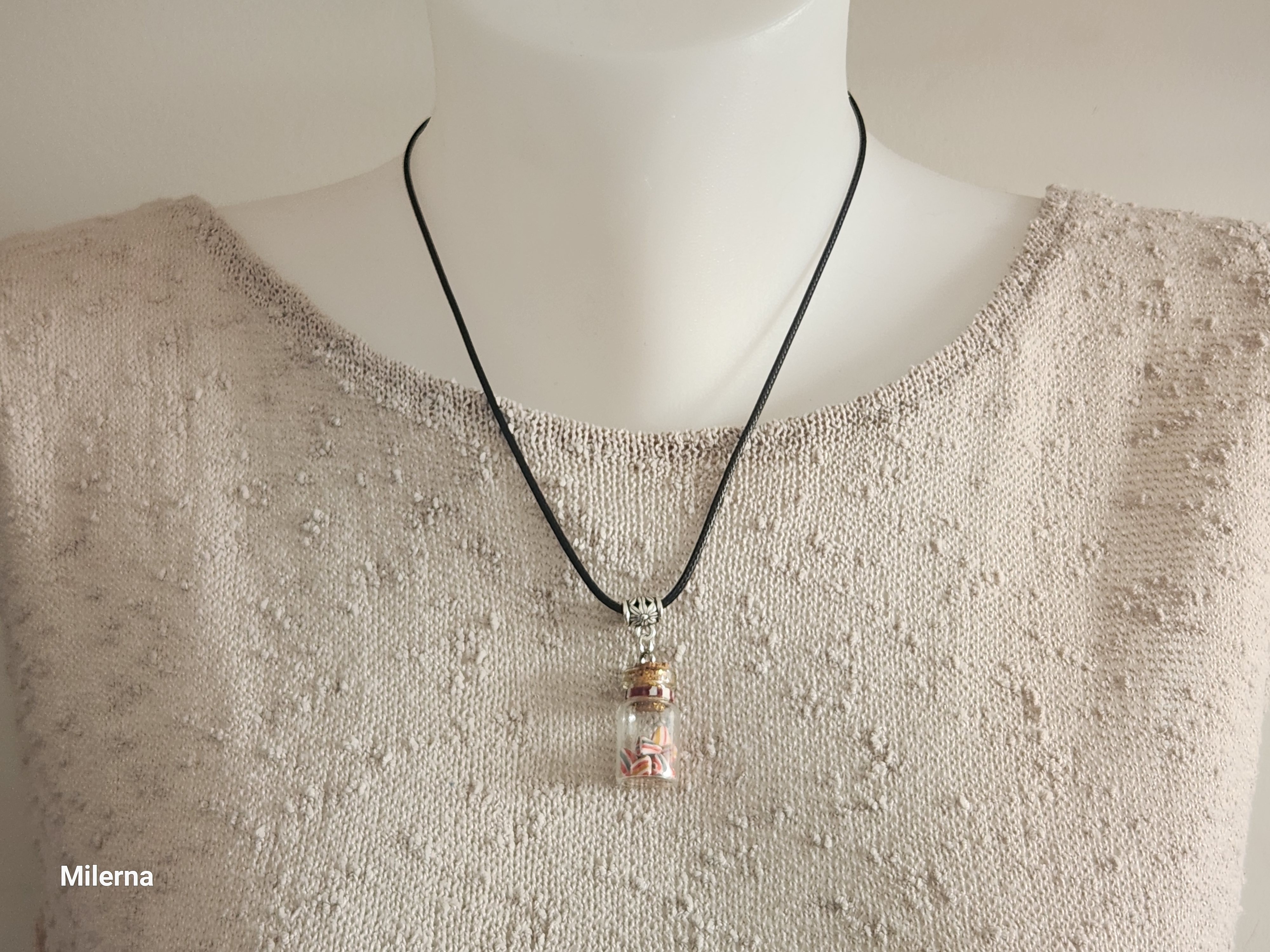 Je vous propose ce pendentif gourmand, fiole berlingots en polymère, longueur environ 25 cm + chainette, tour de cou en coton noir ciré.