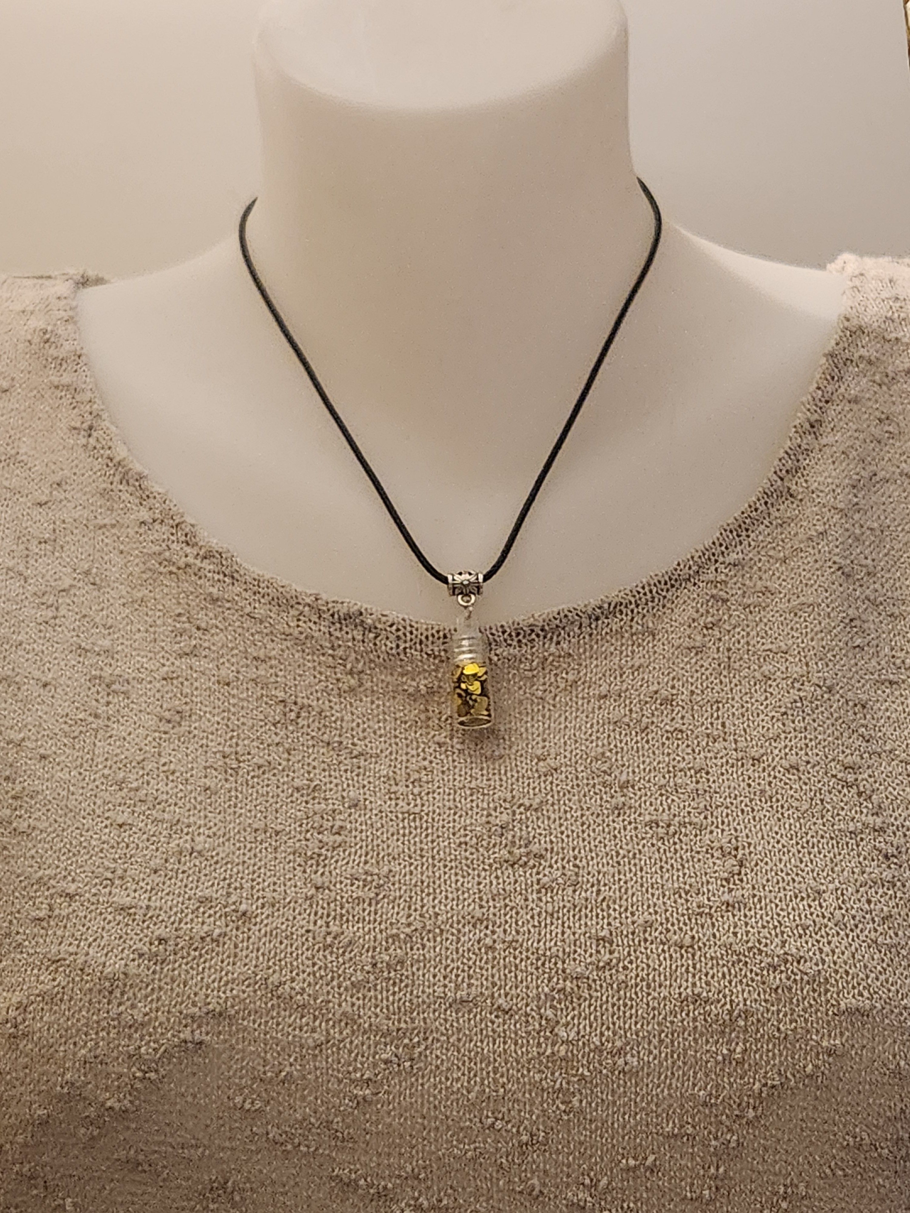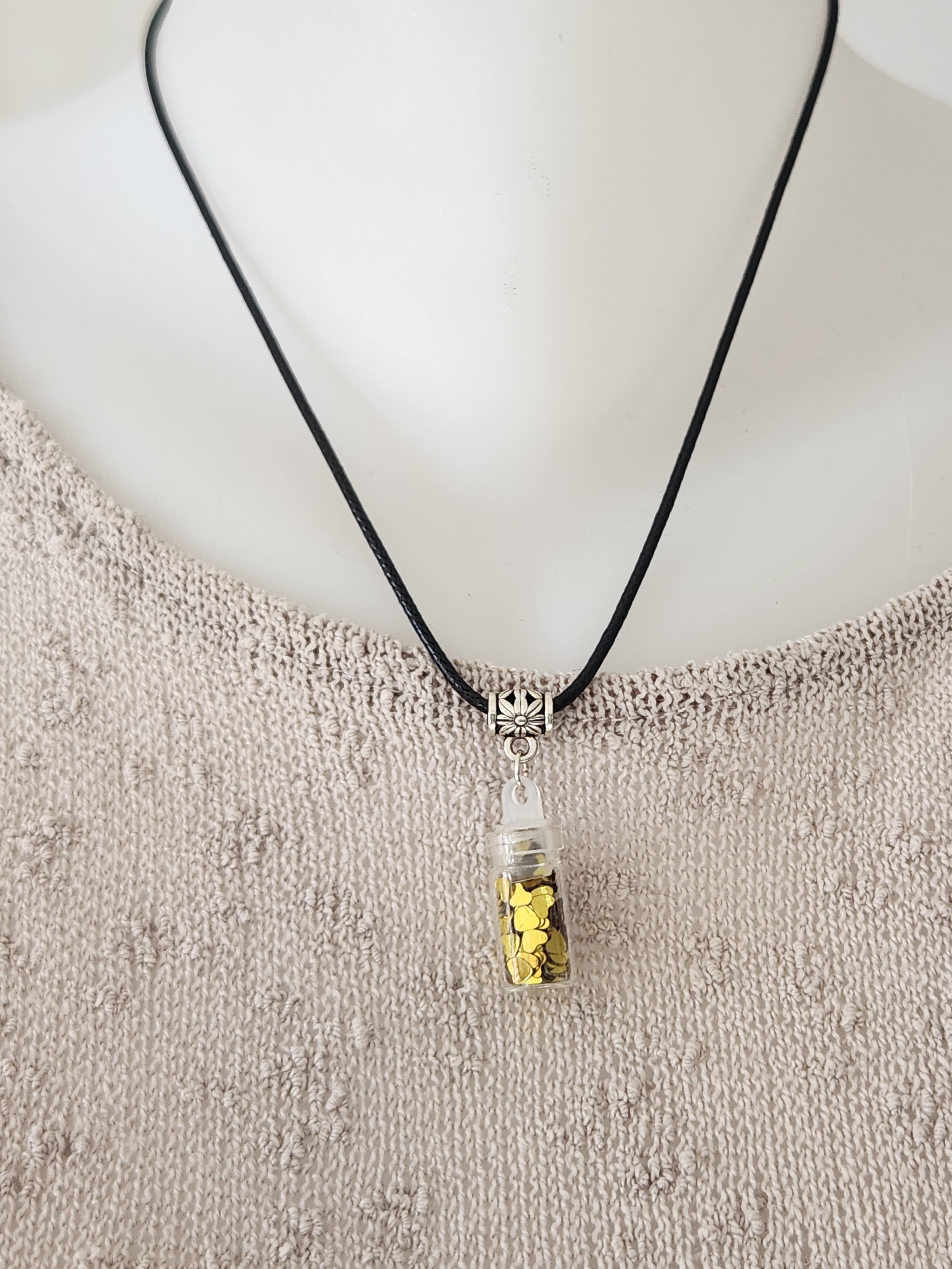 Je vous propose ce pendentif fiole avec cœurs dorés, tour de cou en coton de couleur noir.