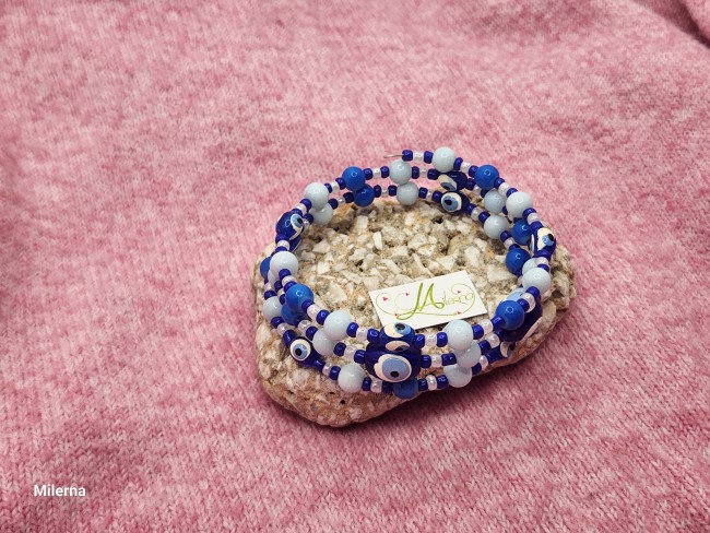 Il se compose de perles dans les tons de bleu avec 2 grosses perles 3ième oeil et 8 petites.