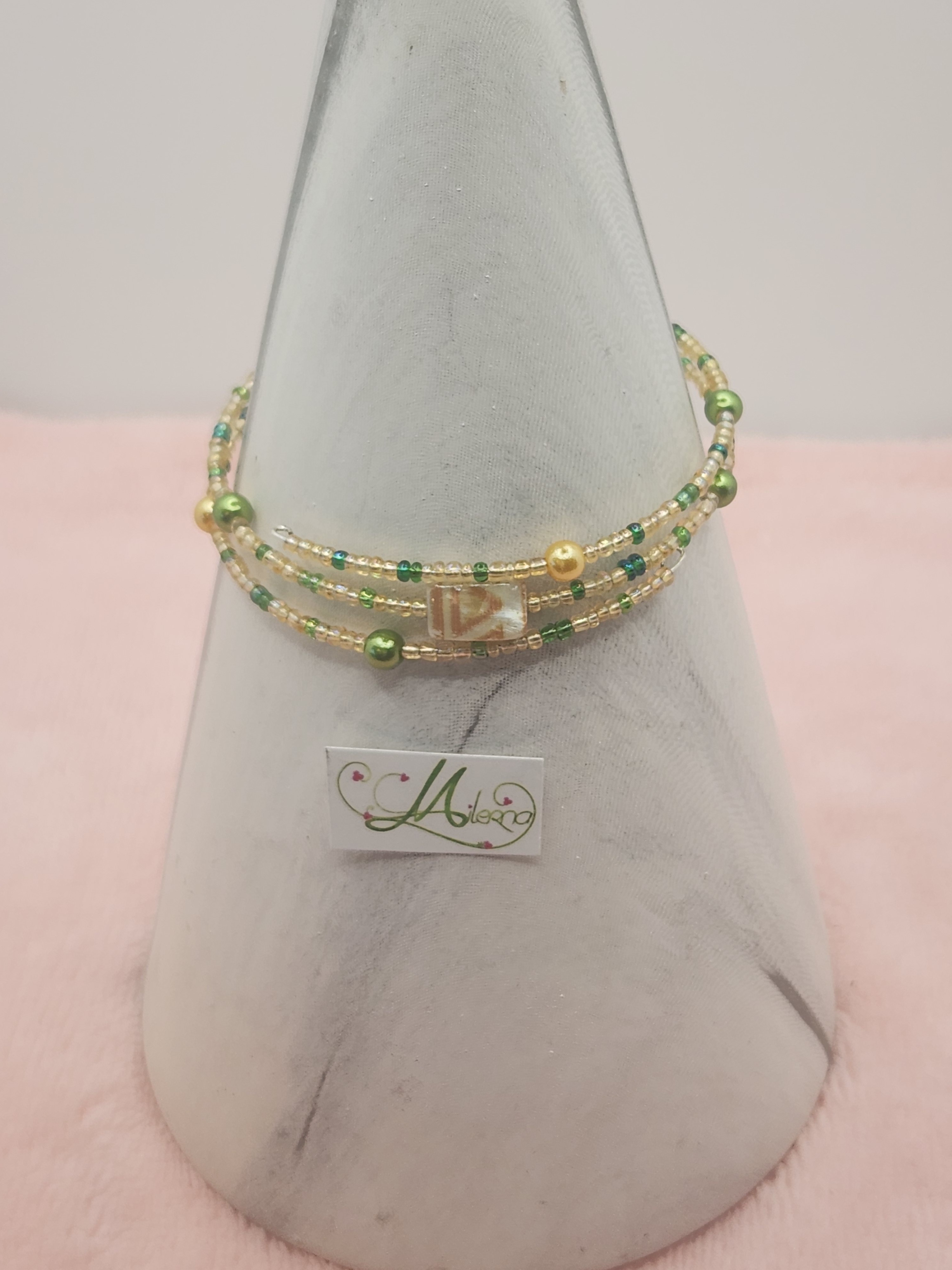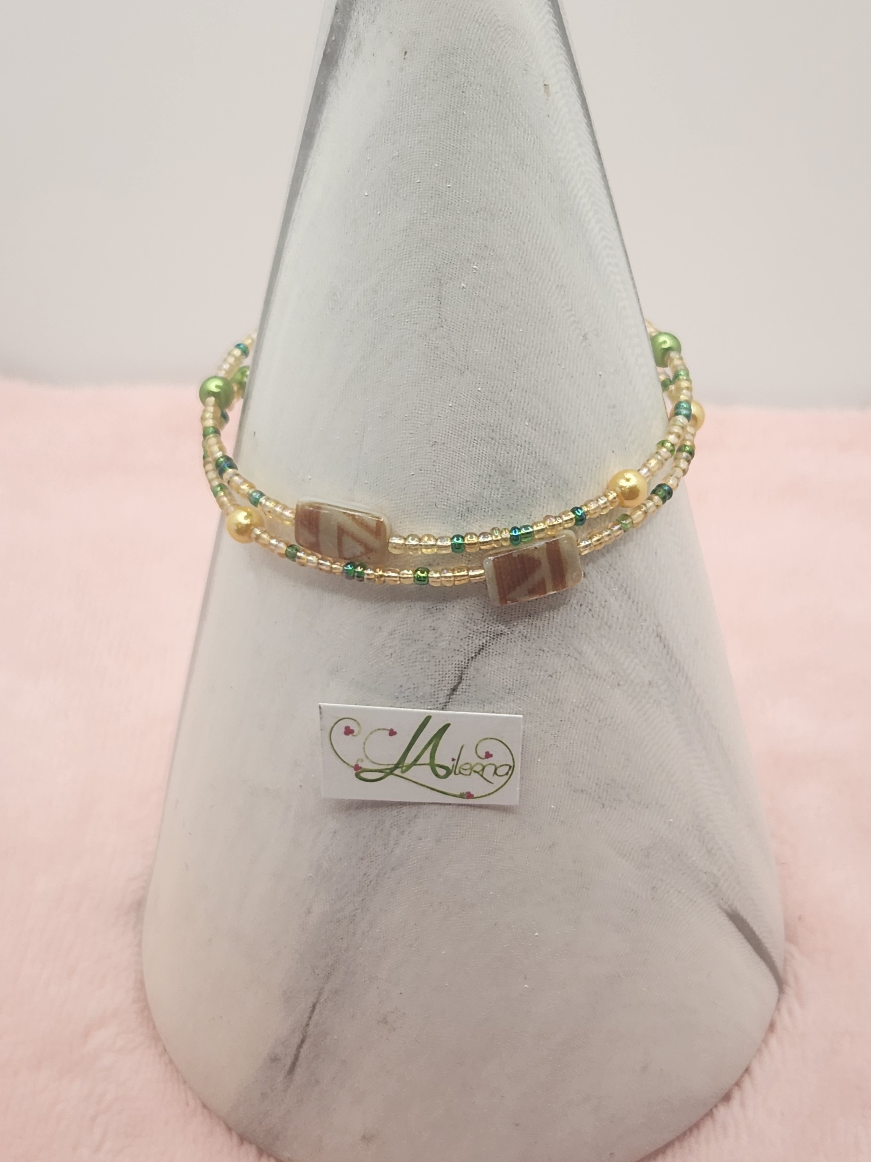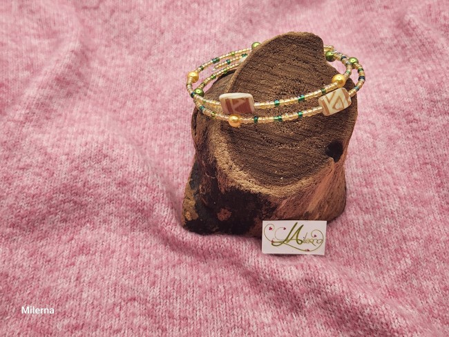 Il se compose de perles dans les tons de crème et de vert, avec 3 perles plates en nacre à motif.
