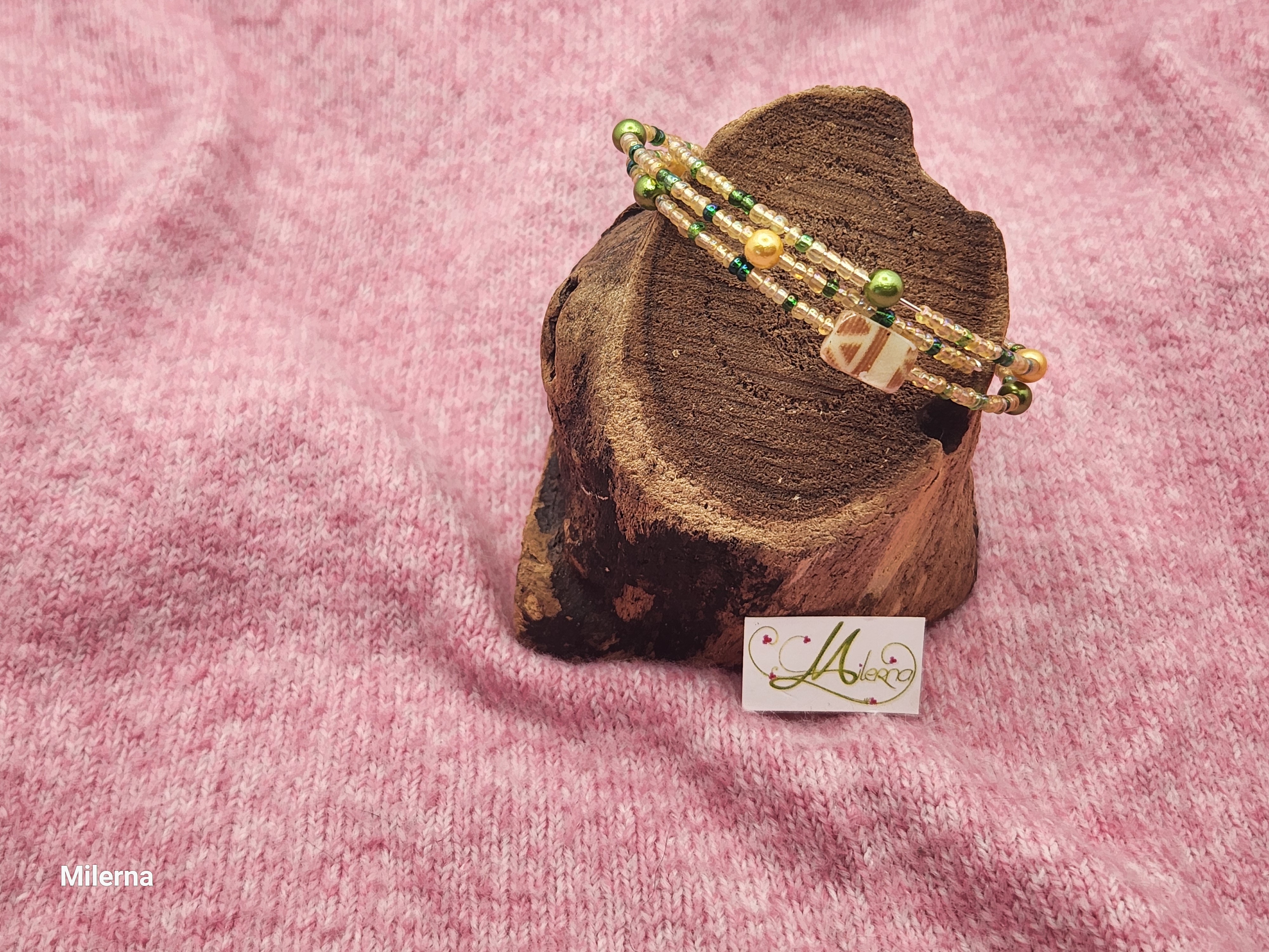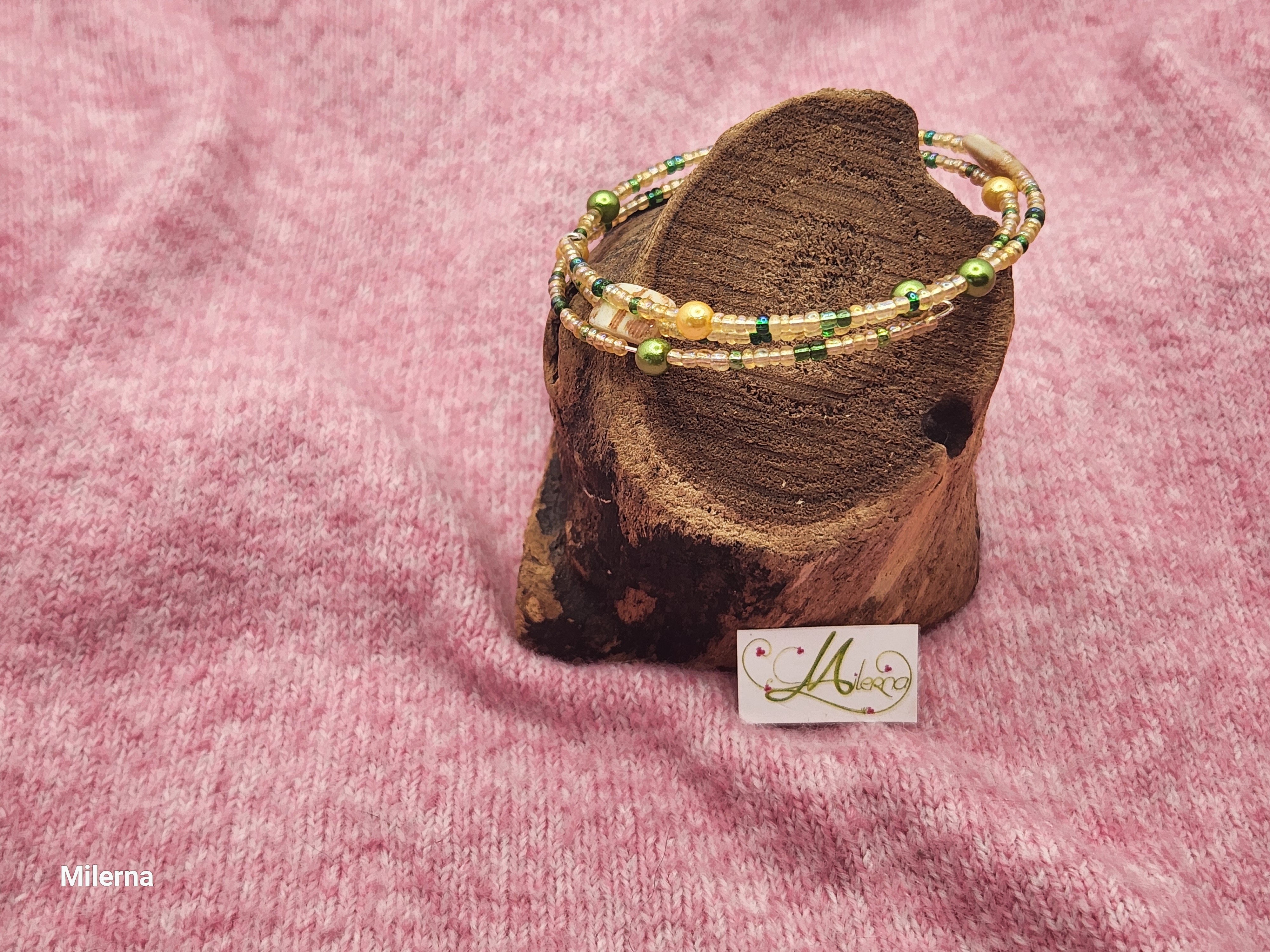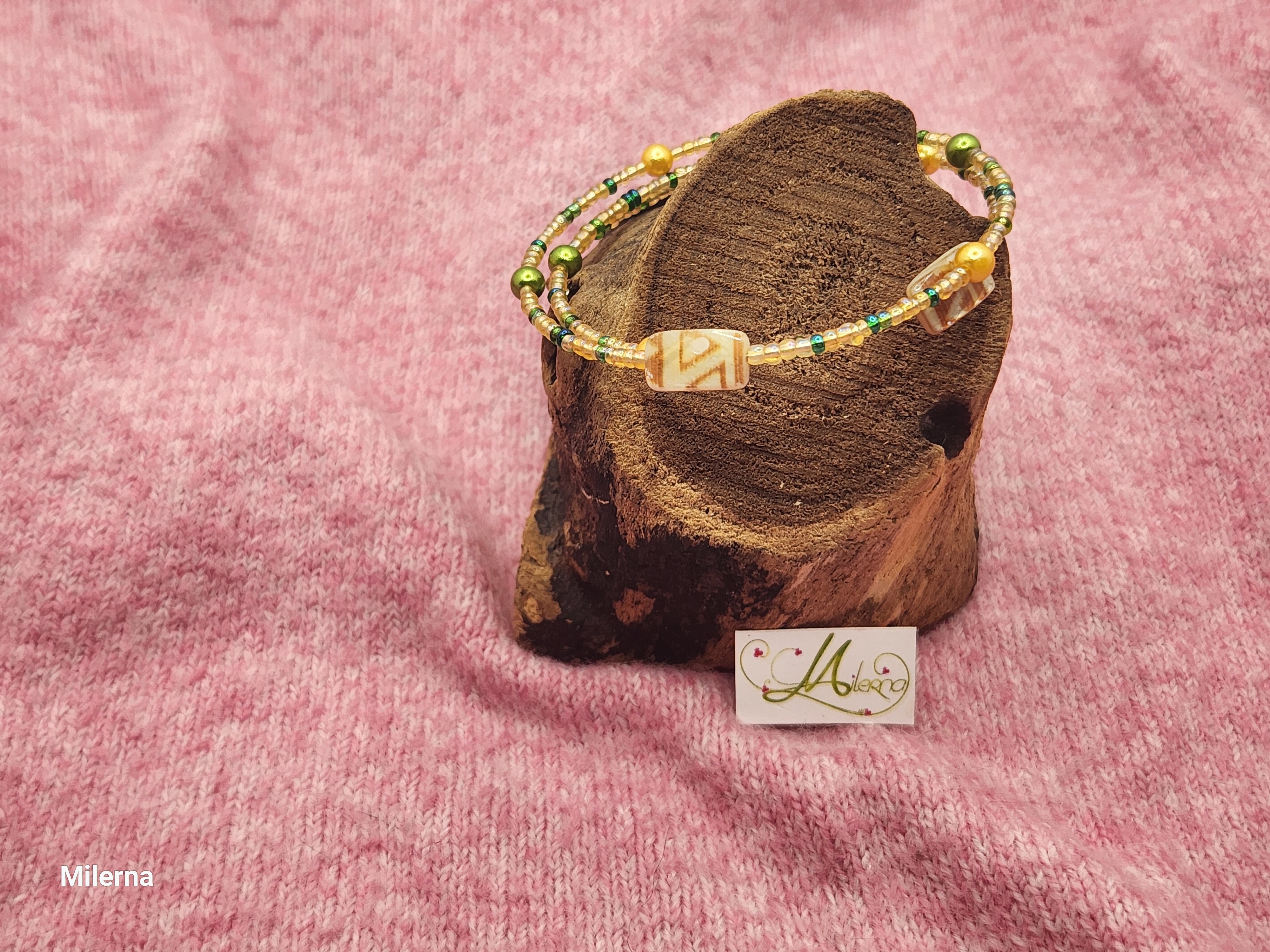 Il se compose de perles dans les tons de crème et de vert, avec 3 perles plates en nacre à motif.