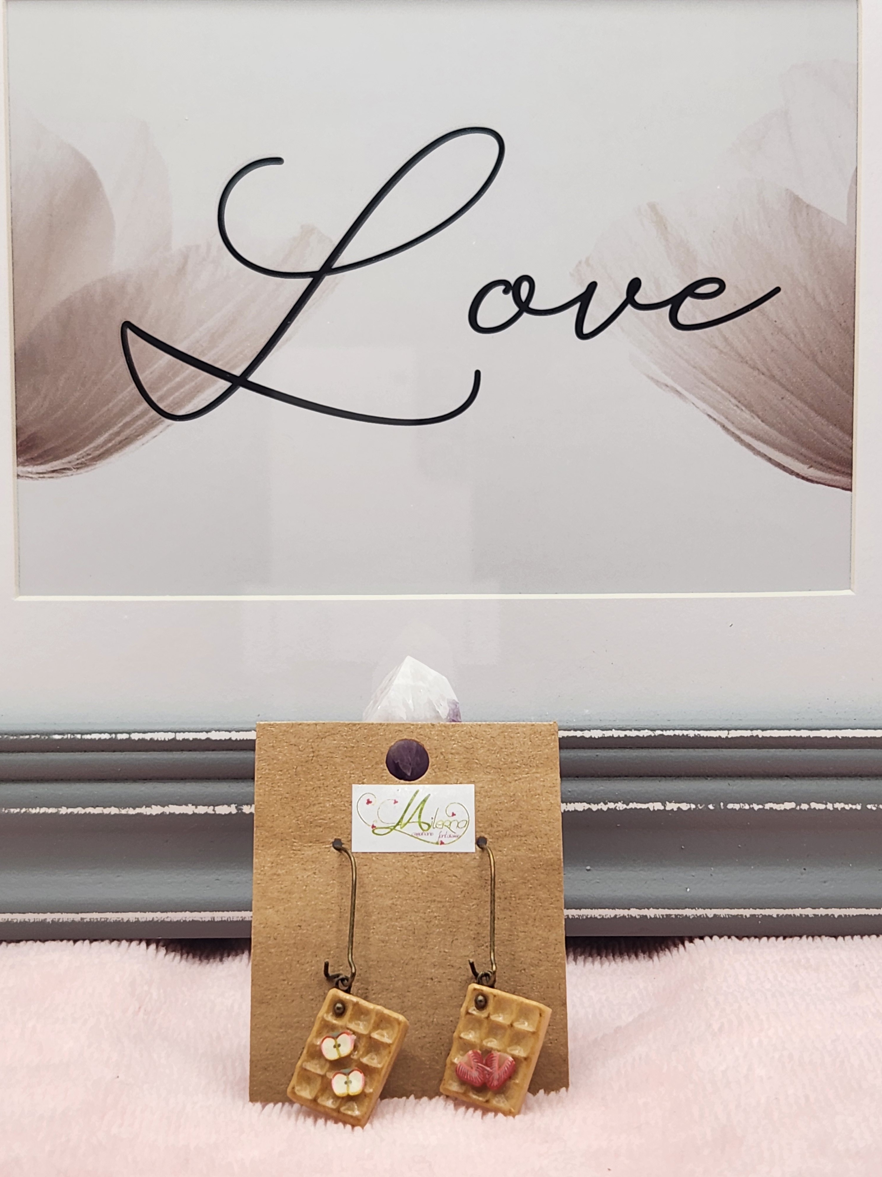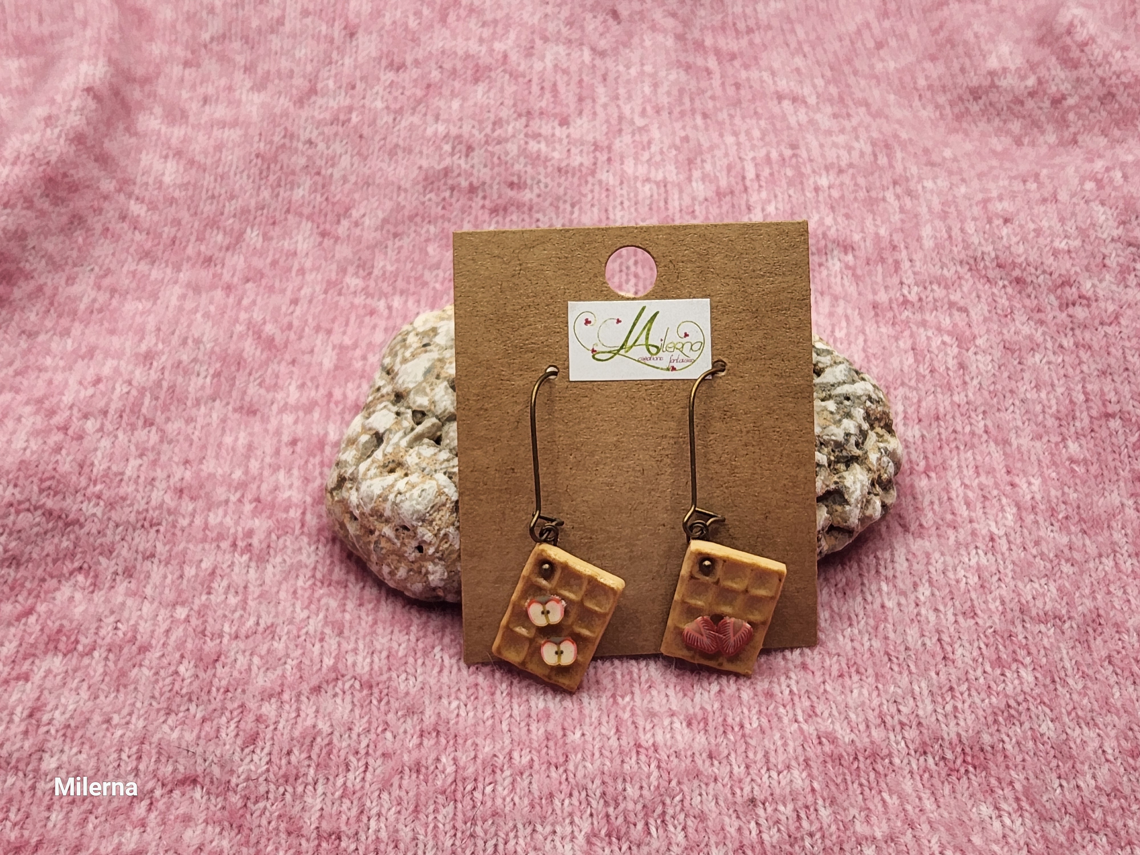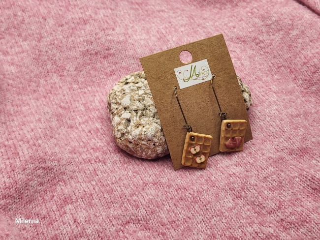 Boucles d'oreilles gaufre gourmande en polymère, avec deux tranches de pommes et deux tranches de fraise.