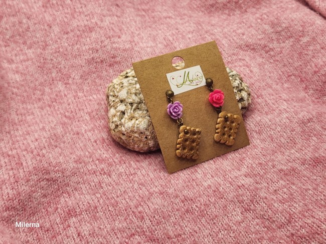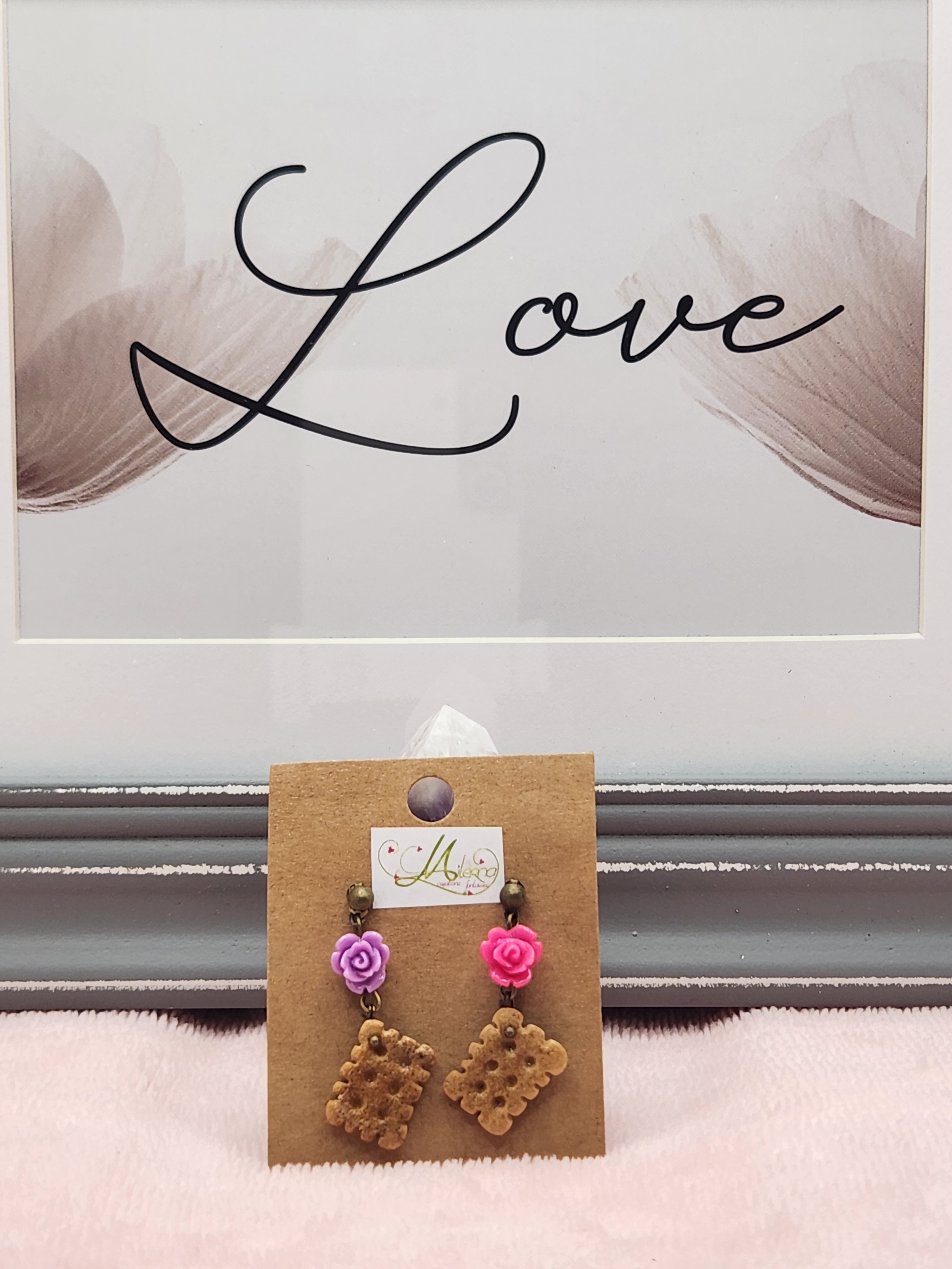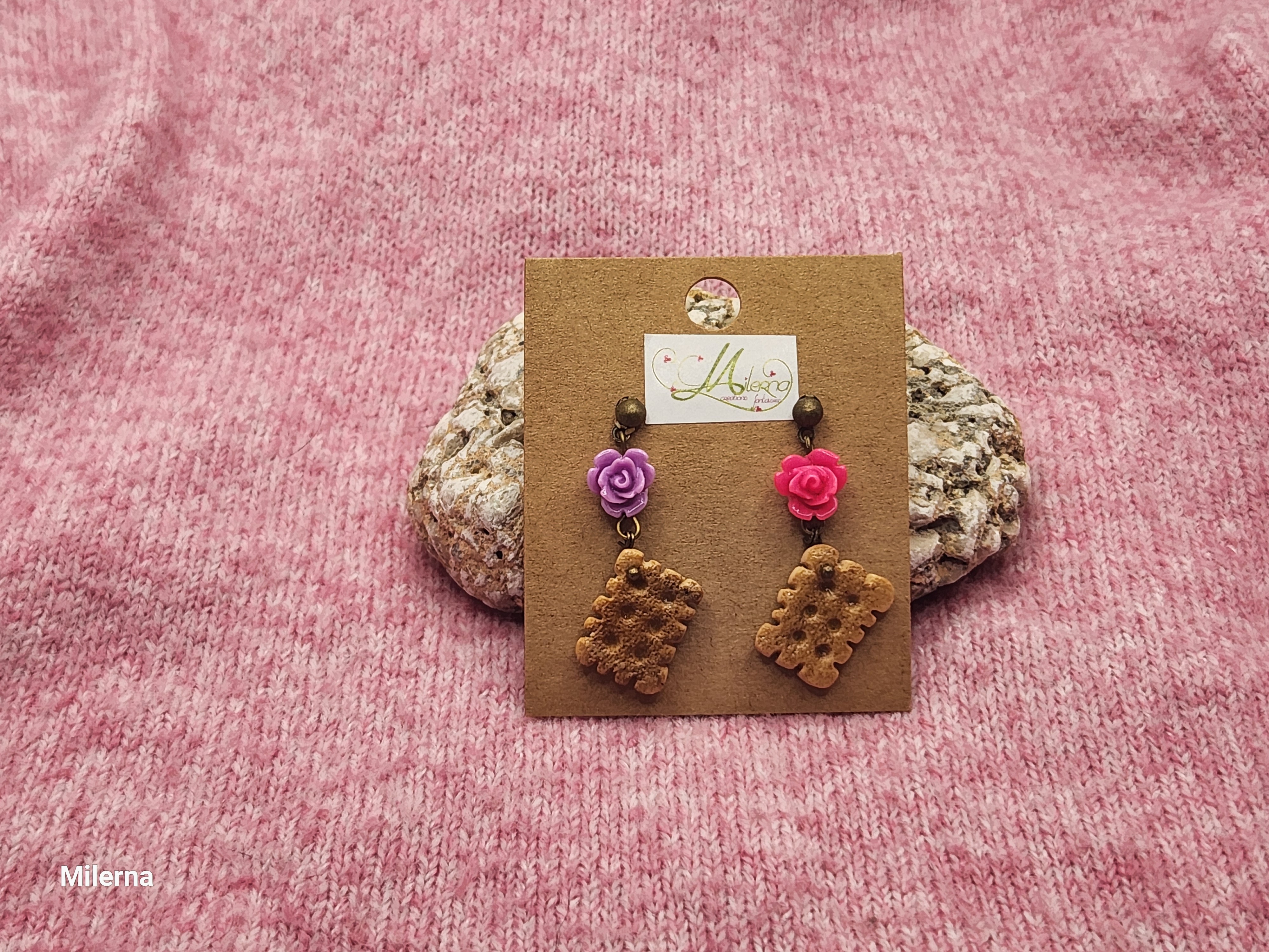 Boucles d'oreilles petit biscuit gourmand en polymère, avec des perles fleurs rose et violette.
