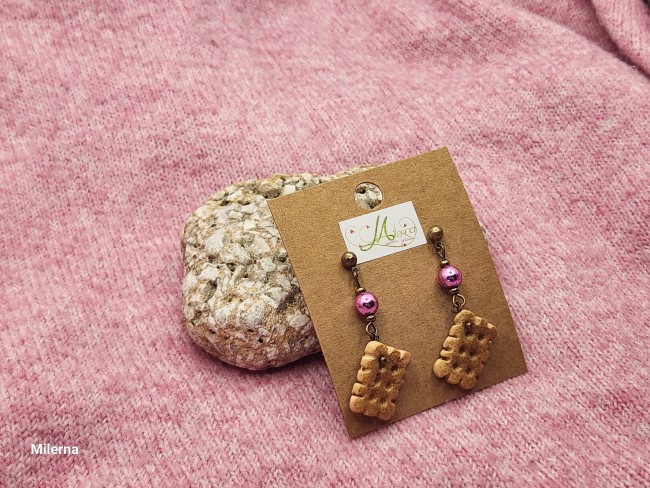 Boucles d'oreilles petit biscuit gourmand en polymère, avec des perles roses.