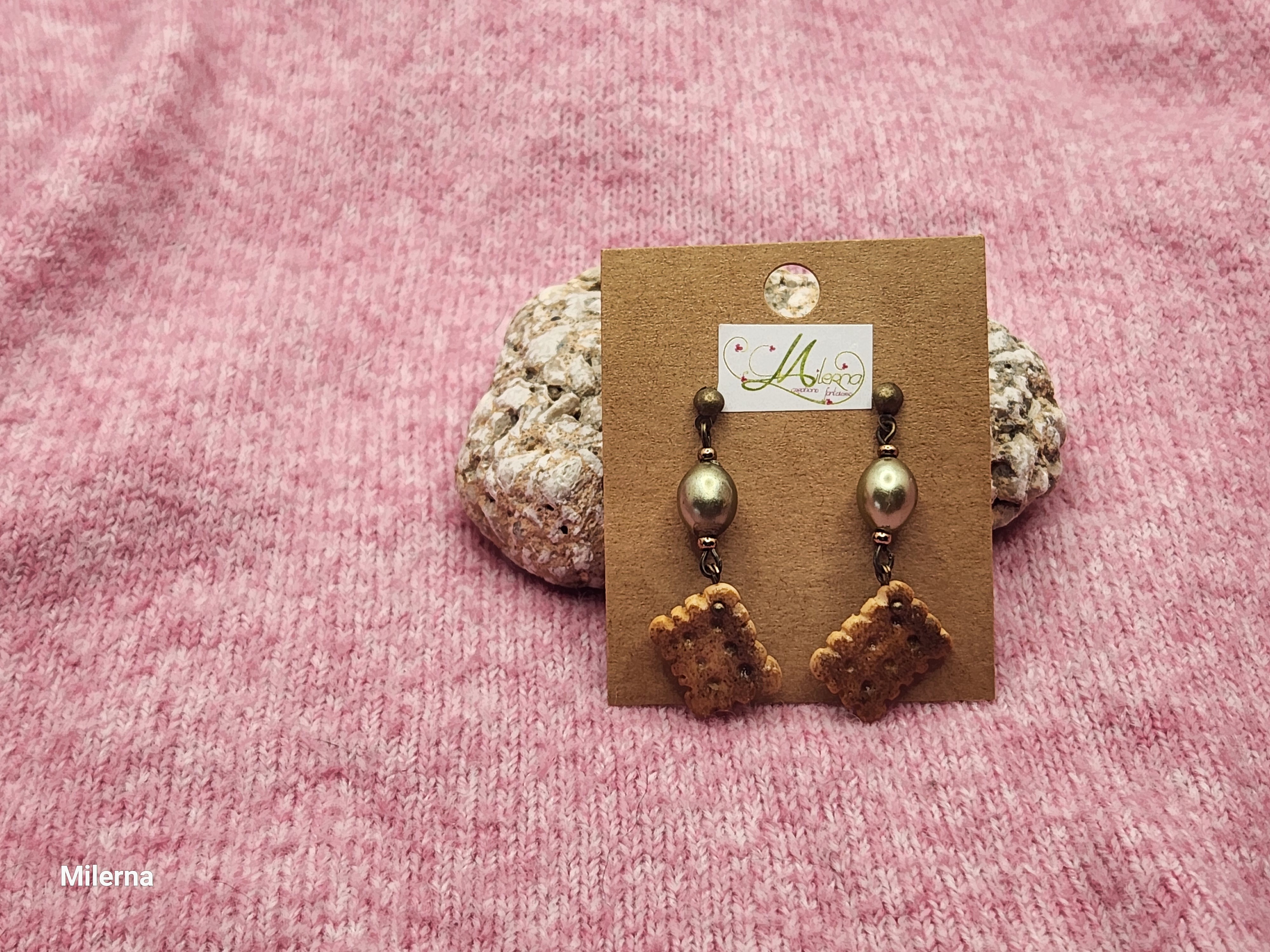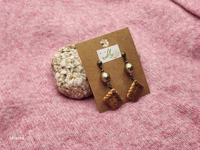 Boucles d'oreilles petit biscuit gourmand en polymère, avec des perles dorées.