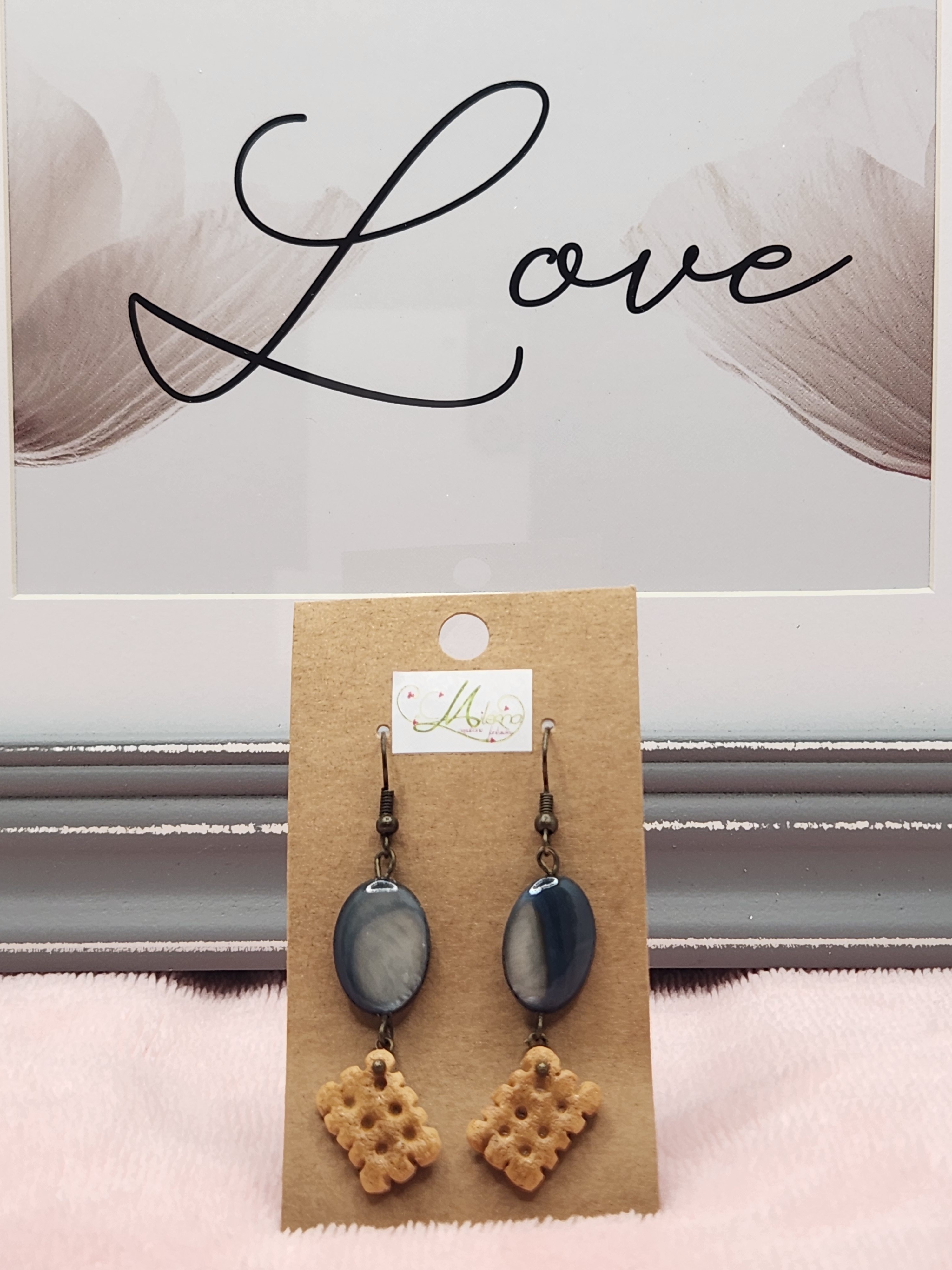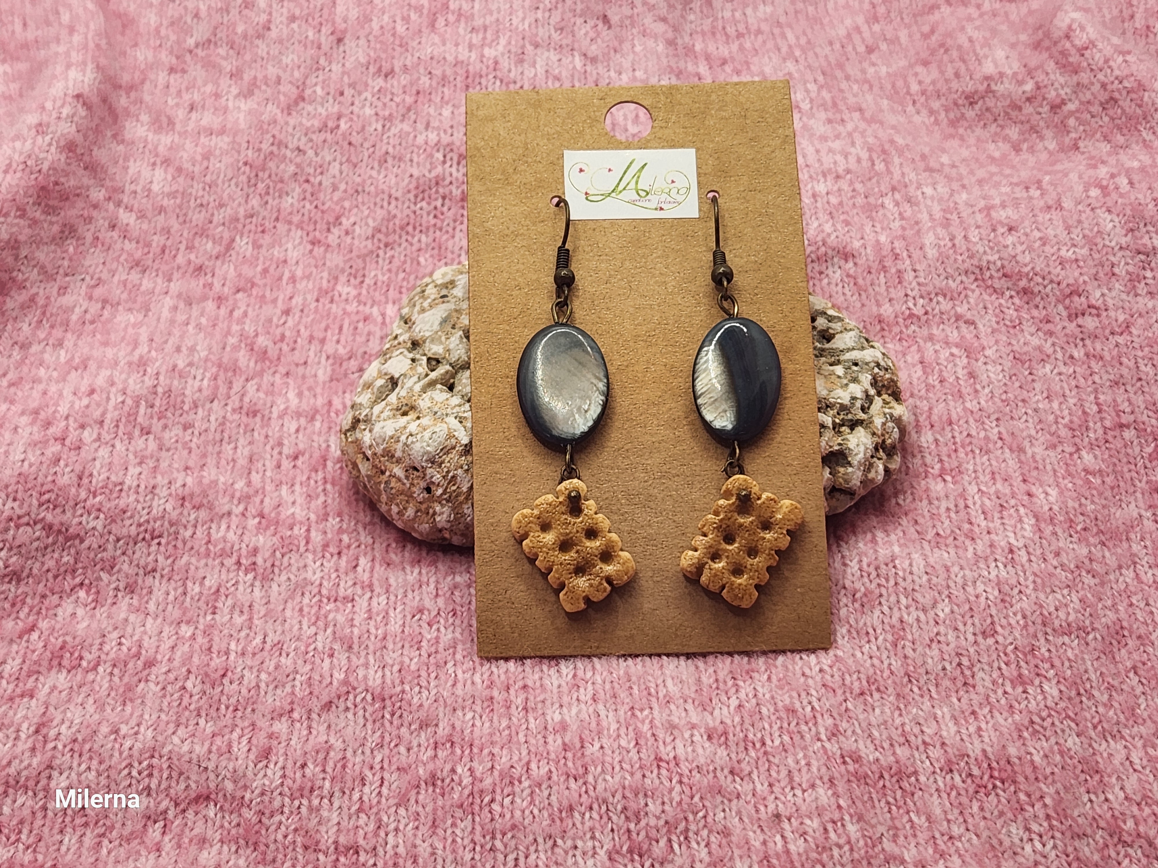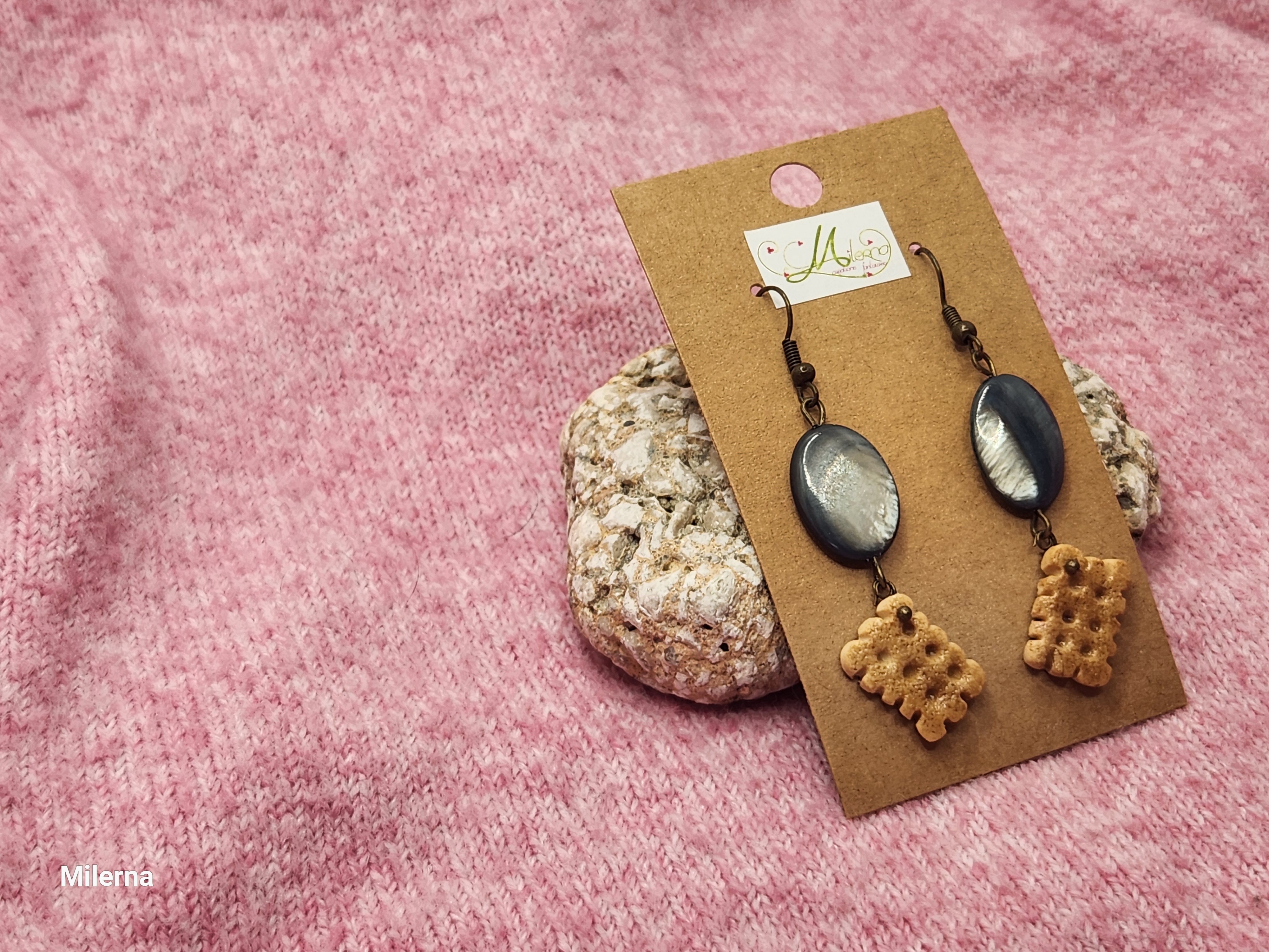 Boucles d'oreilles petit biscuit gourmand en polymère, avec des perles nacrées bleues/grises.