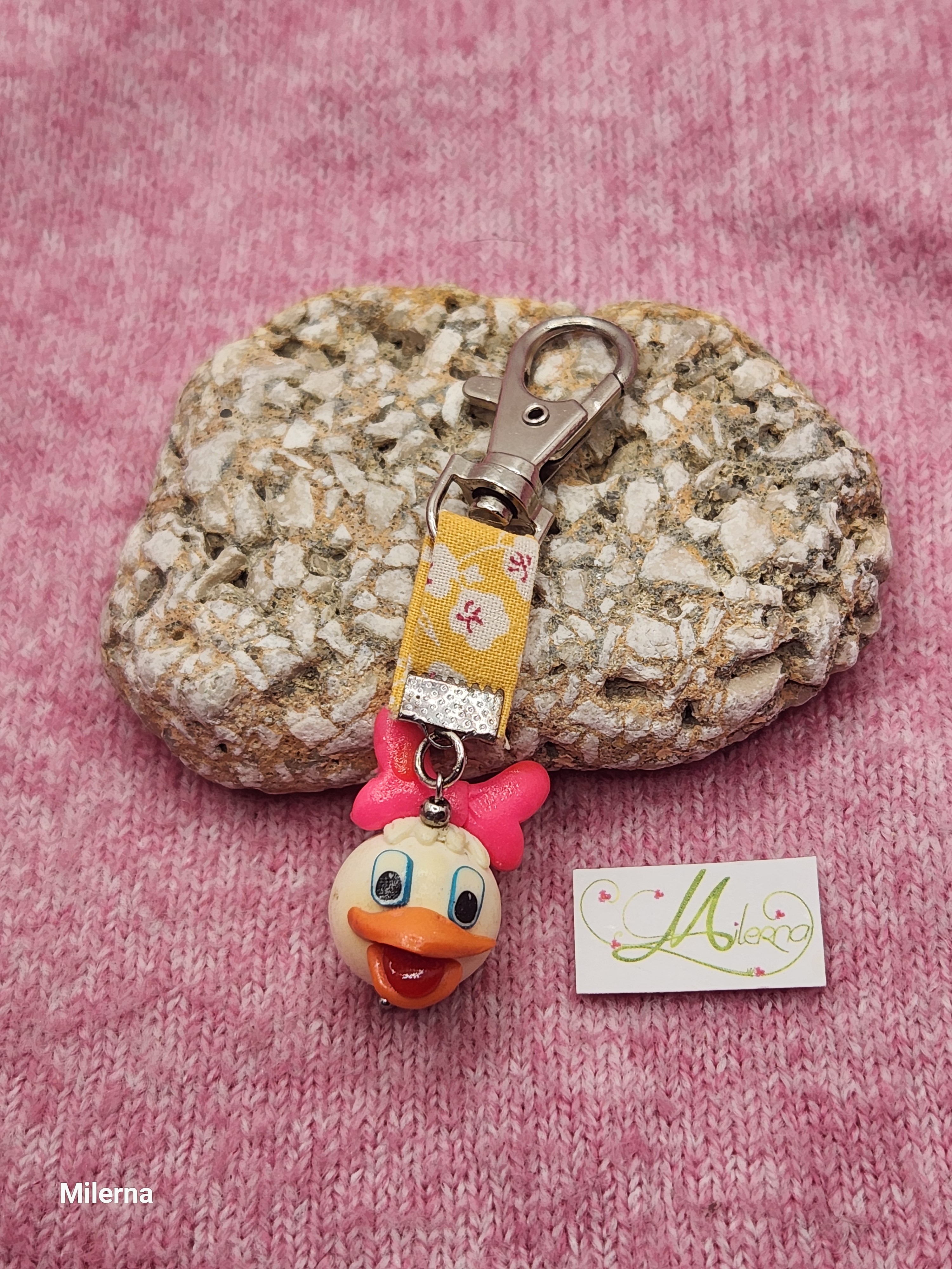 Je vous propose ce porte clefs célébre petit canard en métal fantaisie argenté et tissu liberty jaune.