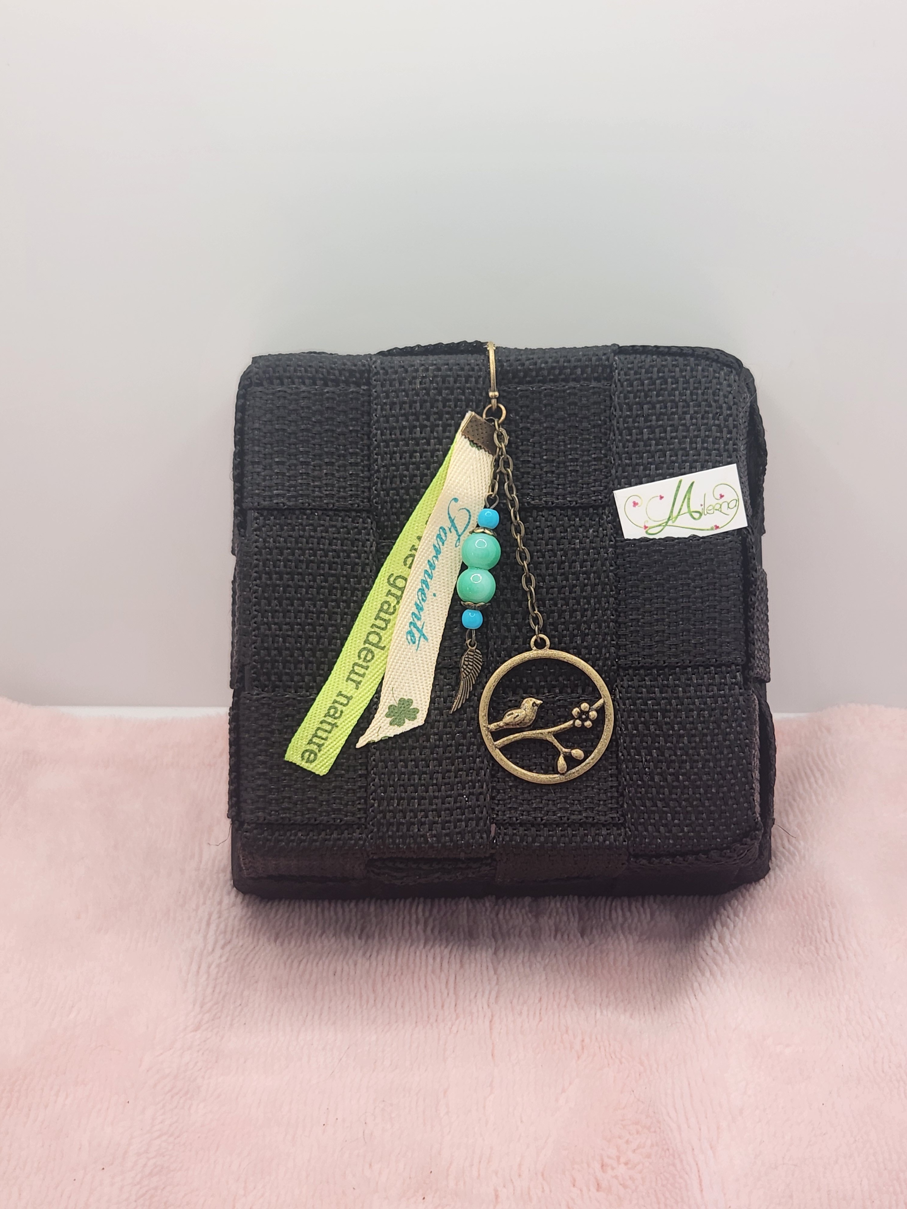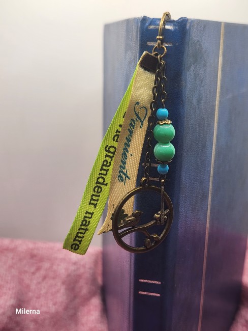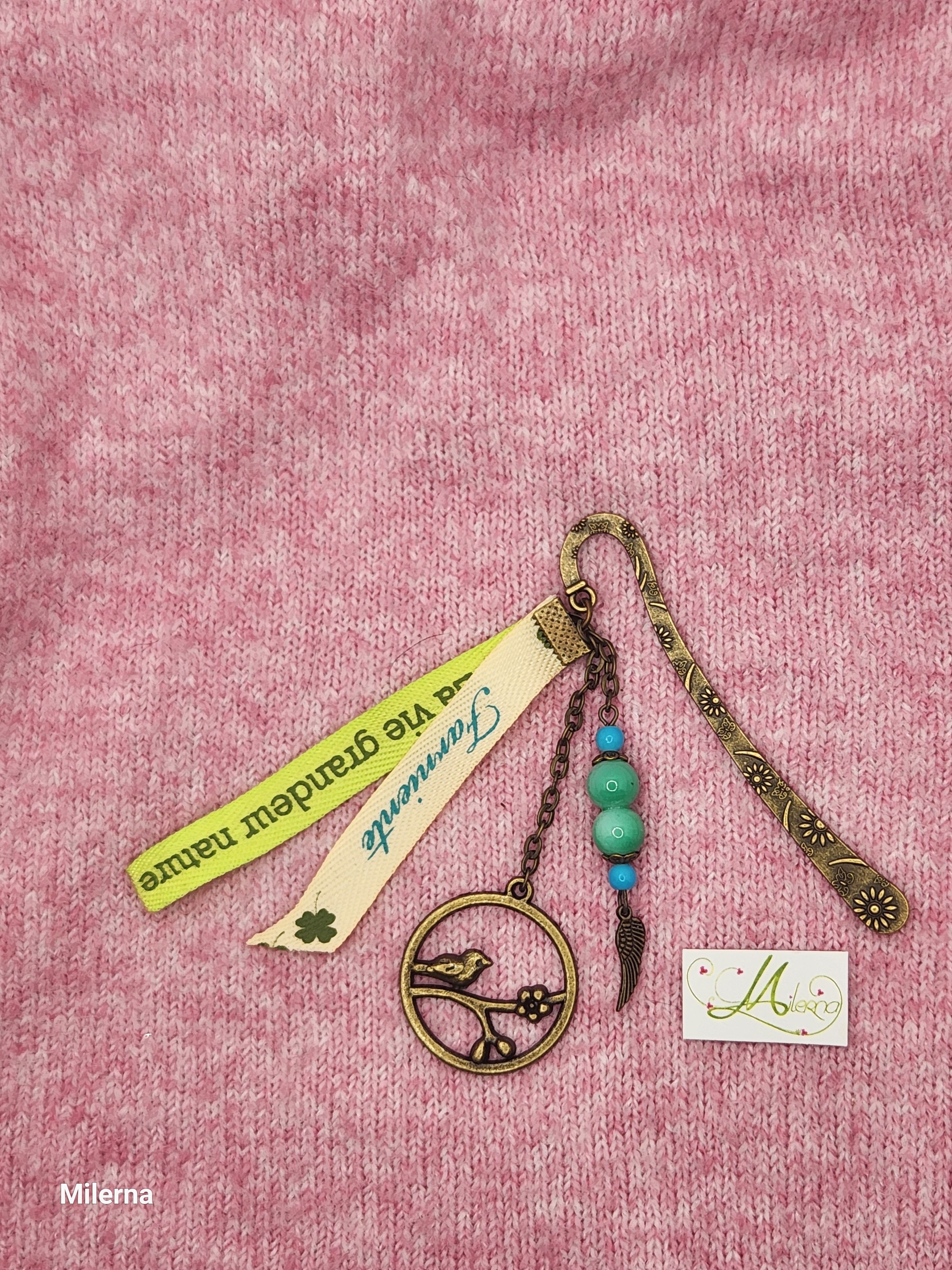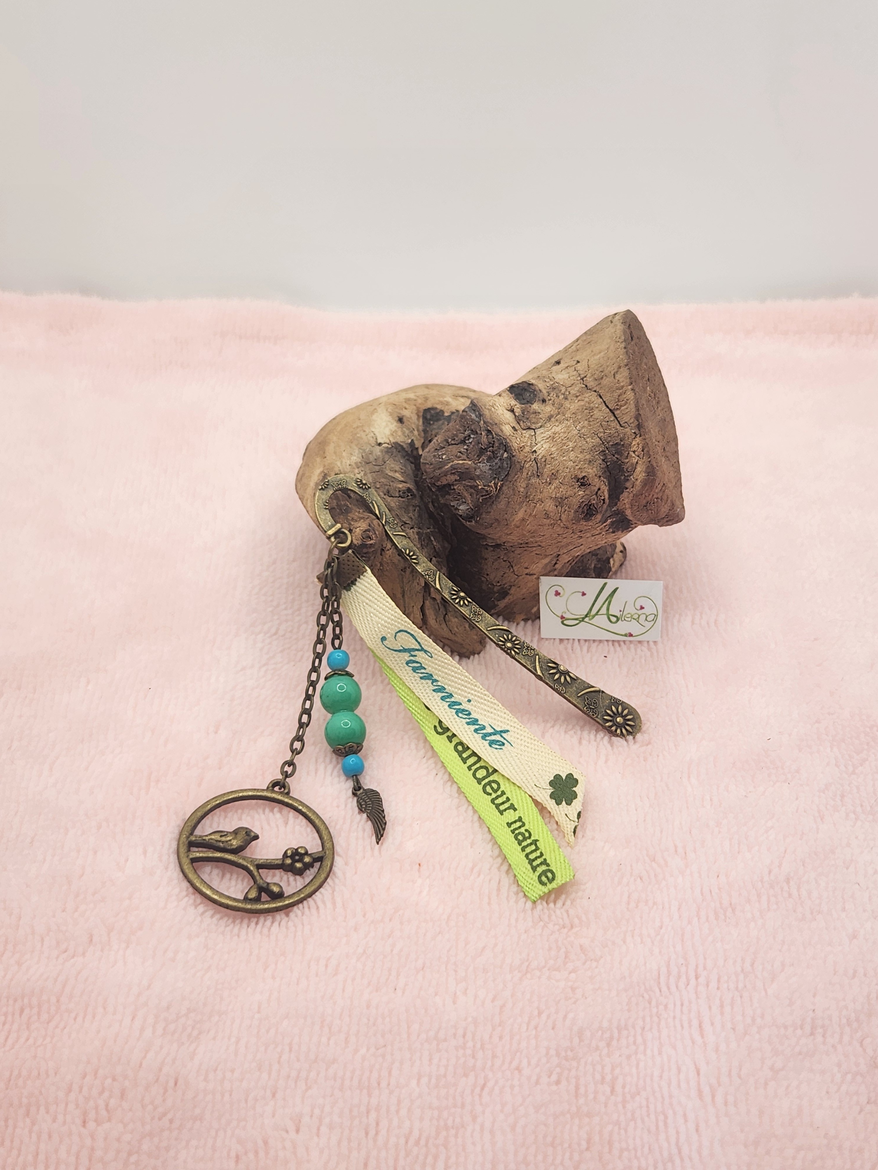 Il est composé de perles vertes et bleues et oiseau sur la branche en bronze et rubans "farniente et La vie grandeur nature".