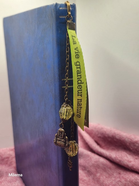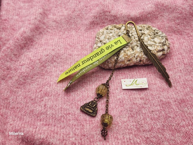 Il est composé d'un Bouddha en bronze, perles vertes, breloque trèfle à 4 feuilles et rubans" La vie grandeur nature et un écrin de verdure".